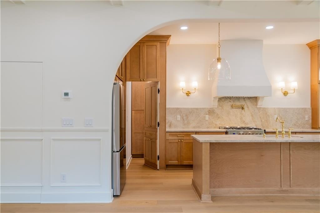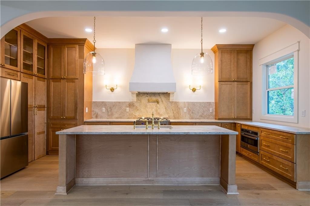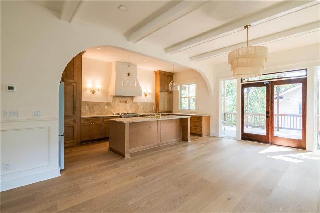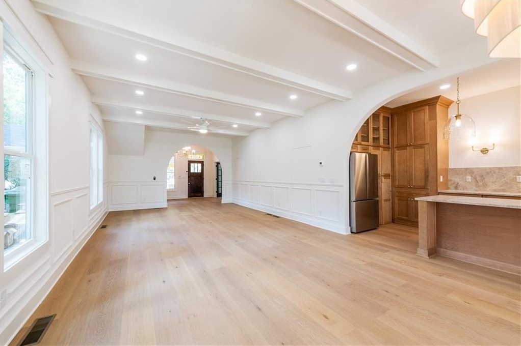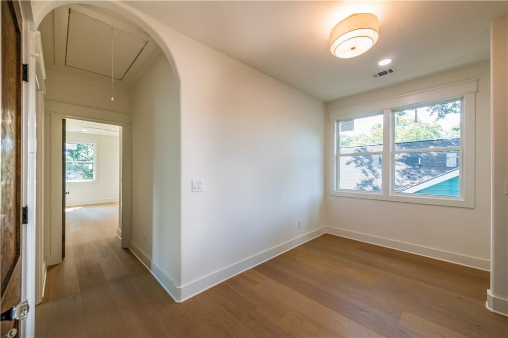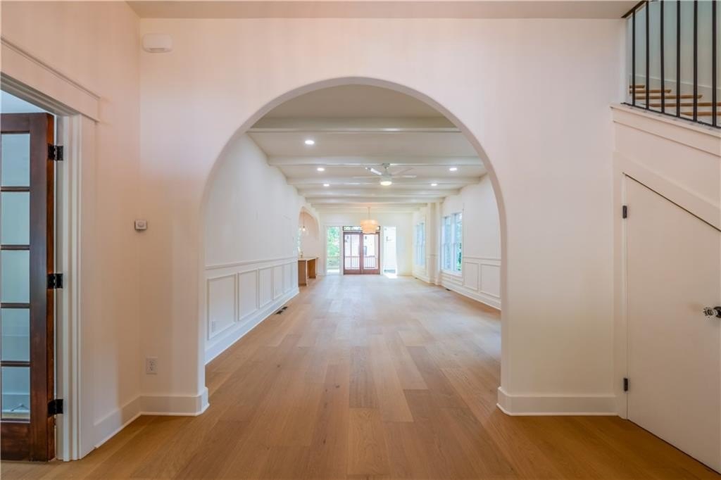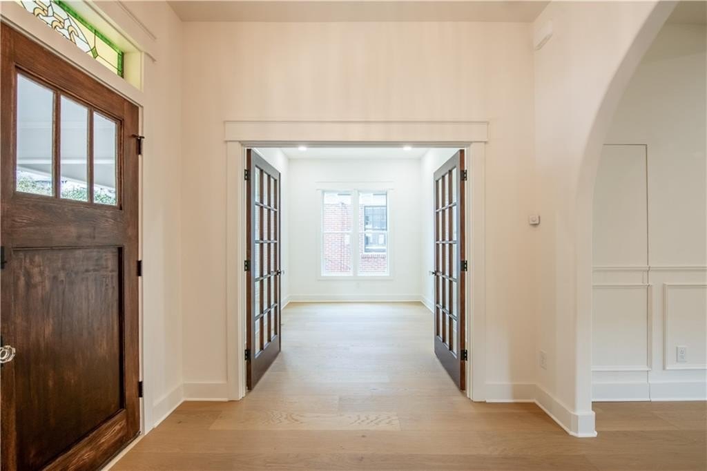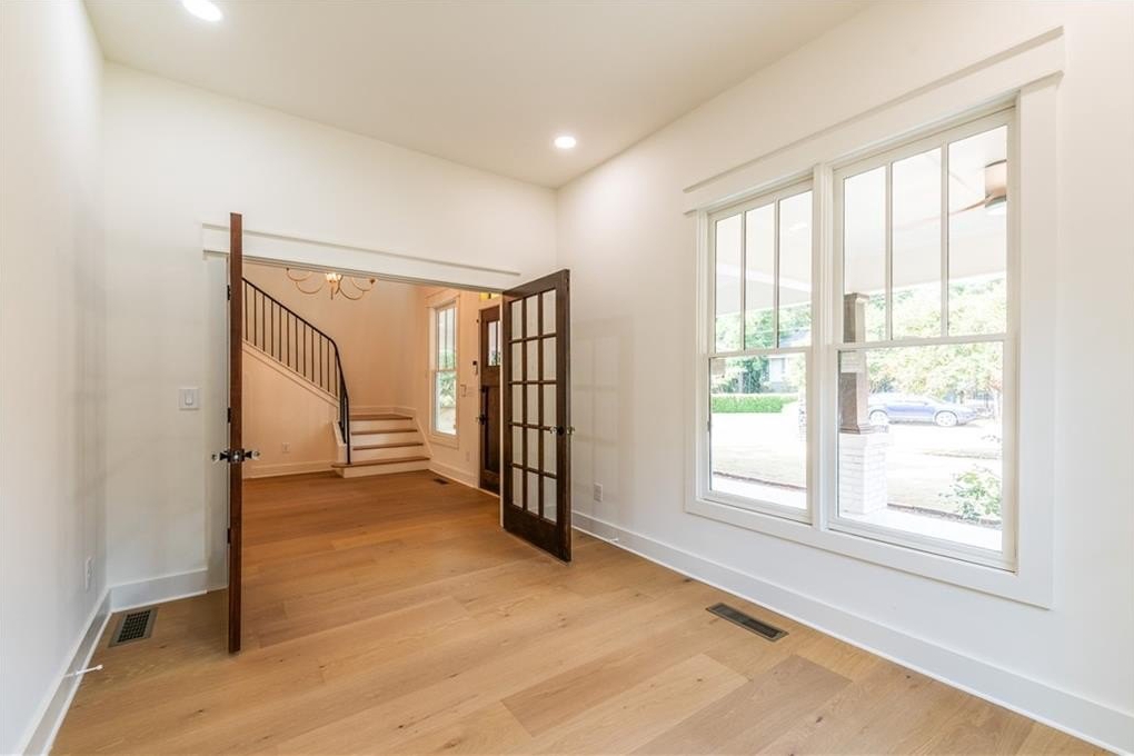 The home was thoughtfully developed by a locally owned design & build team. Its design pays homage to the historic character of the neighborhood and the original home on the lot by incorporating historic architectural elements such as 100-year-old heart pine interior doors, stained glass transoms, pocket doors, and graceful arched entryways.