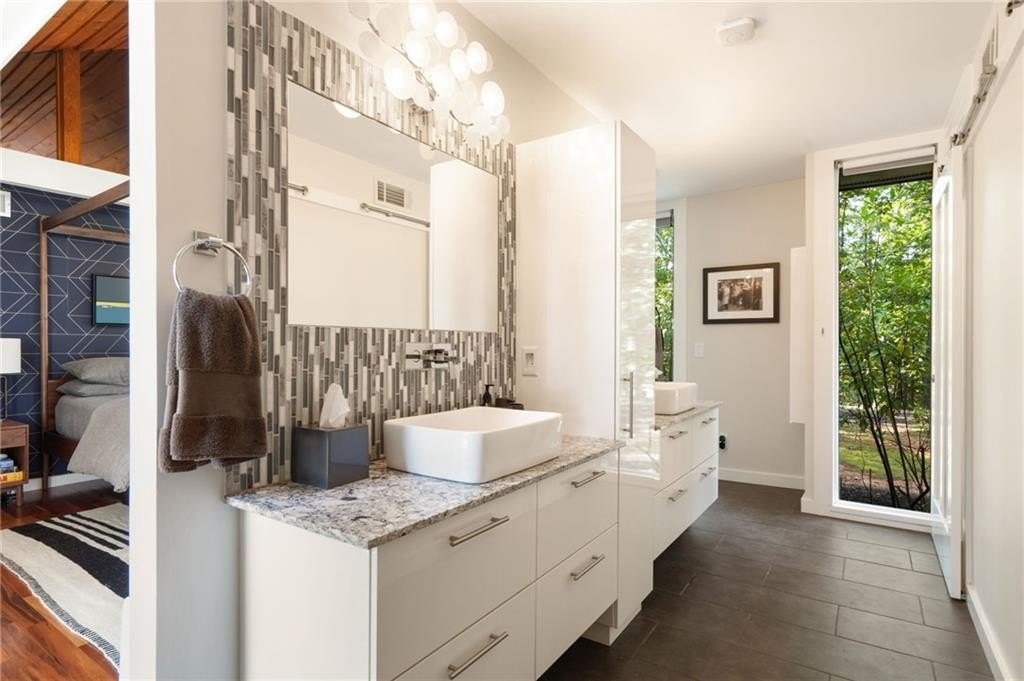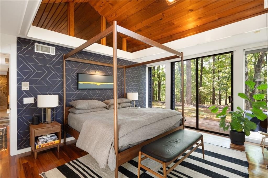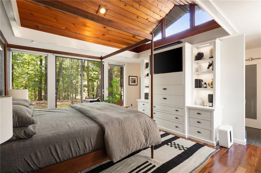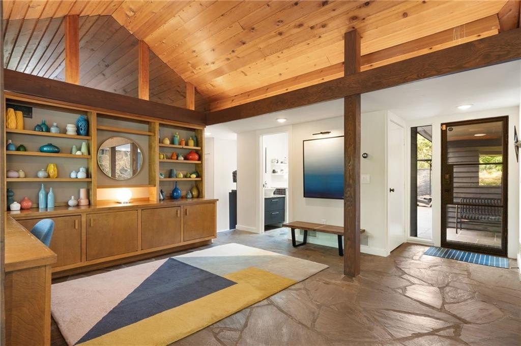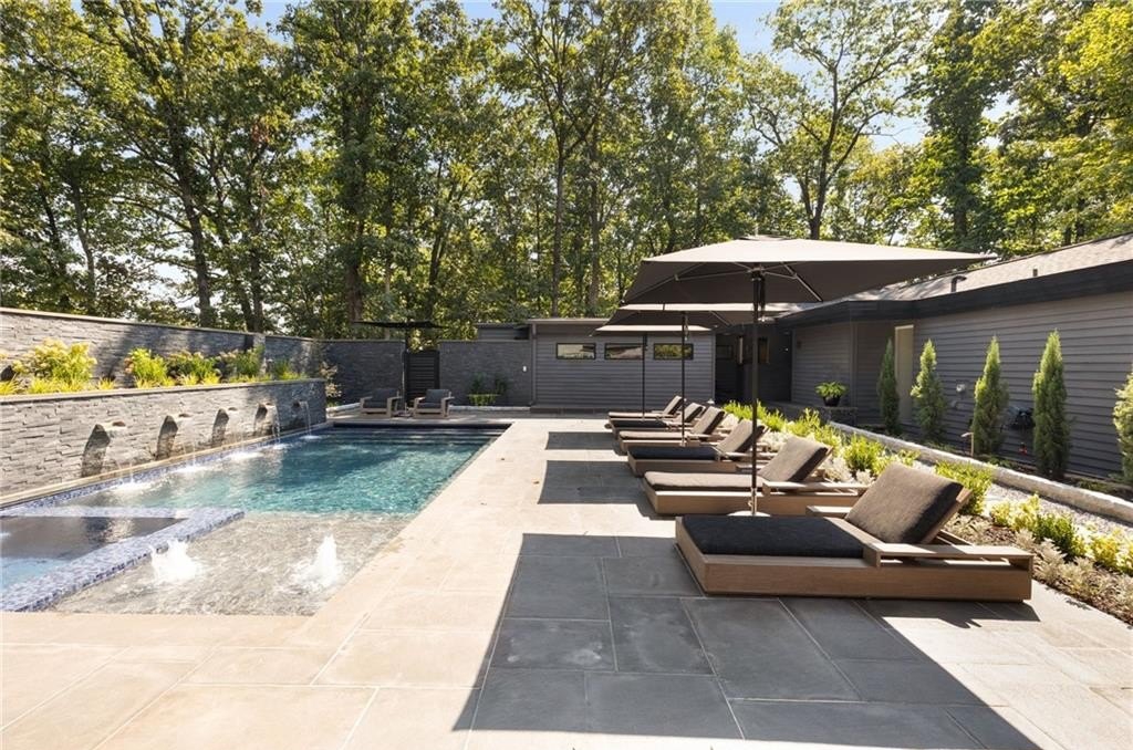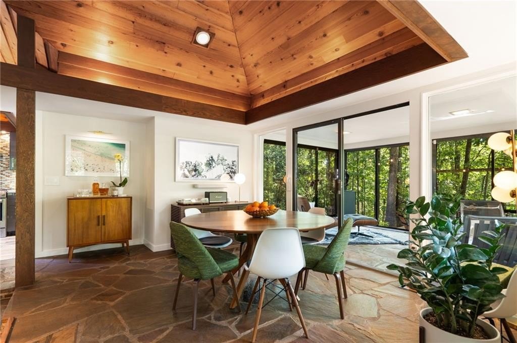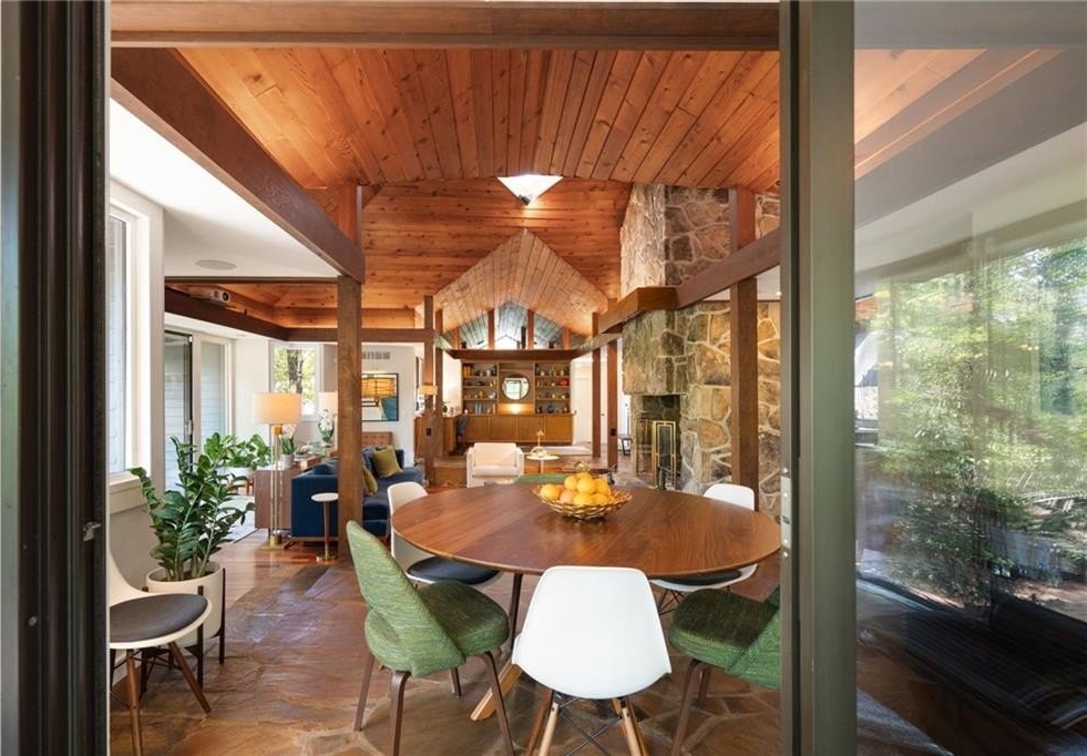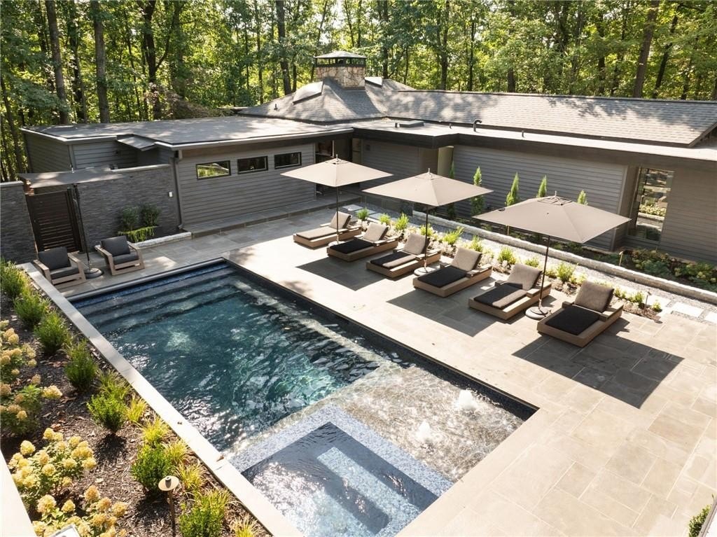 Designed by Robert Green, a noted apprentice of Frank Lloyd Wright, this midcentury masterpiece seamlessly blends organic architecture with modern luxury. Signature elements—vaulted tongue-and-groove ceilings, walls of glass, and a dramatic fieldstone fireplace—create a timeless connection to nature, with multiple decks and sliding doors opening the home to its wooded, one-acre hilltop setting. This property has been recently enhanced with a backyard transformation featuring a heated pool and spa with water features, a remote-controlled cover, and built-in Sonos sound for resort-style entertaining. The expansive five-car garage is equipped with EV charging, while smart home systems provide phone-controlled automation of lighting, sound, pool/spa, irrigation, security, and HVAC. Recent upgrades include a new tankless water heater, whole-house AV system with retractable projection screen, LED perimeter lighting, Lutron controls, encapsulated crawl space, and an overhauled HVAC system with HEPA filtration and dehumidifier. Professionally installed exterior lighting, sealed decks, and a propane fire-pit add to the home’s ambiance. Offering resort-style living every day, this rare Robert Green residence combines architectural pedigree with modern amenities—all just minutes from I-285, top-rated local schools, shopping, and dining.