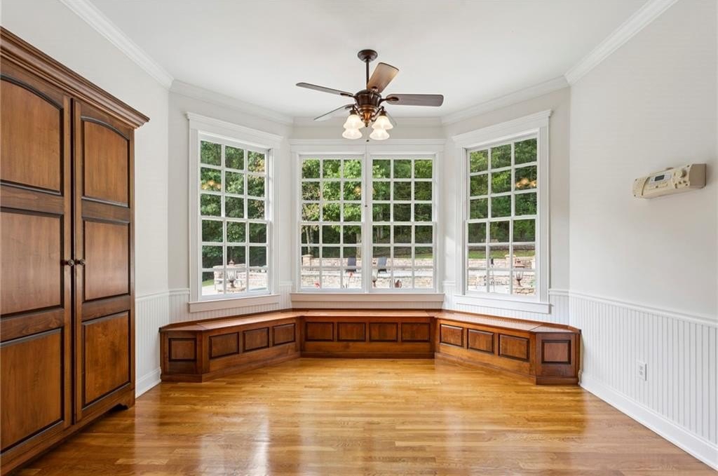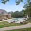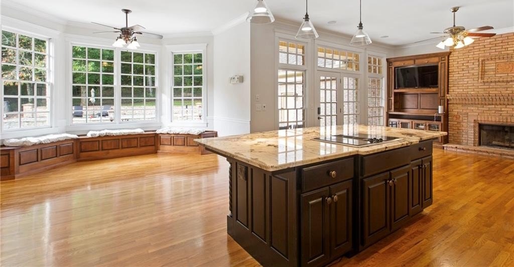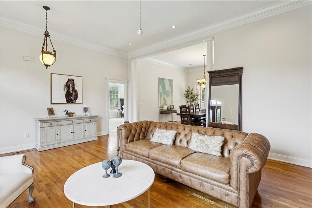 The formal living room seamlessly flows into the dining area, while the open-concept eat-in kitchen, equipped with Jenn Air appliances, connects to a family room/den adorned with custom cabinetry and a charming brick fireplace. Abundant natural light floods the main level through large windows that showcase views of the backyard patio and pool, while the formal Living Room affords you picturesque long range views of the property pasture.