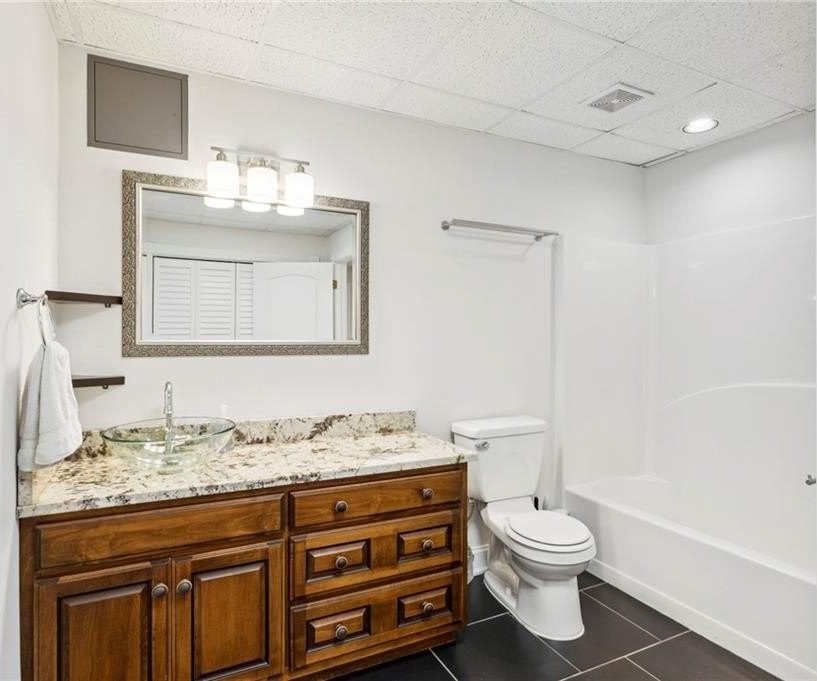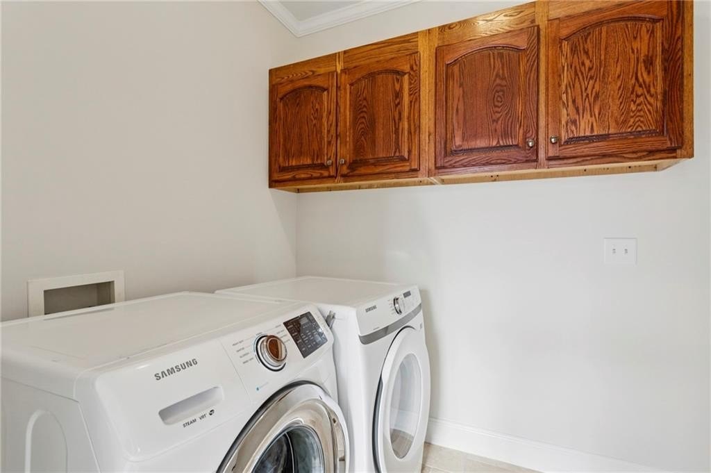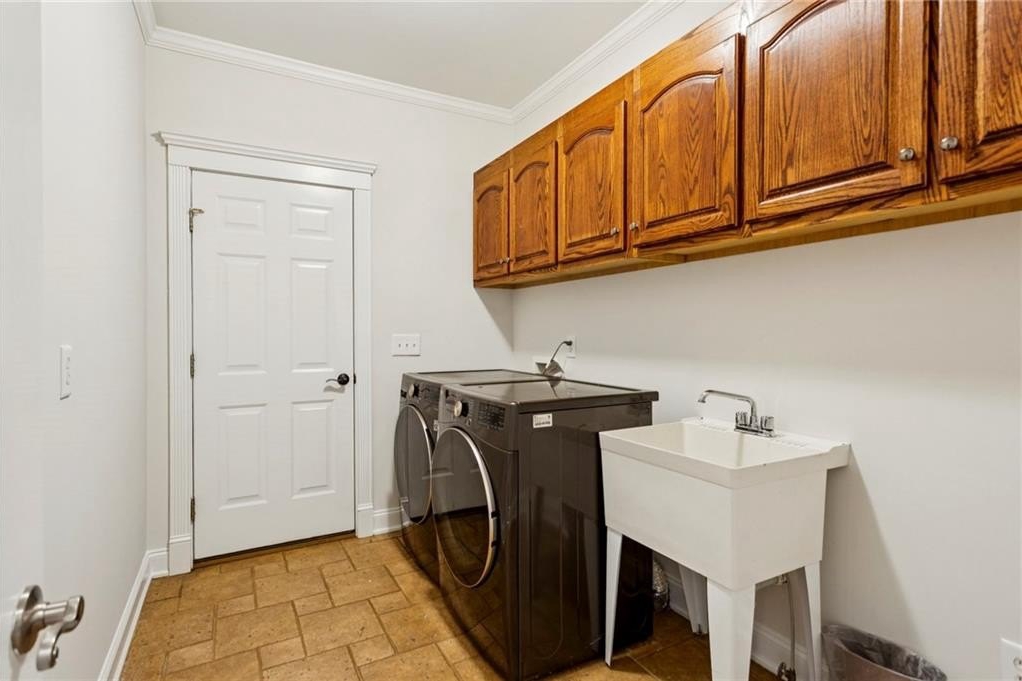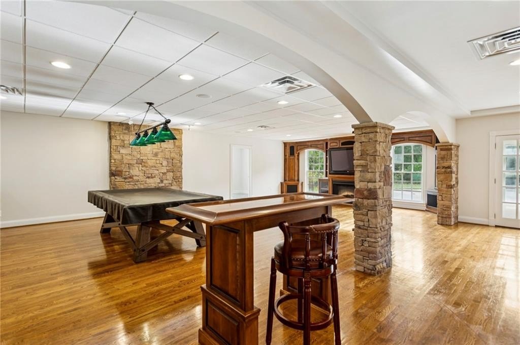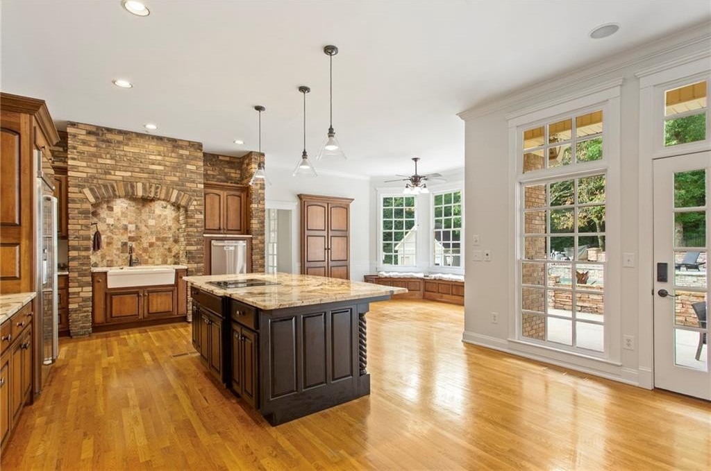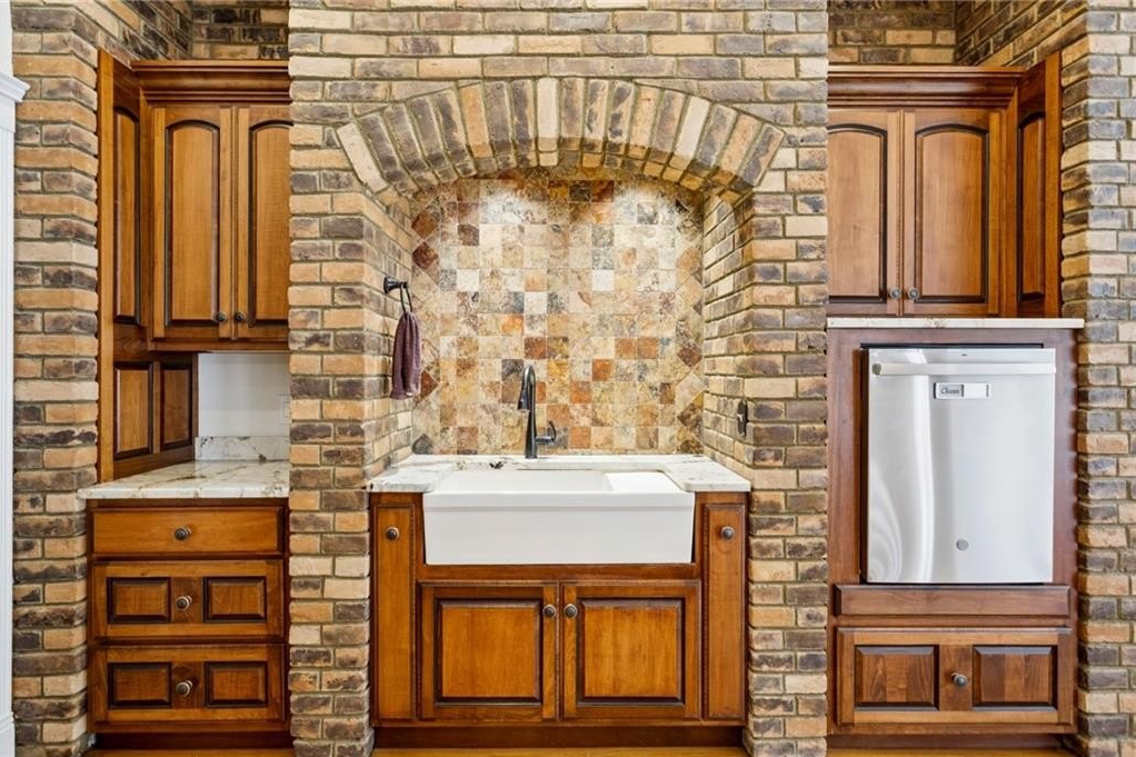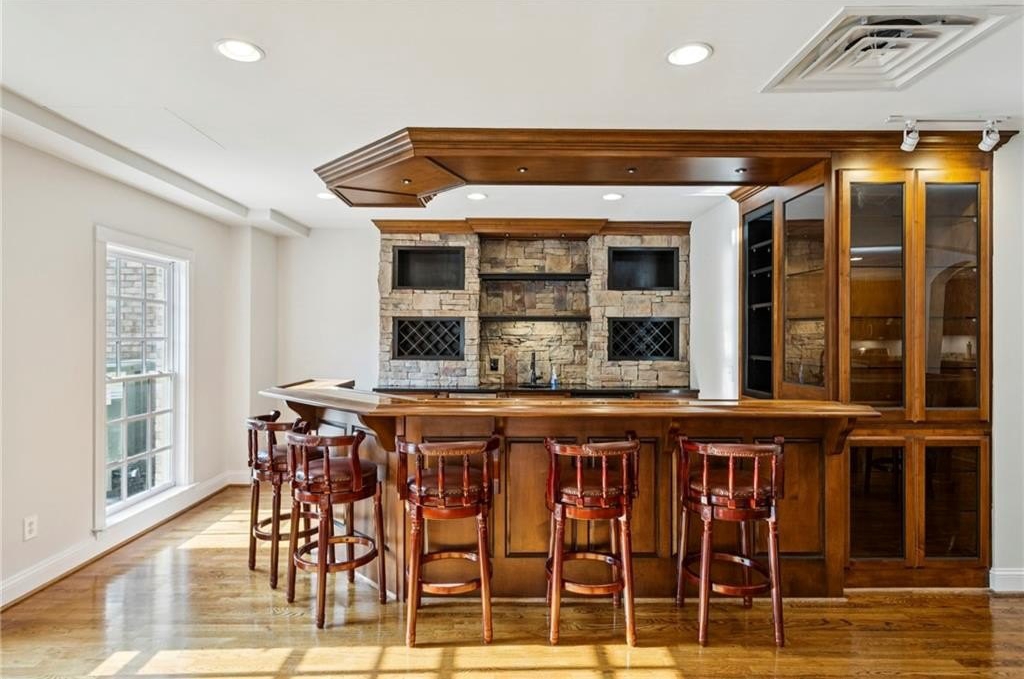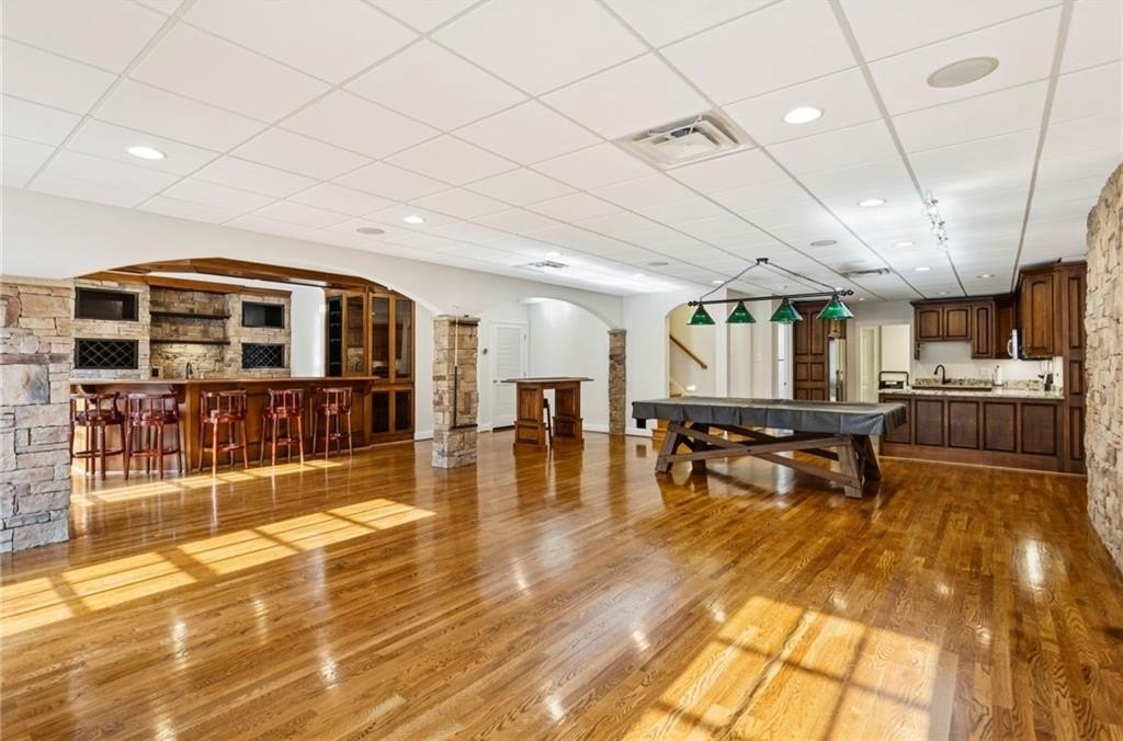 In addition to the primary suite, the main level offers three additional bedrooms—one with an en-suite bathroom and another featuring a Jack-and-Jill setup. The basement boasts hardwood flooring, a full kitchen, an elegantly crafted custom bar, and additional guest room space. Throughout the home, you’ll find exquisite custom cabinetry in the kitchen, den, basement, and all vanities including high end granite tops and hardware.