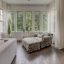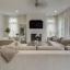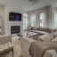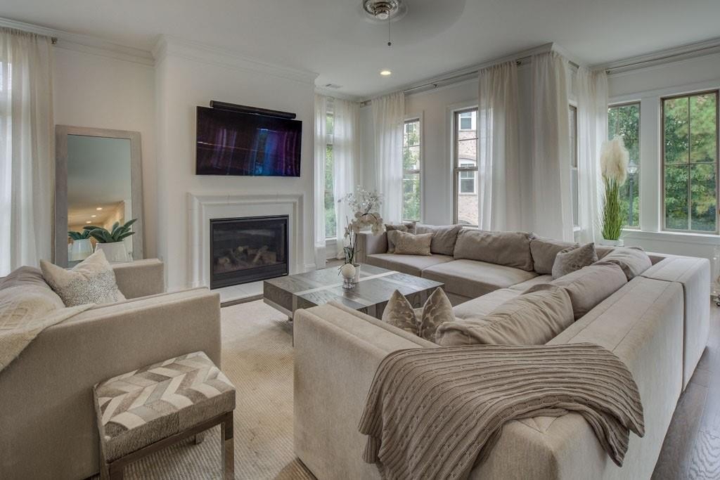 gorgeous limestone fireplace surround and custom drapery and hardware that extend to the ceiling making the