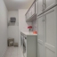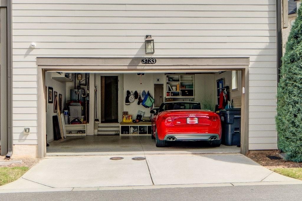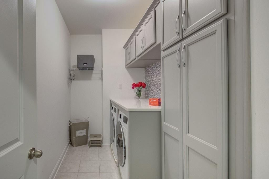 out the top floor is the laundry room with beautiful cabinetry, counter space, and tile backsplash. Two car