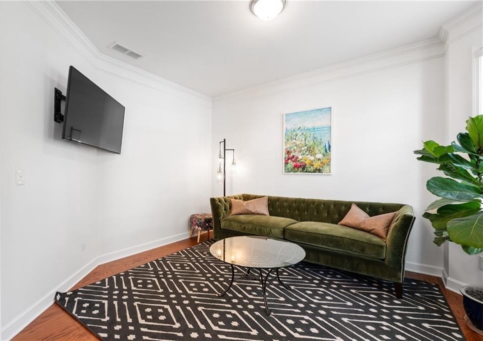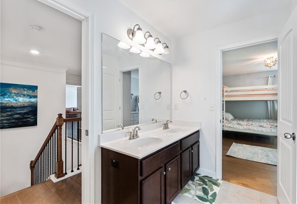 Inside, the home has been thoughtfully enhanced to blend modern style with everyday comfort. The newly renovated kitchen is the centerpiece, featuring striking quartz countertops, a stylish backsplash, a custom hood vent, and freshly repainted cabinets that make the space feel bright and inviting. On the main level, guests will appreciate the convenience of a bedroom and updated bath, complete with a new quartz countertop and sink. Upstairs, engineered hardwood flooring has been added throughout, creating a seamless and elevated look across every room.