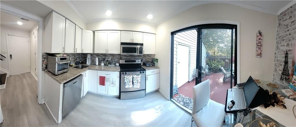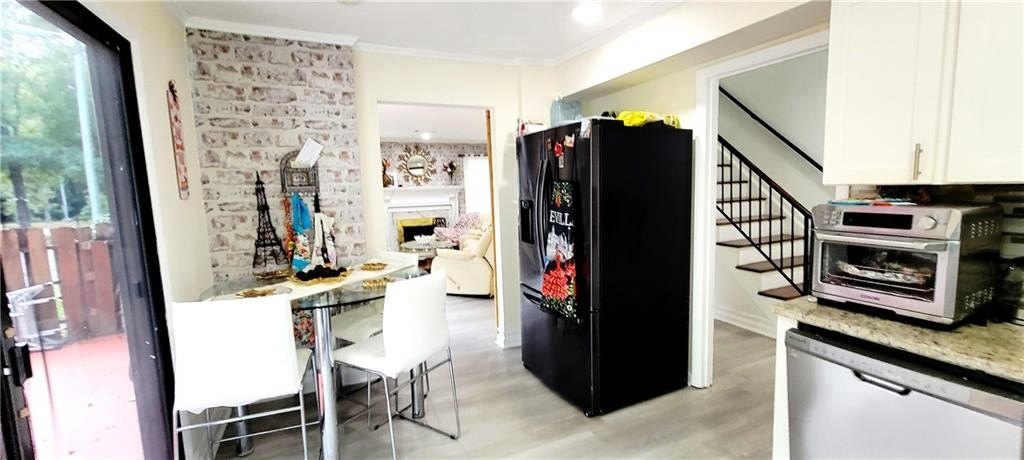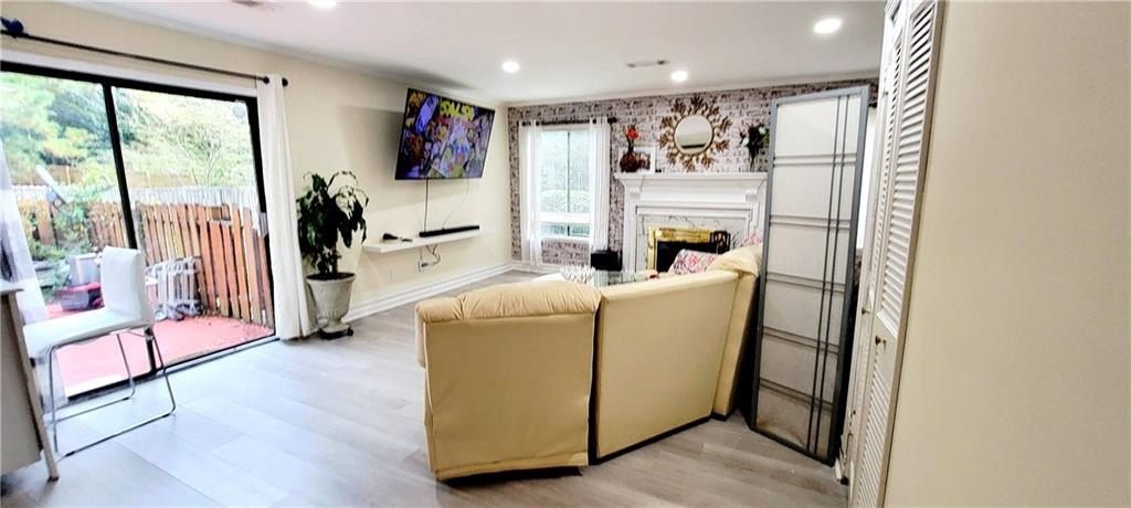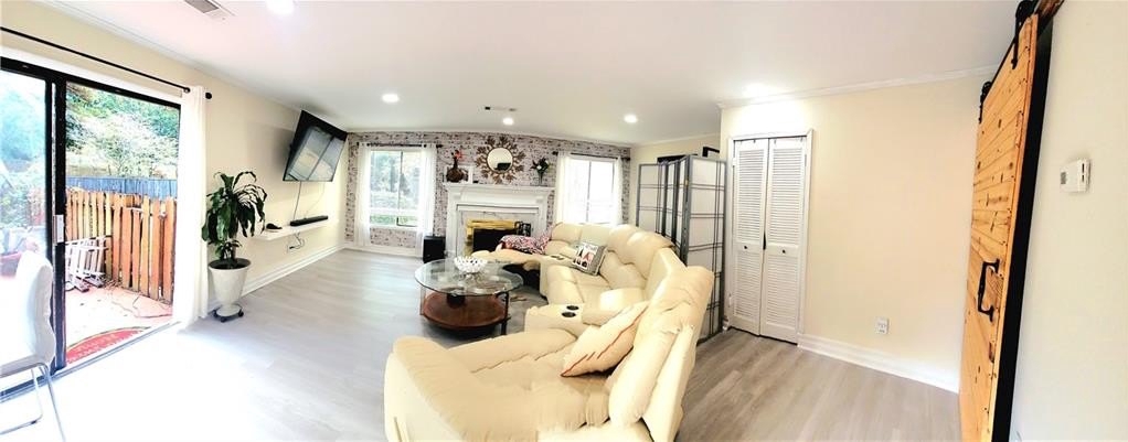Beautiful 2 bedrooms, 2 and a half bath townhouse, plenty of natural light. !!! This is an end unit with tons of privacy and a short walk to the lake!!!. Waterproof plank vinyl on the first floor. New roof. The double patio doors in the kitchen and in the living room offer a serene view. The living room boasts a beautiful chimney and two barn doors, creating a stylish space. The kitchen has real wood cabinets and granite countertops. *** Dimmable LED light fixtures in the entrance, living, and kitchen***. The patio features a lovely design for plant enthusiasts and is perfect for barbecues and gatherings. There is also a half bath on the first floor and a closet in the patio. Wood flooring on the whole second floor. Two master bedrooms, each with its master bathroom located at opposite sides, offer total privacy. The laundry is located in the hall. Close to Stores, supermarkets, restaurants, banks, 2 Walmarts, Costco, 2 Home Depots, and highway 85.