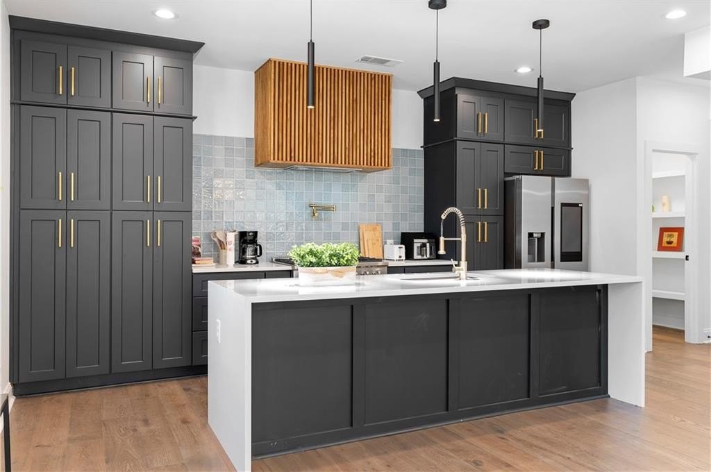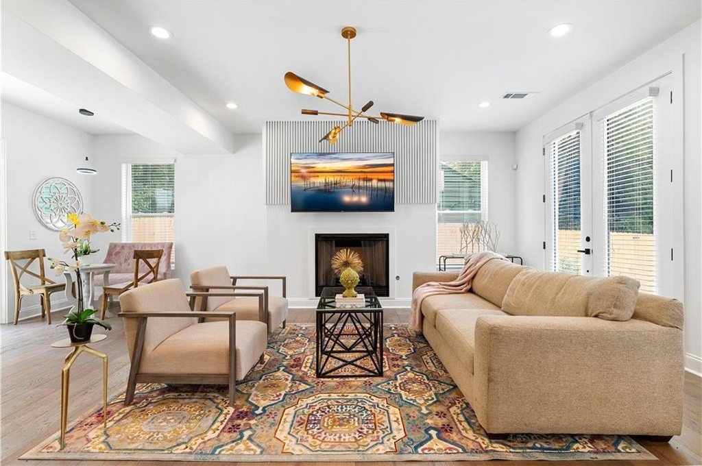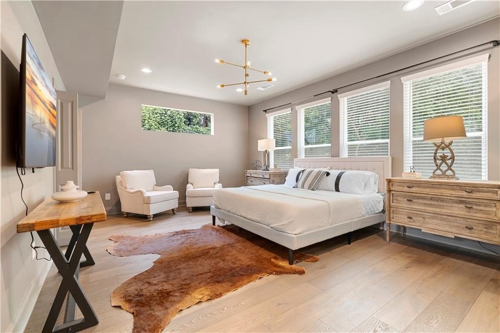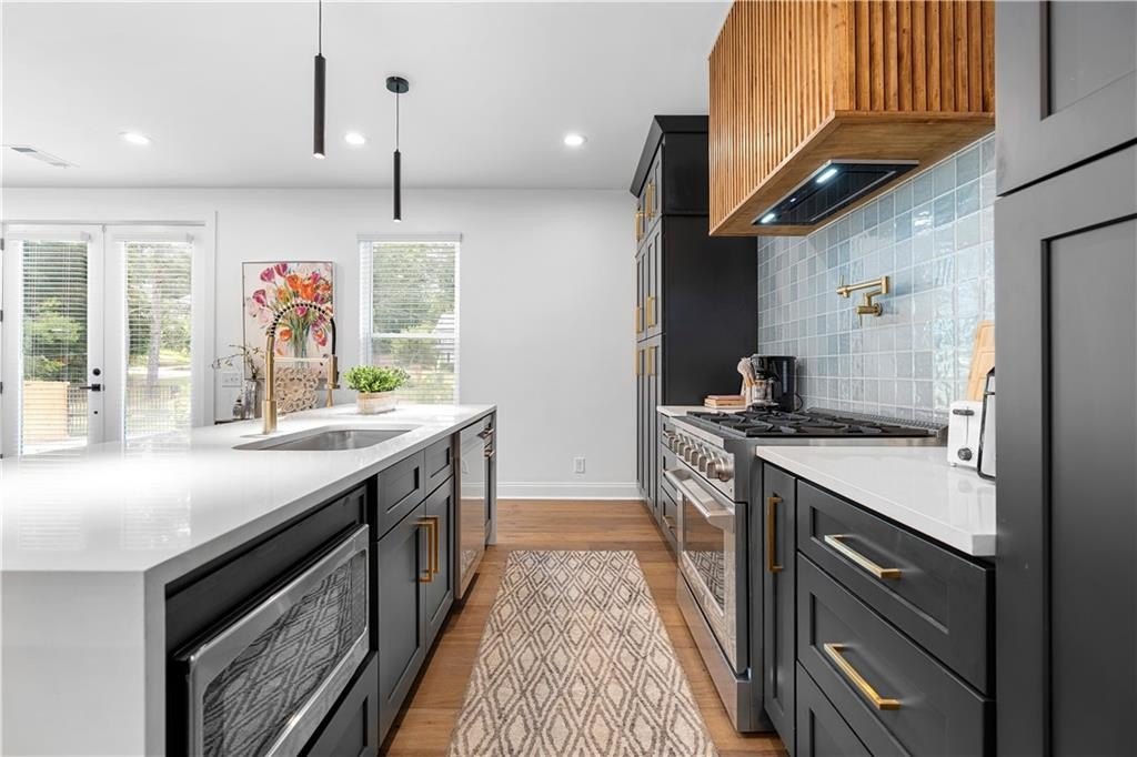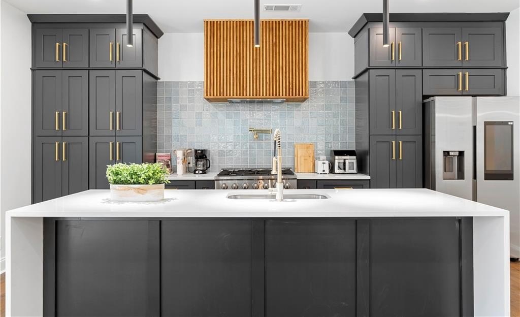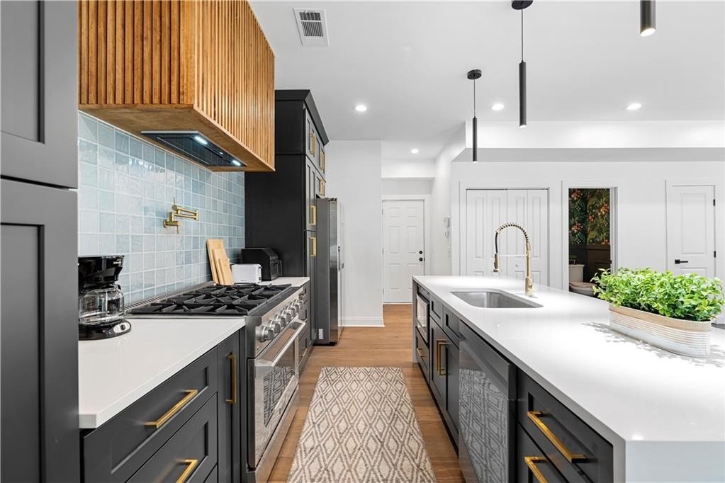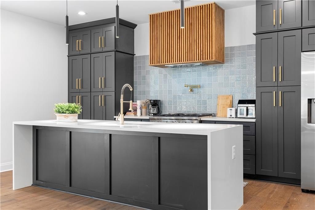 The main level features rich hardwood flooring, soaring ceilings, wide staircase and sun-filled living spaces that flow seamlessly for both everyday living and entertaining. The chef’s kitchen is equipped with professional-grade stainless steel appliances, an LCD side-by-side refrigerator, quartz countertops, a designer tile backsplash, an oversized waterfall island with built-in microwave, a custom vent hood, and a pot filler above the cooktop. A stylish wet bar with wine fridge (to be installed before closing) elevates the home’s entertaining appeal. Upstairs, the oversized primary suite includes a massive custom walk-in closet and a spa-inspired bathroom with floor-to-ceiling tile, dual quartz vanities, a soaking tub, and a large glass-enclosed shower. Three additional bedrooms with private full baths ensure comfort and privacy for guests or family, while the large laundry room with cabinetry and a built-in doggy shower adds convenience. The third level provides exceptional flexibility for multi-generational living, guest suites, or work-from-home setups, featuring two additional bedrooms, two full bathrooms, a secondary living space, and a wet bar. Buyers will also enjoy the opportunity to select custom paint colors for the pantry and third floor, adding a personalized designer touch. Outdoor living is equally impressive with a professionally landscaped yard, a wooden privacy fence, and a newly installed electric front gate for enhanced security. The driveway includes a convenient turn-around, ideal for urban living. With 6 bedrooms, 6 baths, multiple living areas, luxury upgrades, and an unbeatable location, this home stands out as one of East Lake Terrace’s most desirable properties.
