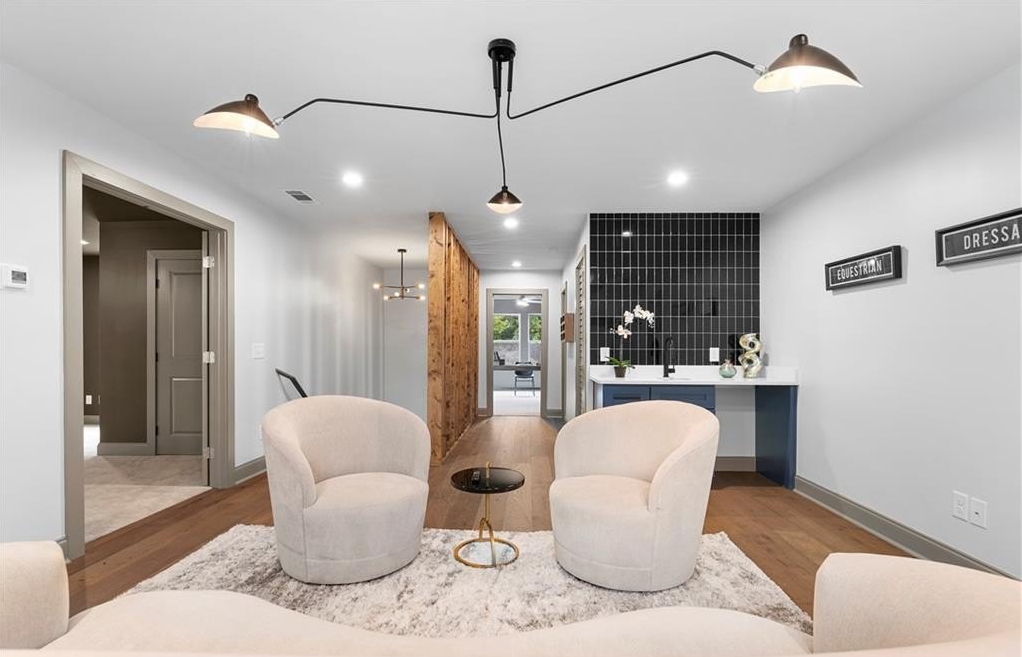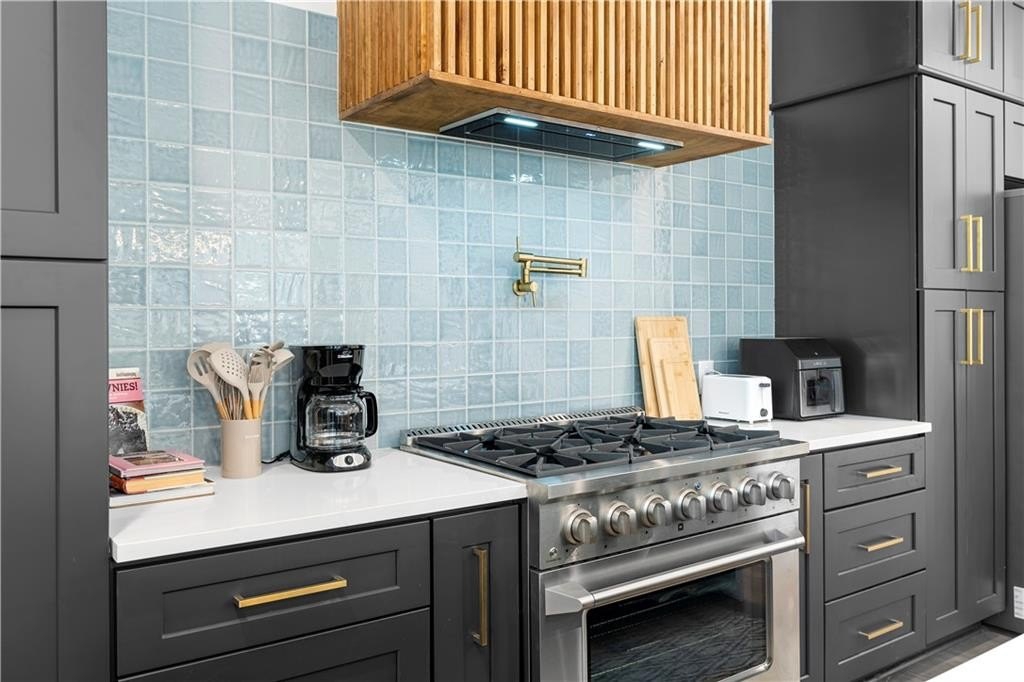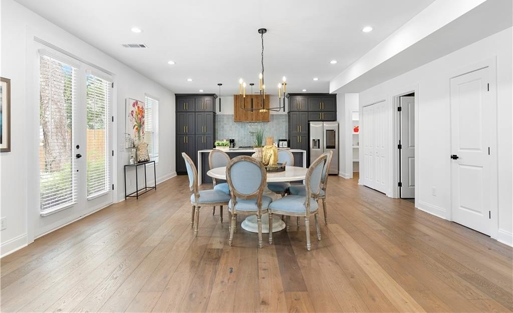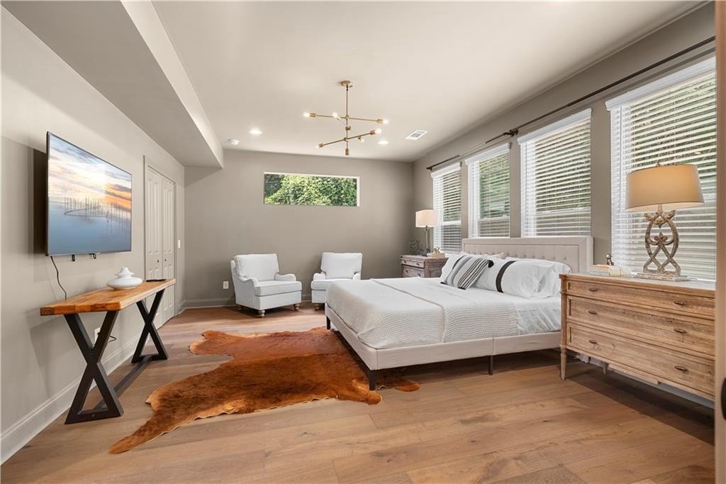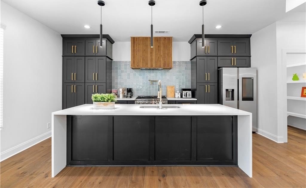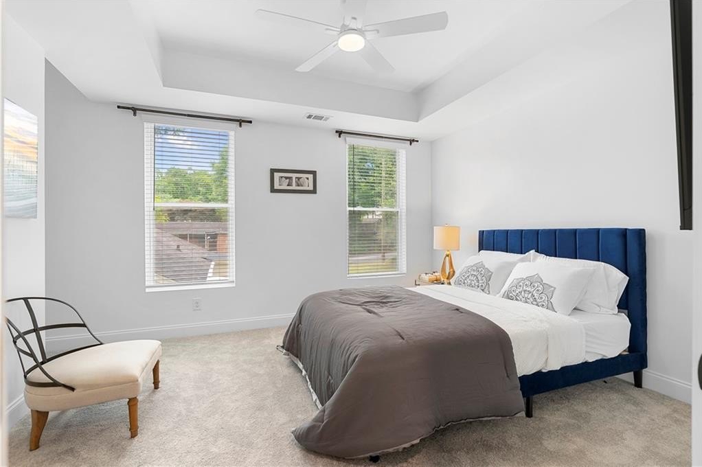 The main level features rich hardwood flooring, soaring ceilings, wide staircase and sun-filled living spaces that flow seamlessly for both everyday living and entertaining. The chef’s kitchen is equipped with professional-grade stainless steel appliances, an LCD side-by-side refrigerator, quartz countertops, a designer tile backsplash, an oversized waterfall island with built-in microwave, a custom vent hood, and a pot filler above the cooktop. A stylish wet bar with wine fridge (to be installed before closing) elevates the home’s entertaining appeal. Upstairs, the oversized primary suite includes a massive custom walk-in closet and a spa-inspired bathroom with floor-to-ceiling tile, dual quartz vanities, a soaking tub, and a large glass-enclosed shower. Three additional bedrooms with private full baths ensure comfort and privacy for guests or family, while the large laundry room with cabinetry and a built-in doggy shower adds convenience. The third level provides exceptional flexibility for multi-generational living, guest suites, or work-from-home setups, featuring two additional bedrooms, two full bathrooms, a secondary living space, and a wet bar. Buyers will also enjoy the opportunity to select custom paint colors for the pantry and third floor, adding a personalized designer touch. Outdoor living is equally impressive with a professionally landscaped yard, a wooden privacy fence, and a newly installed electric front gate for enhanced security. The driveway includes a convenient turn-around, ideal for urban living. With 6 bedrooms, 6 baths, multiple living areas, luxury upgrades, and an unbeatable location, this home stands out as one of East Lake Terrace’s most desirable properties.
