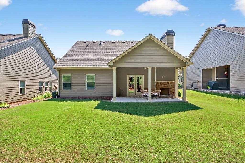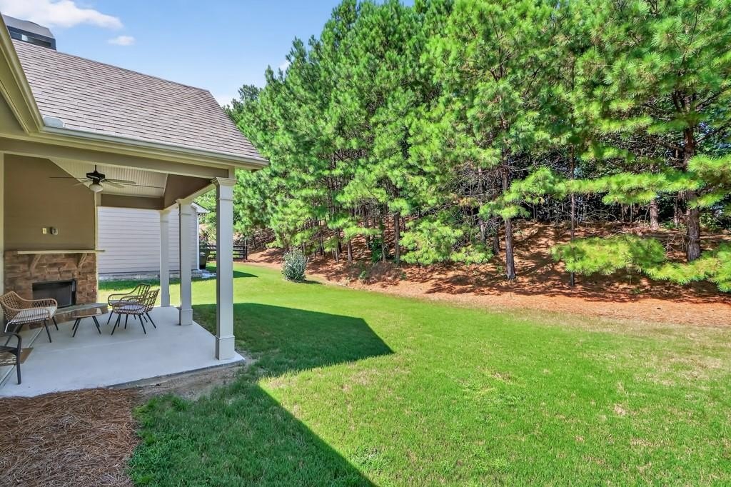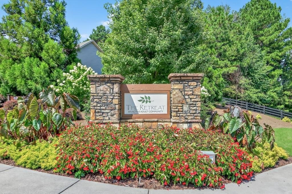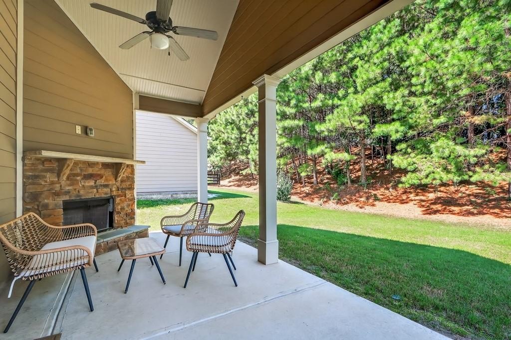 an outdoor fireplace for cozy evenings fireside. Backyard is nice, private, and wooded. Residents have access to exclusive 55+ amenities