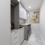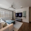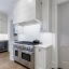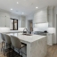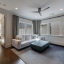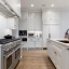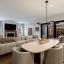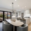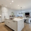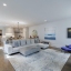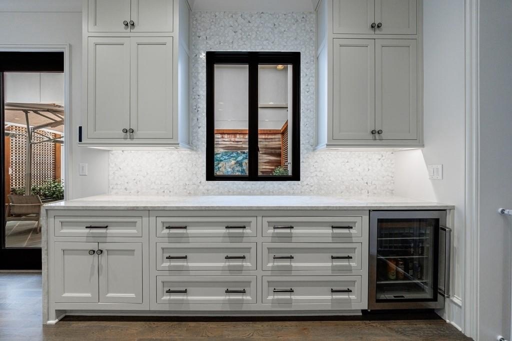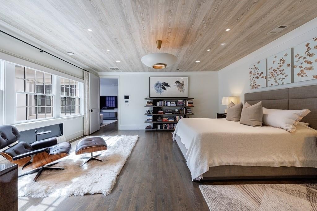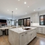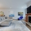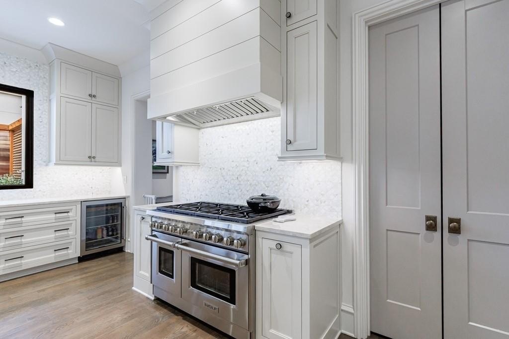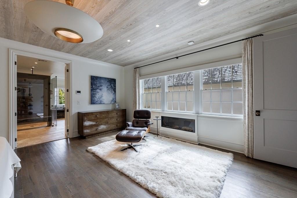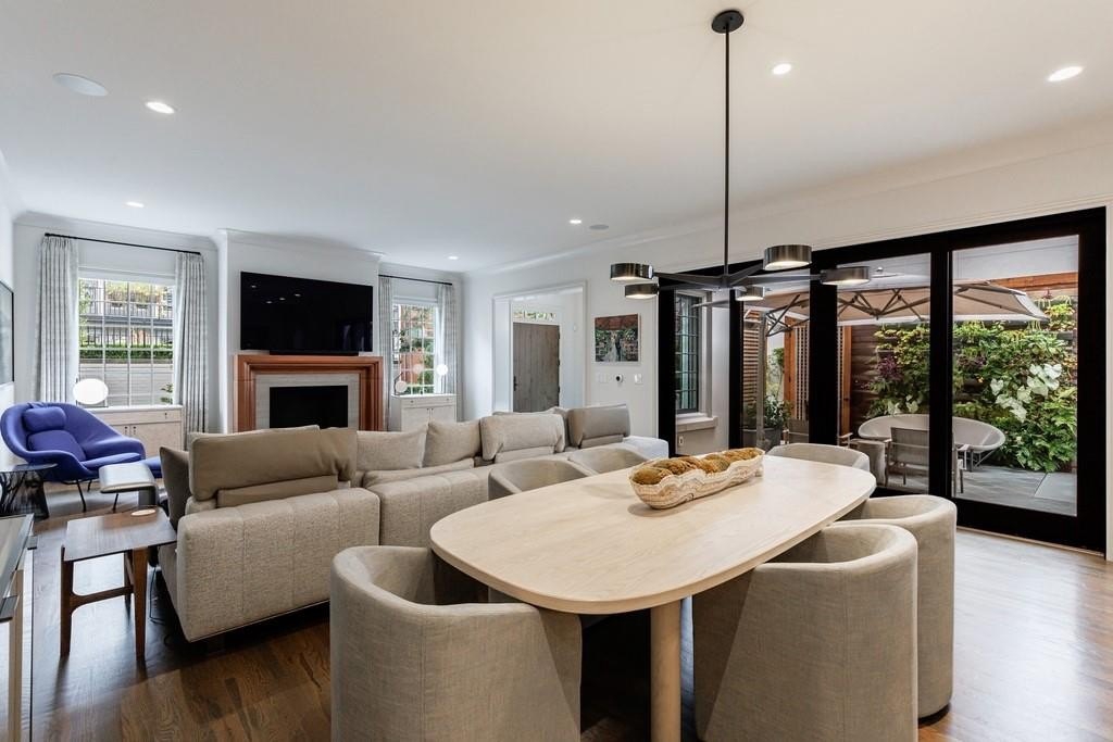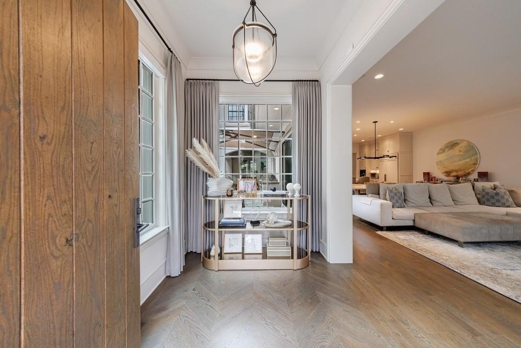 Inside, a light-filled foyer with a fireplace welcomes you into the home and flows seamlessly into the chef’s kitchen and living room. The open-concept kitchen includes a large island, ample storage, and a walk-in pantry.
