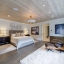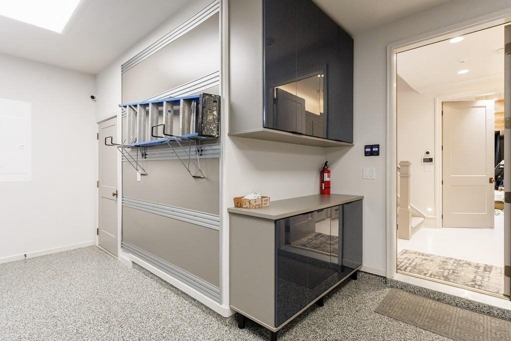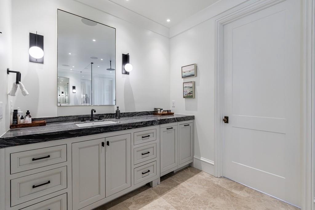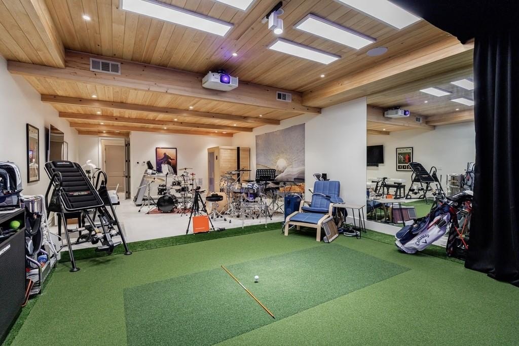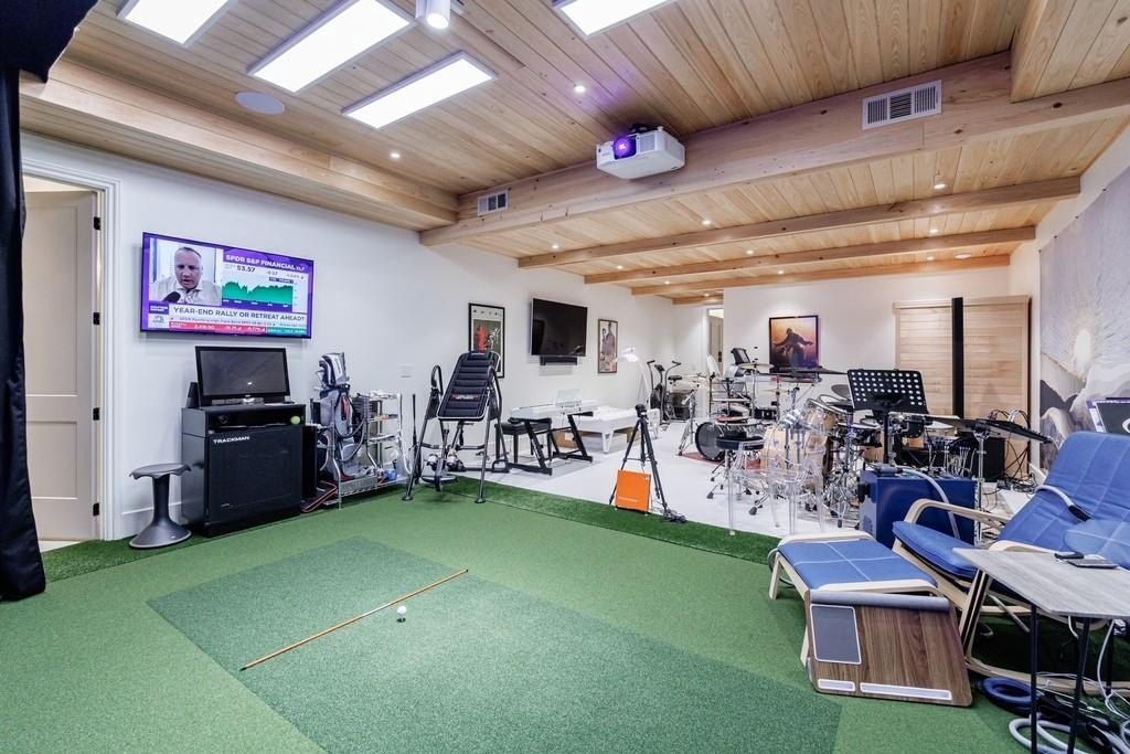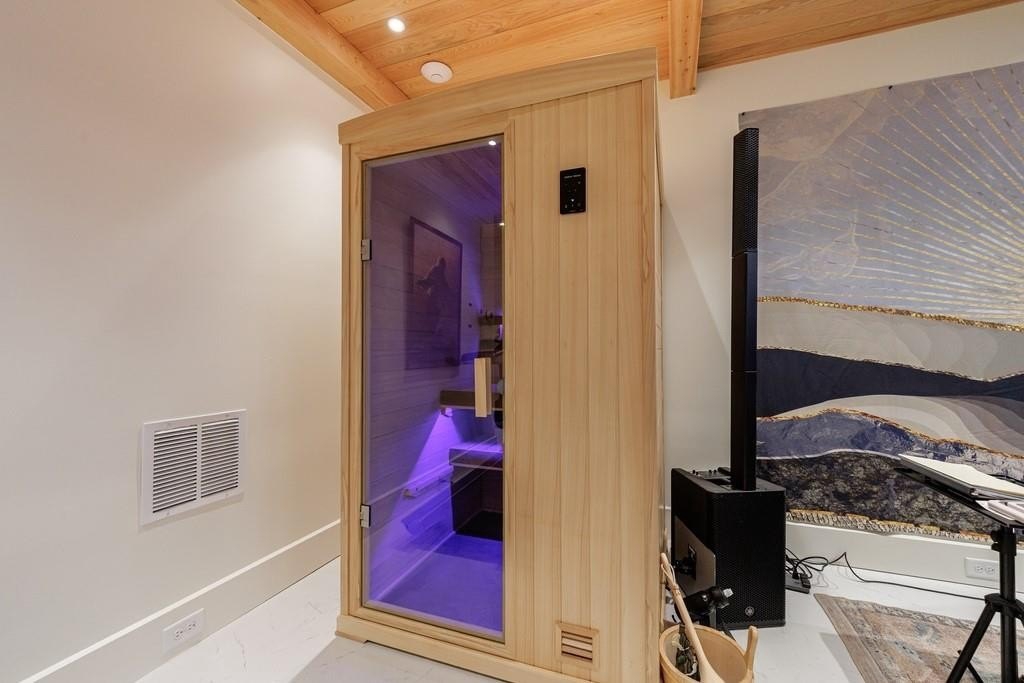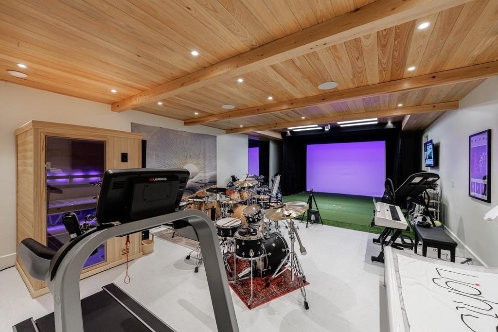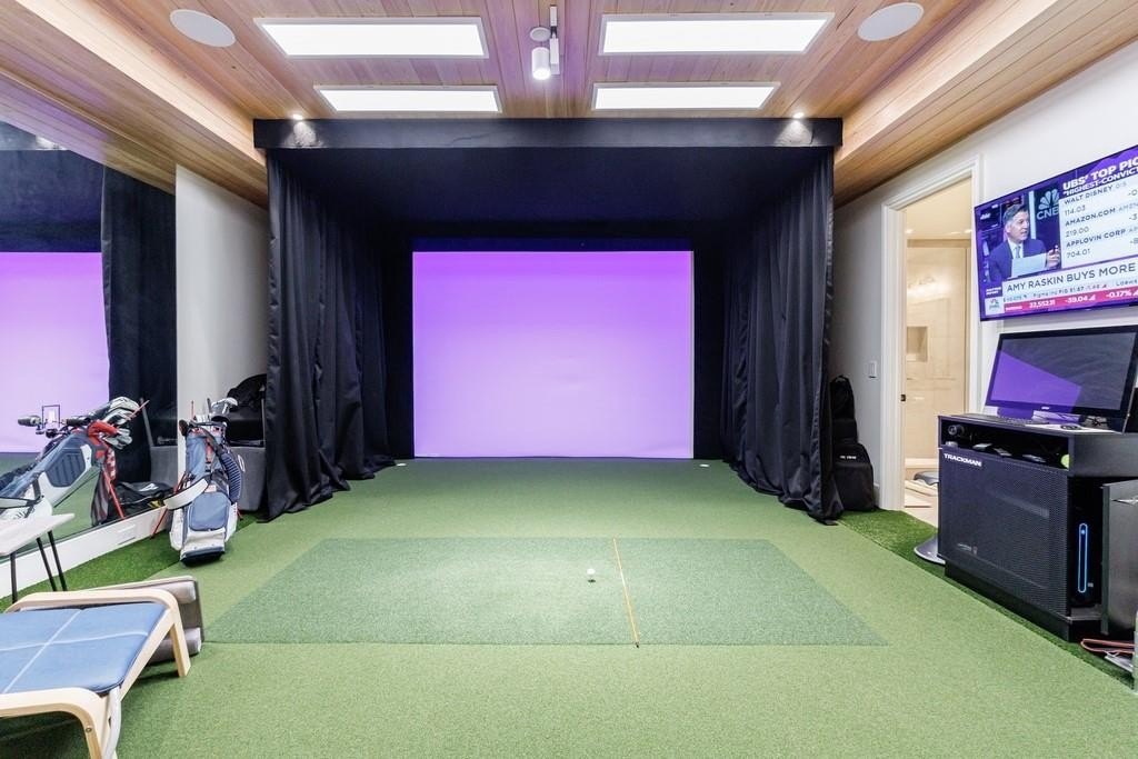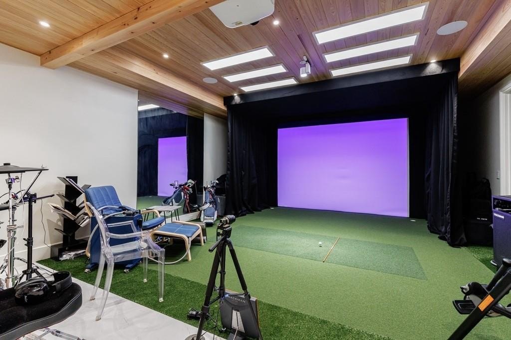 The lower level boasts a large bonus room, currently outfitted with a golf simulator, sauna, full bath- perfect as a gym, media room, or guest space. The basement level is complete with built-in cabinetry in the mudroom off the 3-car garage