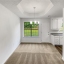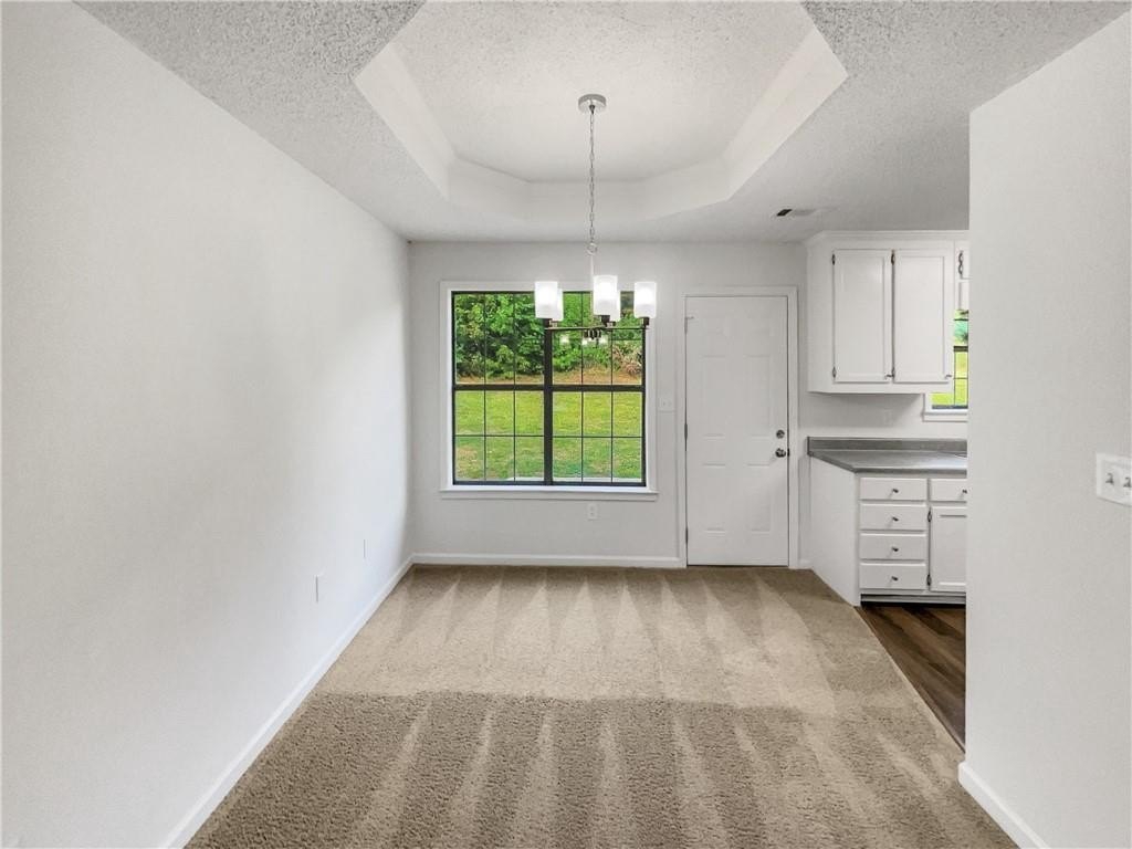 an open concept living and dining room, complete with a tray ceiling and chandelier for an