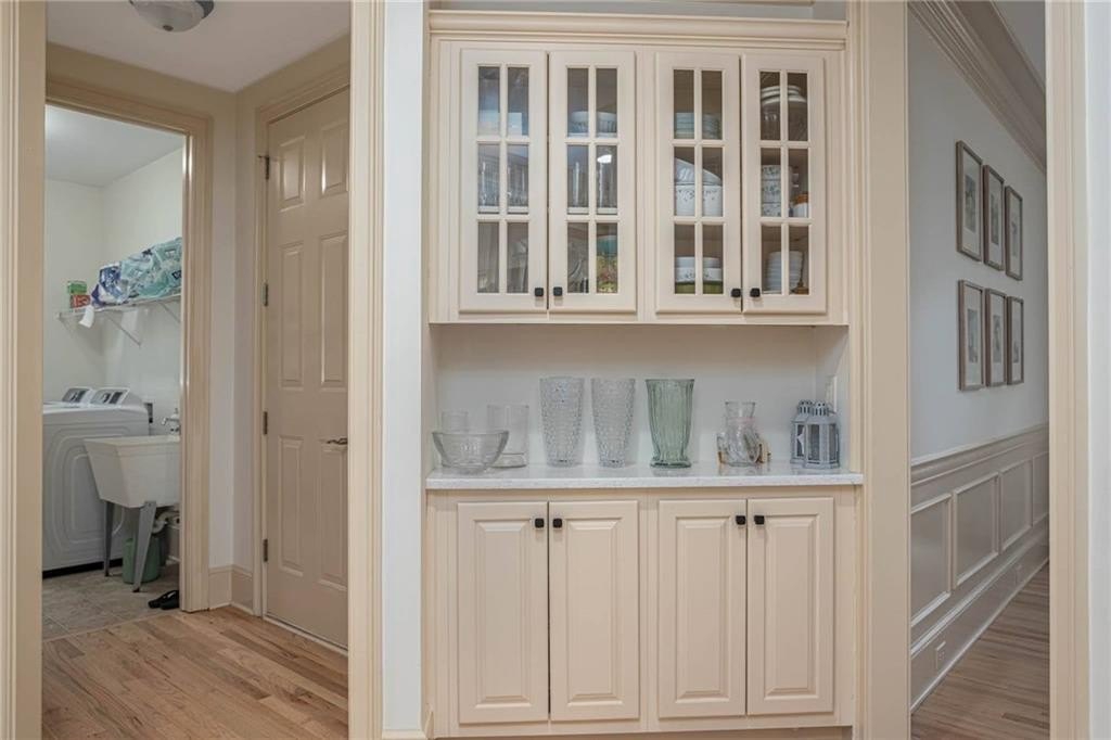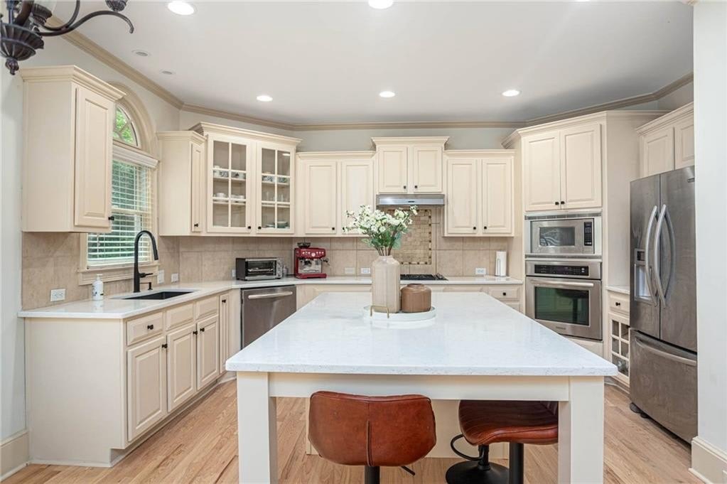 The chef’s kitchen is a true masterpiece, featuring top-of-the-line stainless steel appliances, a large center island and custom cabinetry. Whether you're preparing a casual meal or a gourmet feast, this kitchen has it all.