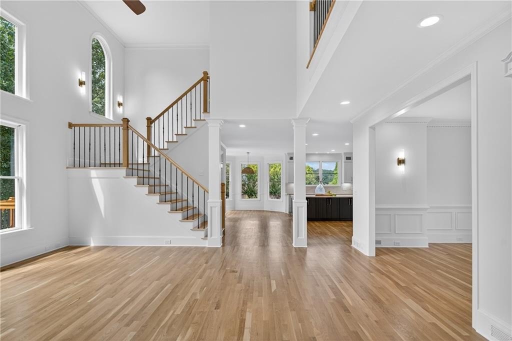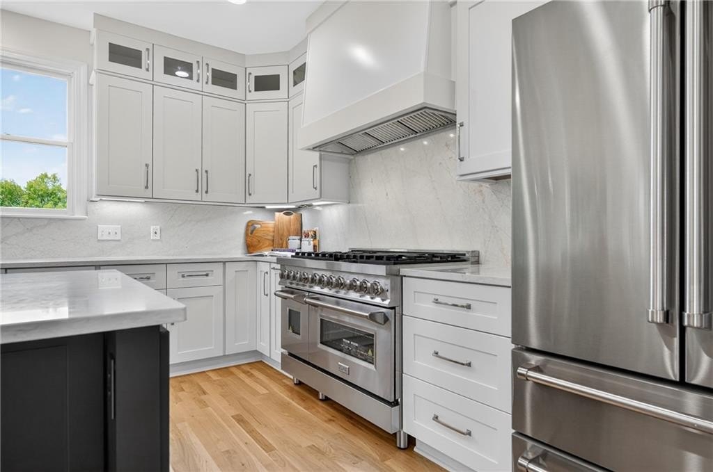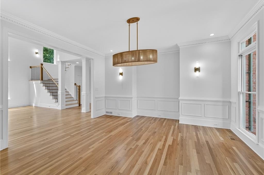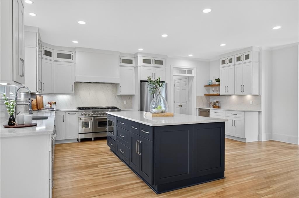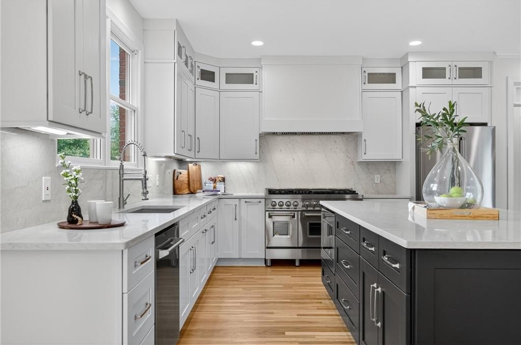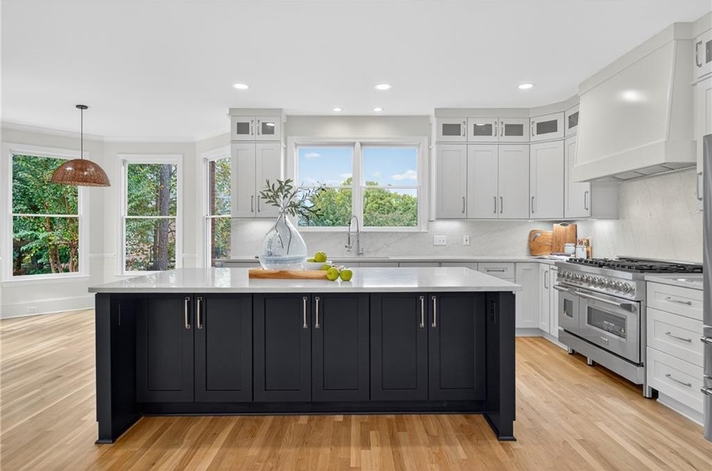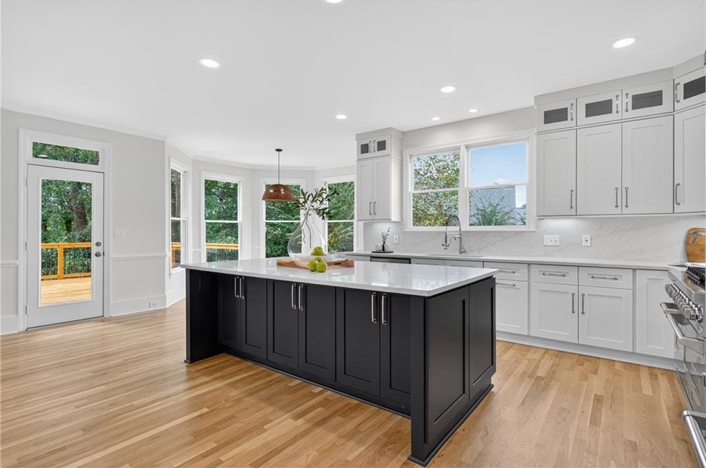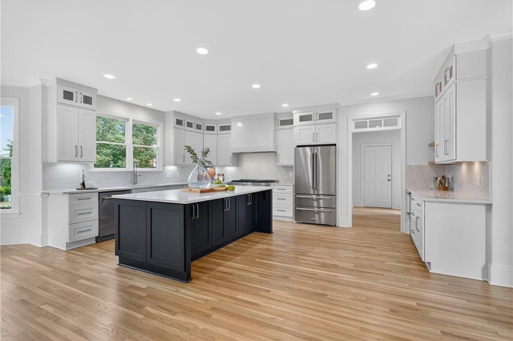 No detail has been overlooked in this beautifully designed home — featuring brand new kitchen, bathrooms, flooring, lighting, deck, and more. The elegant two-story foyer welcomes you in, flanked by a formal dining room and a home office/library.