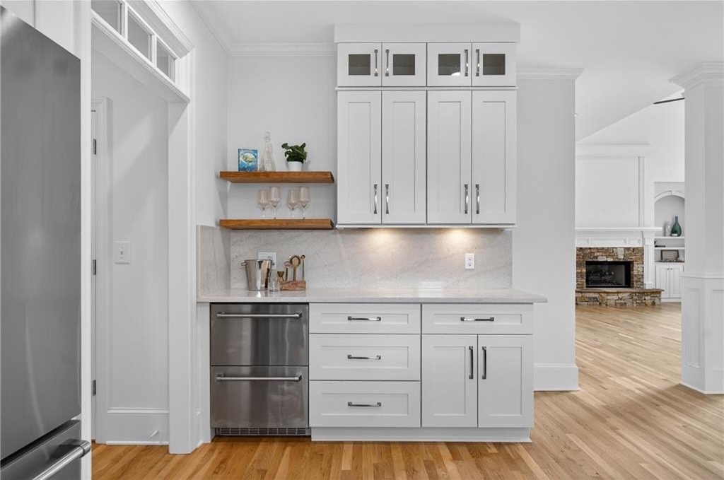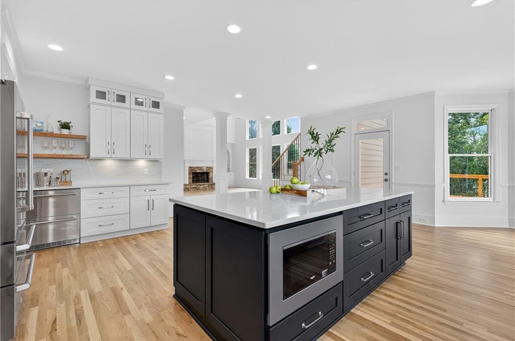 The main level is perfect for both everyday living and entertaining, with a spacious great room showcasing floor-to-ceiling windows that flood the space with natural light. The chef’s kitchen is a true centerpiece, complete with a massive island, luxury appliances, and a separate bar area. Also on the main level: a guest bedroom, full bath, powder room, and a mudroom for added functionality.