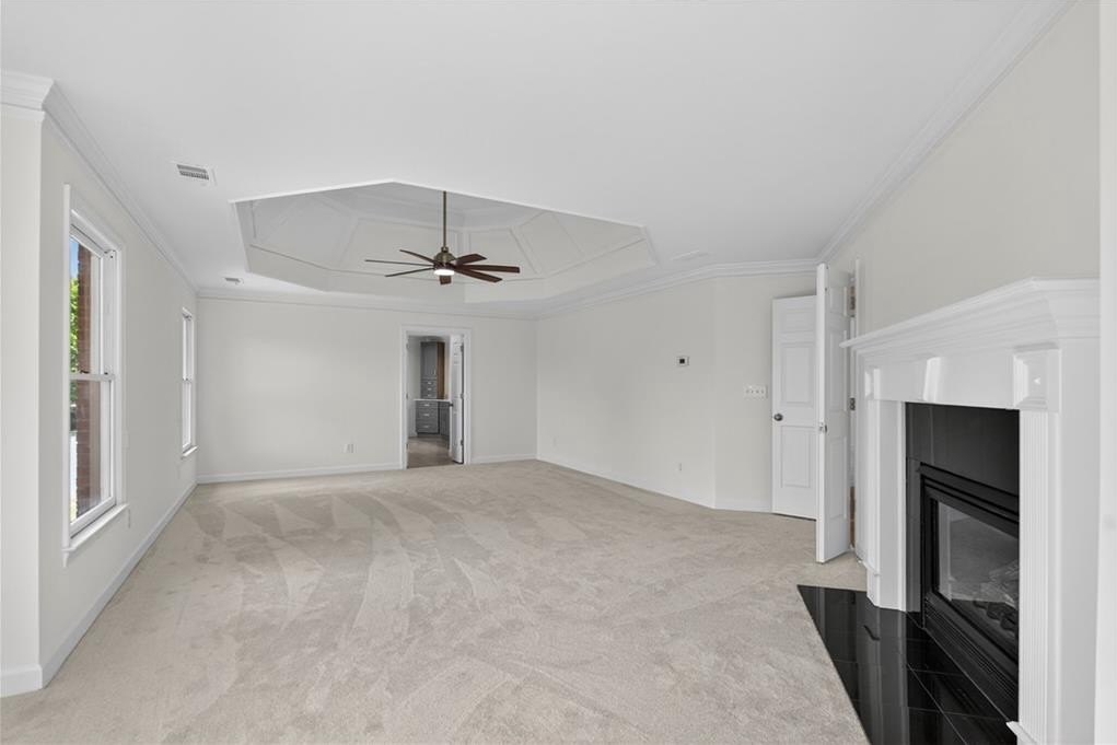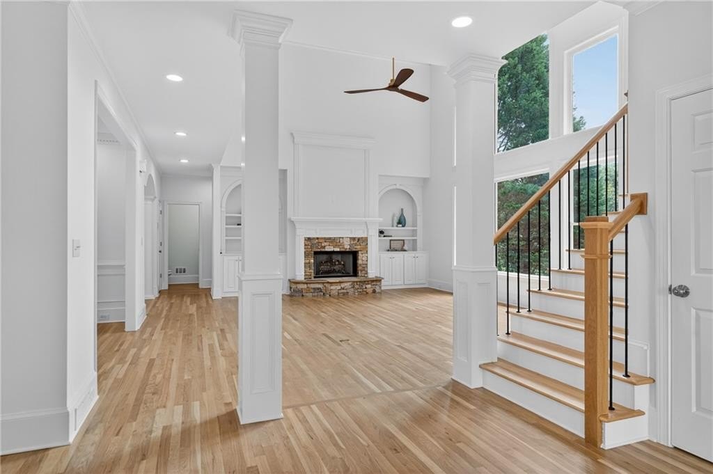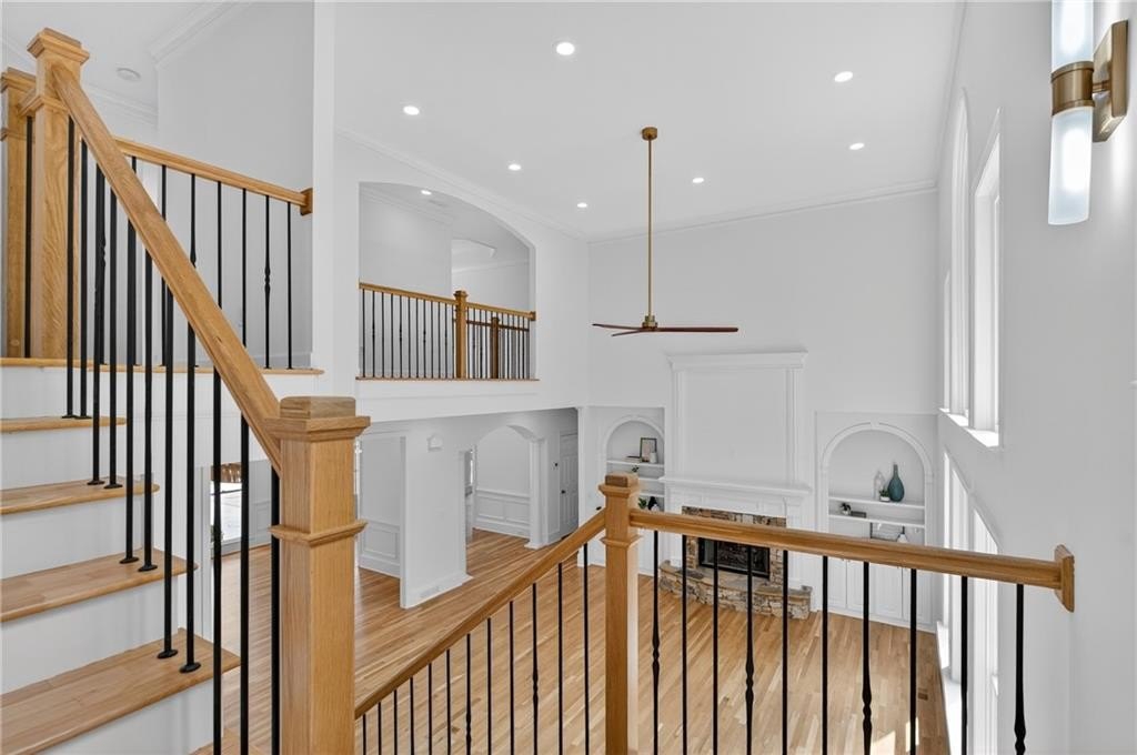 Upstairs, the freshly updated staircase and banister lead you to a luxurious primary suite featuring a cozy gas fireplace, sitting area, and a completely remodeled spa-like bath with a massive walk-in closet. Three additional bedrooms upstairs include one en suite and two sharing a Jack-and-Jill bath.