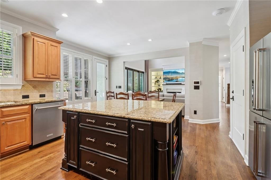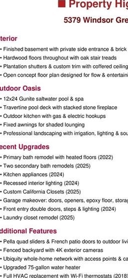 ***Fully upgraded throughout***Backyard oasis w/ pool and kitchen***Finished basement***Luxury living meets everyday comfort in this meticulously updated executive home, designed for both privacy and year-round entertaining. Highlights include a finished basement with private side entrance, hardwood floors, oak stair treads, plantation shutters, premium solid-wood doors with Emtek hardware, custom millwork, crown molding throughout, and coffered ceilings. Finished basement has a private entrance, perfect for a man cave, multi-generational living, or an income producing unit. The open floor plan flows to a dreamy backyard with a heated 12x24 gunite saltwater pool and spa, travertine deck, stacked-stone fireplace, full outdoor kitchen, fixed awnings, and professional landscaping with irrigation, lighting, and sound system. Recent upgrades include primary bath remodel with heated floors, 2 secondary bath remodels, Kitchen appliances, Interior recessed lighting, Custom California Closets, Garage doors, openers, epoxy floor & storage systems, Front entry doors, steps & lighting, Exterior solid-wood shutters, and more! See the attached upgrade document for the complete list! Modern conveniences: Pella quad sliders and French doors, Ubiquiti whole home automation system w/ remote access to alarms, cameras, thermostats, sound system, lighting, and pool, enterprise access points on all 3 levels, backup power, dedicated storage, and remote video access, plus 4K exterior cameras. Additional features include a 75-gallon water heater and full HVAC system replacement with Wi-Fi thermostats (2018). This thoughtfully designed home blends elegance, technology, and function—perfect for today’s lifestyle of luxury, comfort, and seamless indoor/outdoor living. Book your tour today!