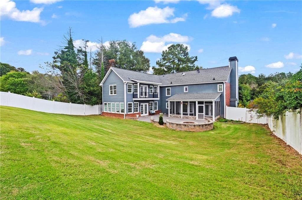 Outdoor living is a true highlight. Step from the living room onto a screened-in porch, perfect for morning coffee or unwinding in the evening. The large, fenced backyard is designed for entertaining, featuring a built-in stone fireplace with seating, lush green space for play, and plenty of room to host family and friends.