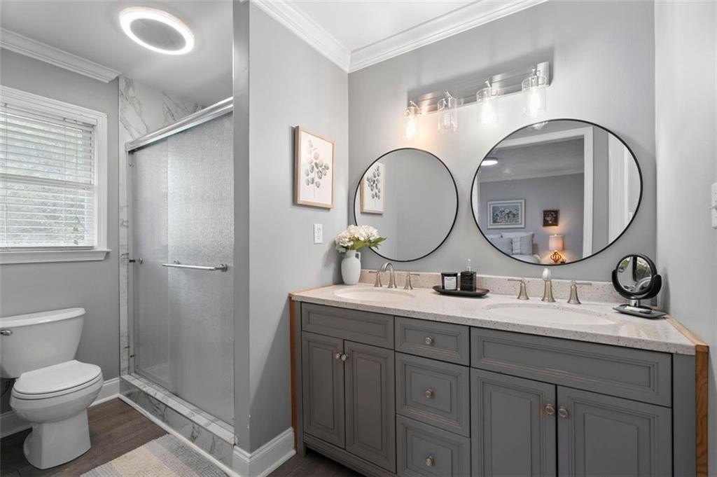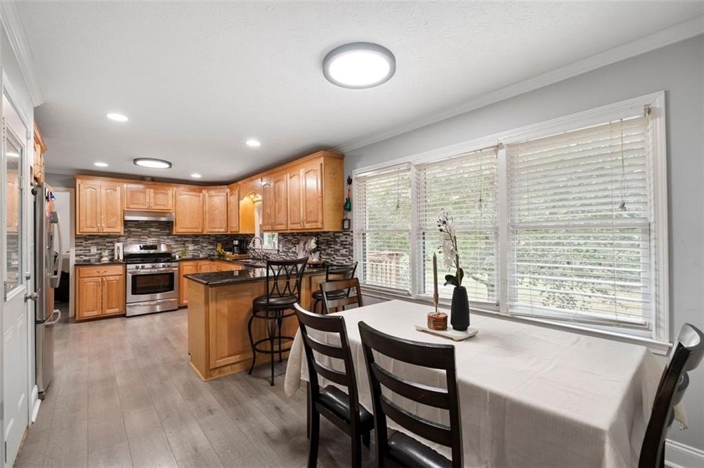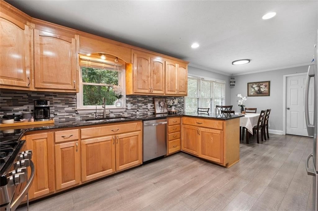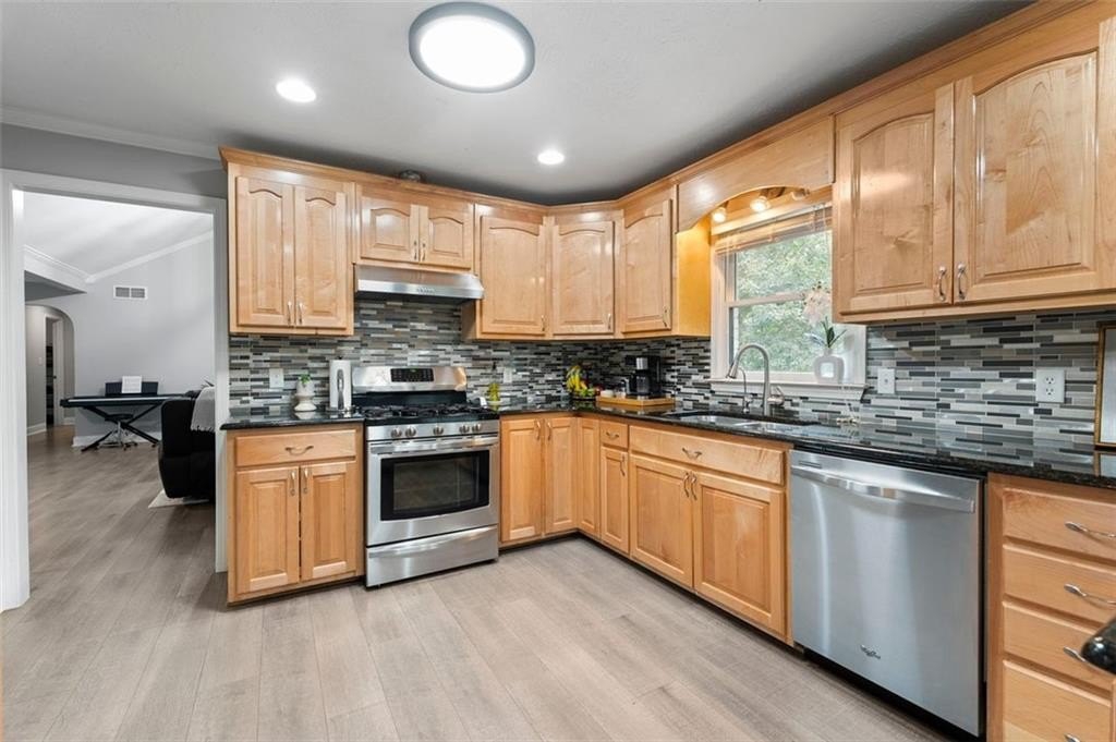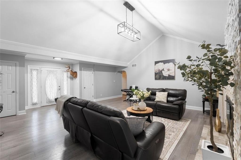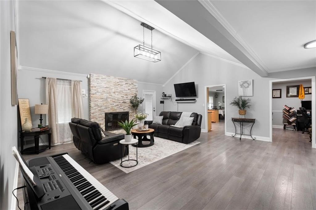 This updated ranch combines modern touches with timeless comfort. The vaulted living room with a brand-new stacked-stone fireplace creates a bright, welcoming space at the heart of the home. The kitchen features warm wood cabinetry, granite counters, stainless steel appliances, and a stylish backsplash. The owner’s suite includes a beautifully renovated bath with a completely new walk-in shower and double vanities that were previously a single. New flooring runs throughout the home, adding warmth and flow to every room. The exterior was recently painted and showcases classic brick detail. The front porch has updated siding and new railings, giving the home crisp curb appeal. Outside, a large fenced backyard offers plenty of space for gatherings, gardening, or simply enjoying the outdoors in privacy.