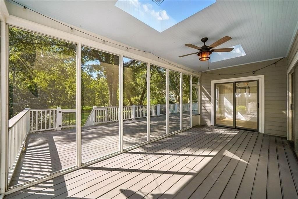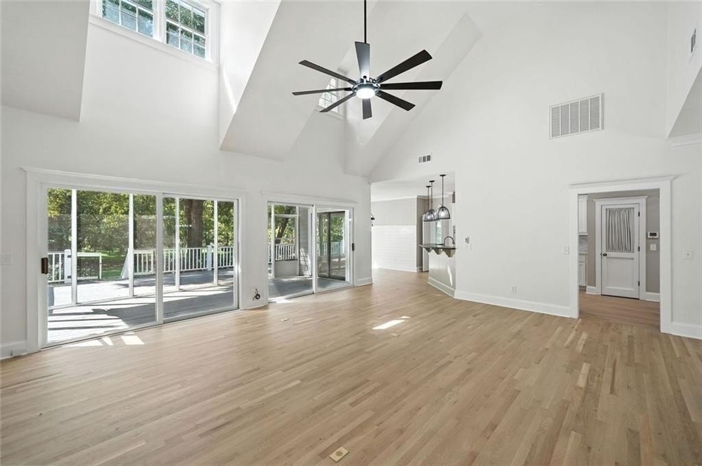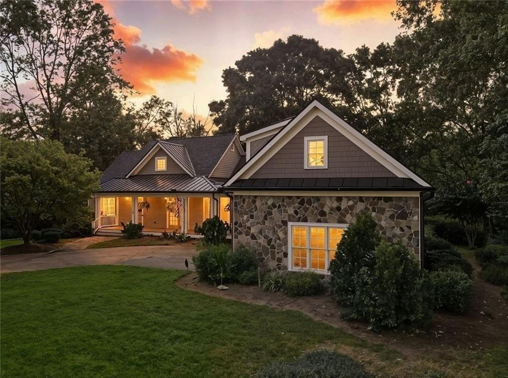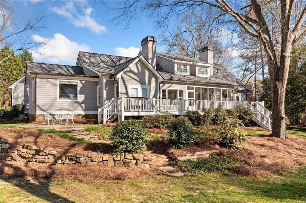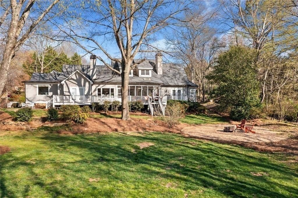 Step through the front porch into a bright, open floor plan with refinished hardwoods and updated lighting throughout. The main living space features a vaulted ceiling, built-ins, and a gas fireplace framed by a classic wood mantel. The fully renovated kitchen includes quartz countertops, shaker cabinetry, stainless steel appliances, and a custom farmhouse sink, flowing into a wet bar with natural light all around. Just off the kitchen, the screened porch and large back deck invite you to relax and listen to the creeks running along both sides of the property.