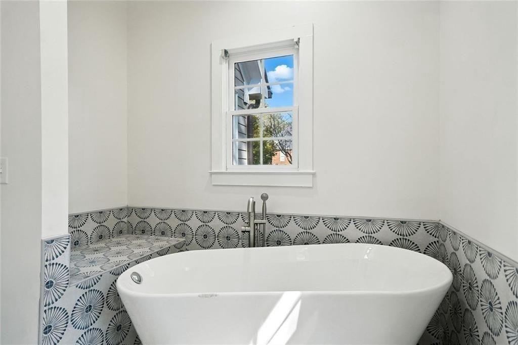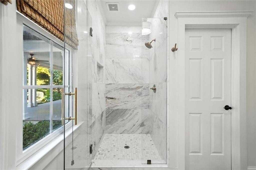 The primary suite is privately situated and features a spa-inspired bathroom with a freestanding soaking tub, marble tile shower, and dual closets—one of which serves as a reinforced storm shelter. Private office or flex room just off primary suite. Two additional bedrooms and renovated Jack and Jill bath with an additional freestanding tub and separate shower featuring handmade Spanish tile complete the main level, offering flexibility for guests or workspace.