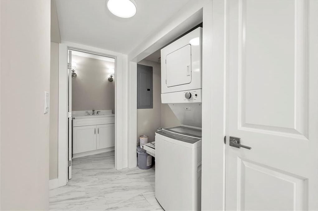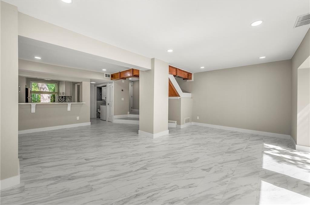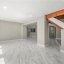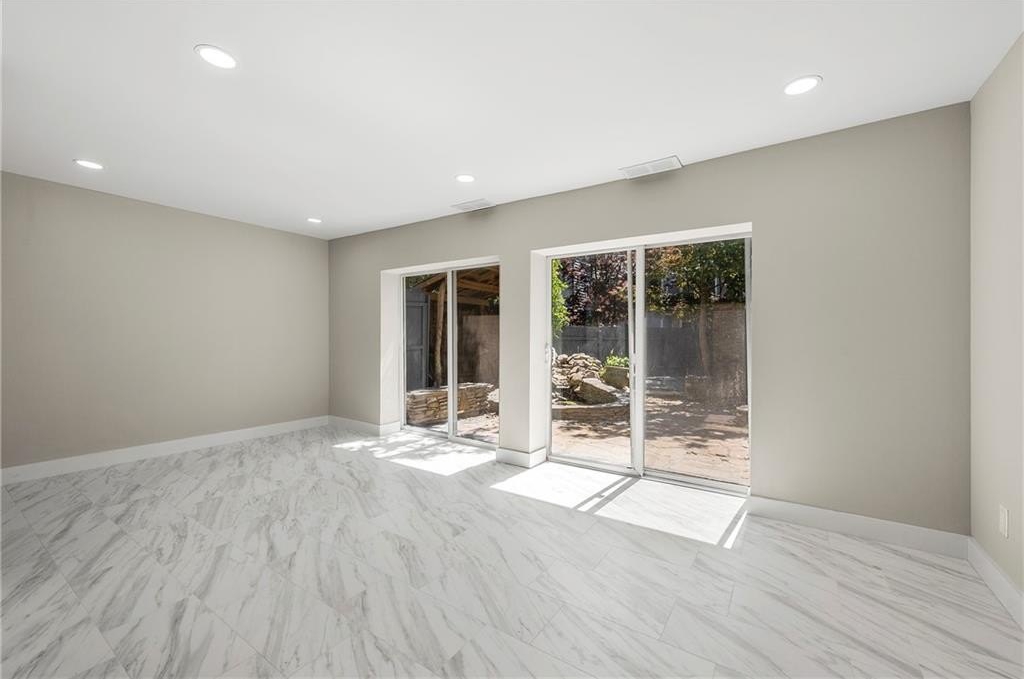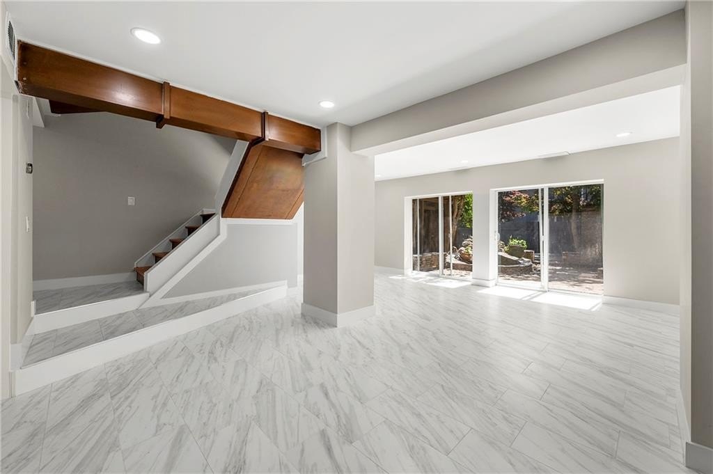 The main level welcomes you with an open-concept living and dining area—ideal for entertaining—complete with easy-care tiled flooring featuring an elegant Italian marble look. The light-filled kitchen boasts all-new cabinetry with soft-close doors and drawers, quartz countertops, and sleek stainless fixtures.
