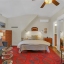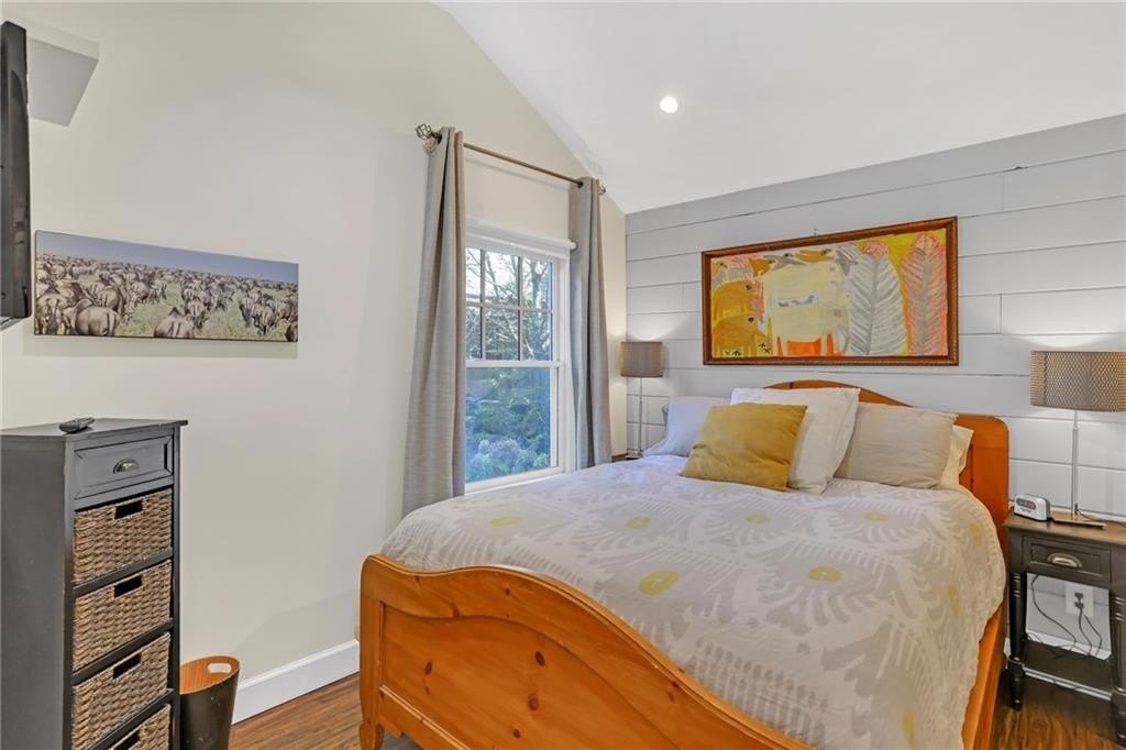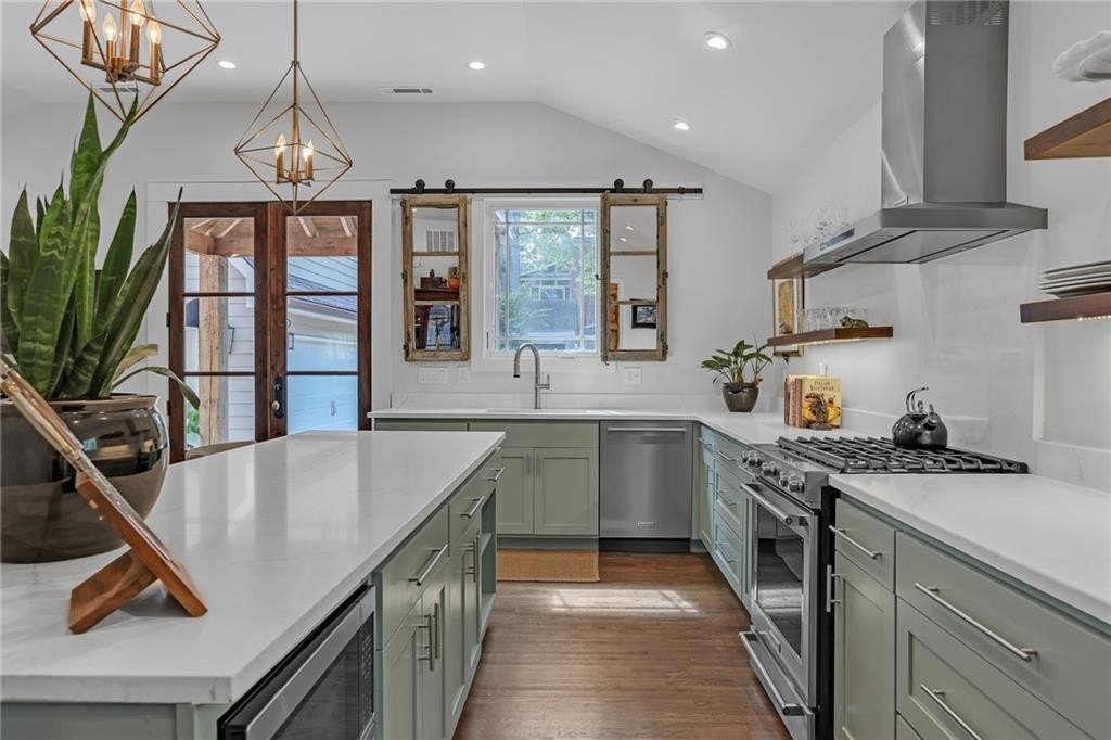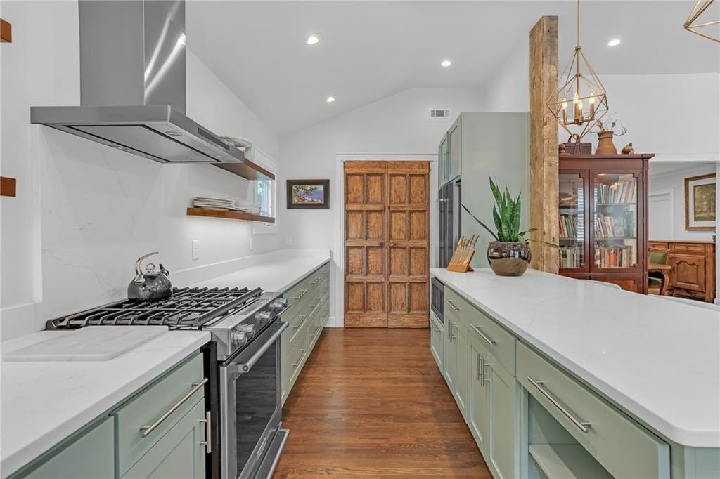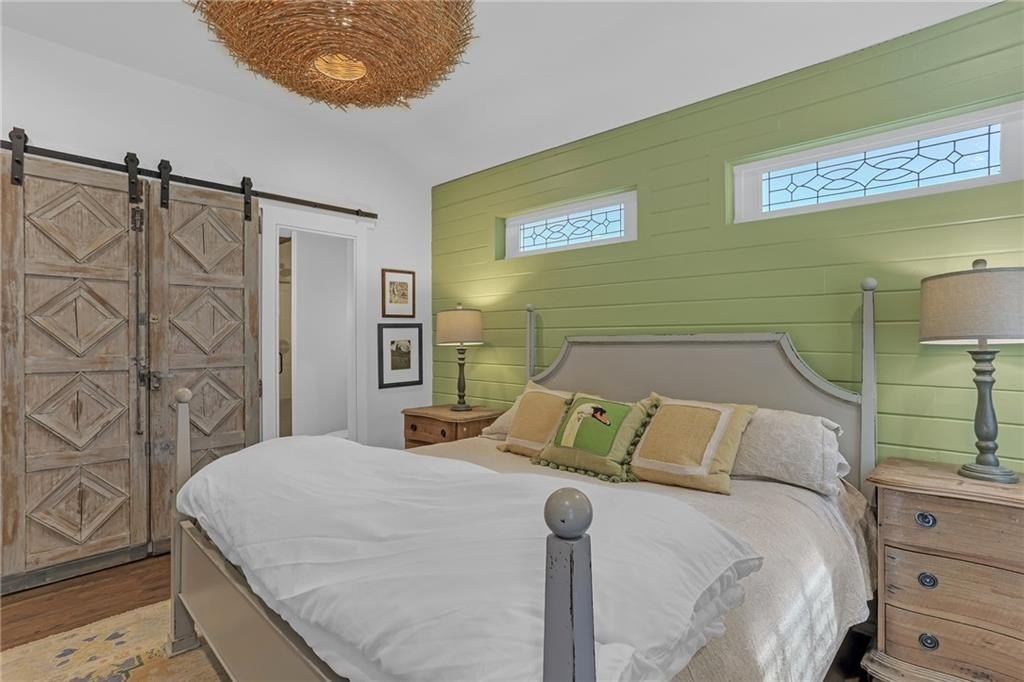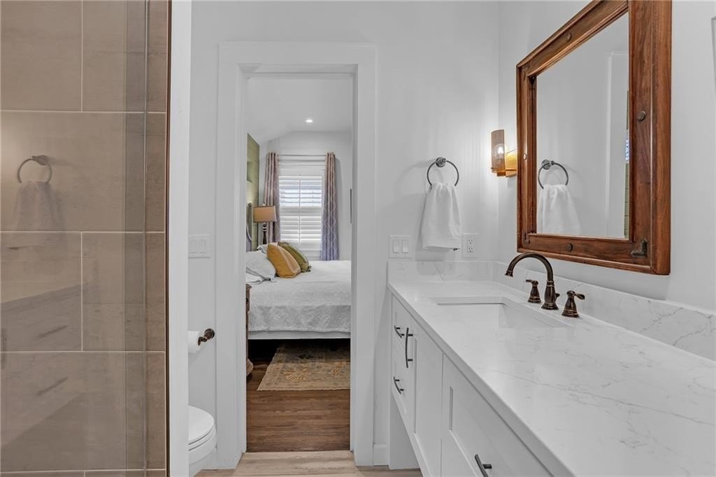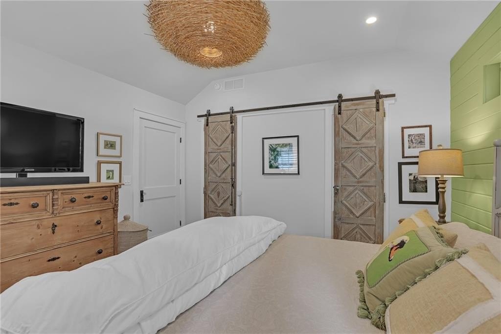 The spacious master suite offers abundant natural light, vaulted ceilings, a double vanity, and a spa-like shower with dramatic Quartz walls. There are two additional bedrooms. A side room off the living room is cleverly concealed behind a hidden bookcase door, adding a playful and private touch