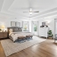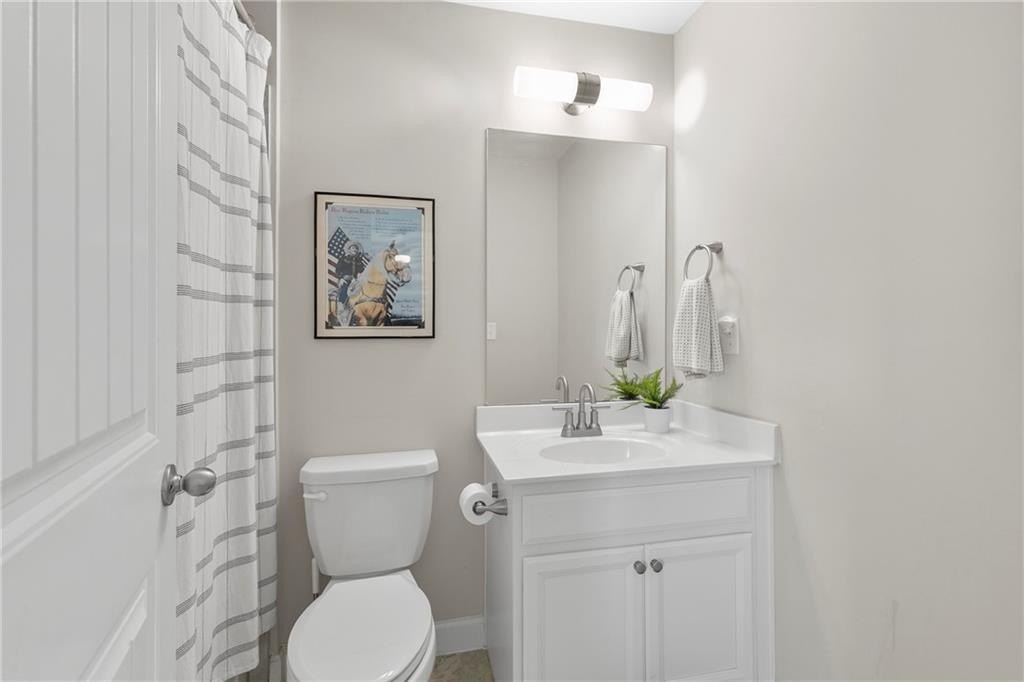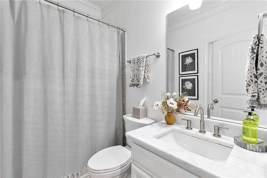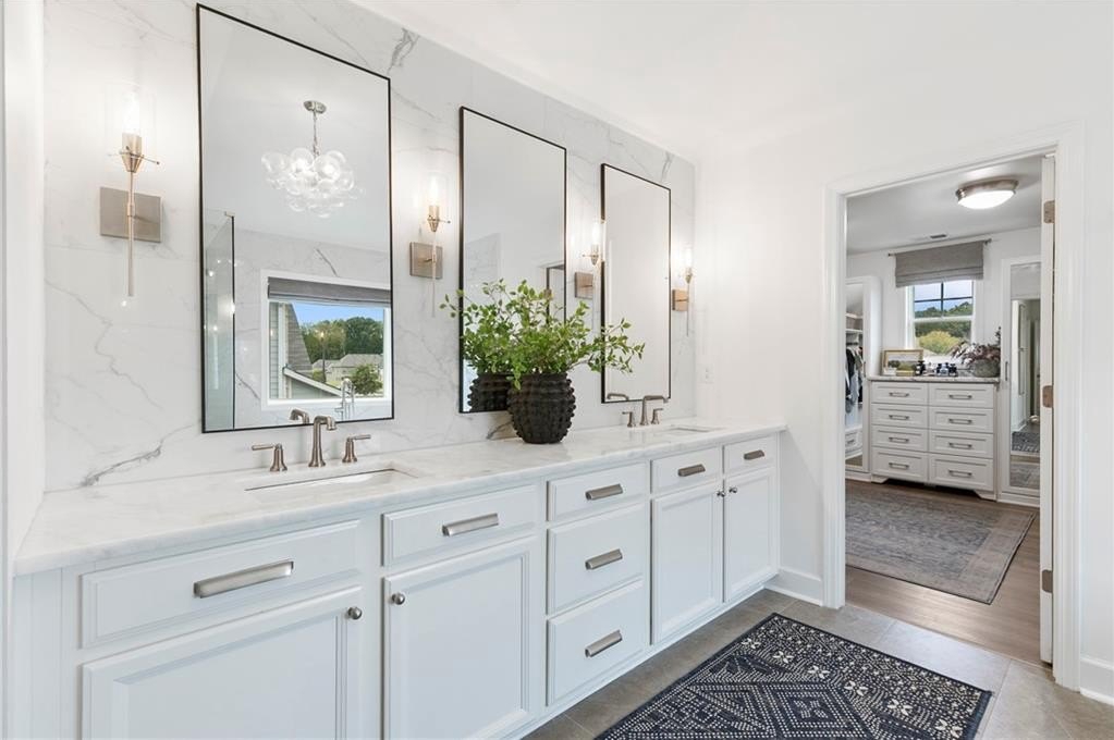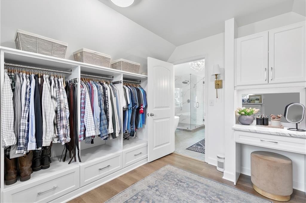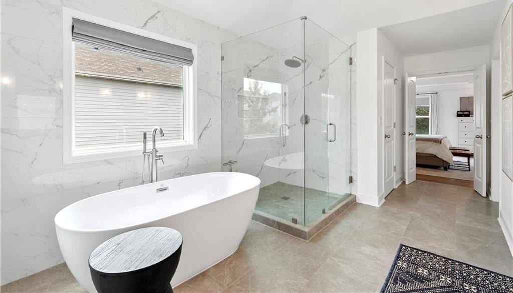 Retreat to the owner’s suite, a true sanctuary boasting a renovated spa-style bath with soaking tub, frameless tiled shower, and marble countertops. The customized closets offer built-in storage, a secret shoe organizer, and a vanity dressing area. For convenience, there’s also an additional laundry room entrance through the master bath.