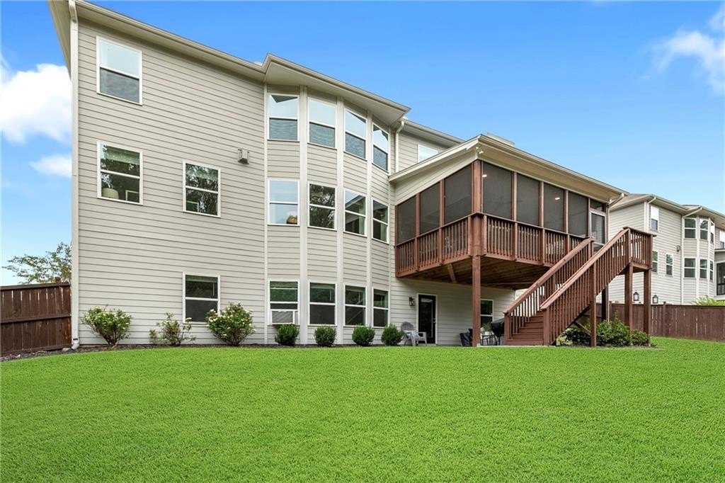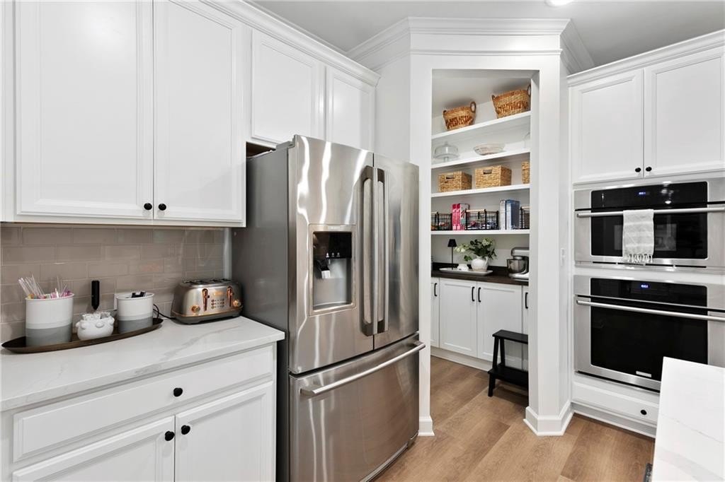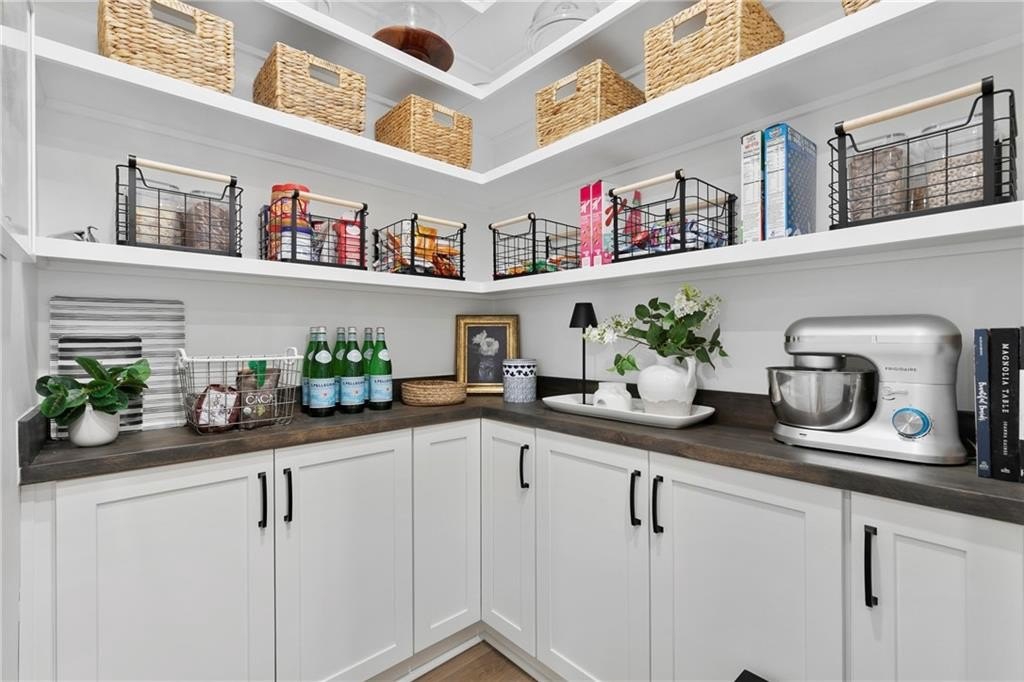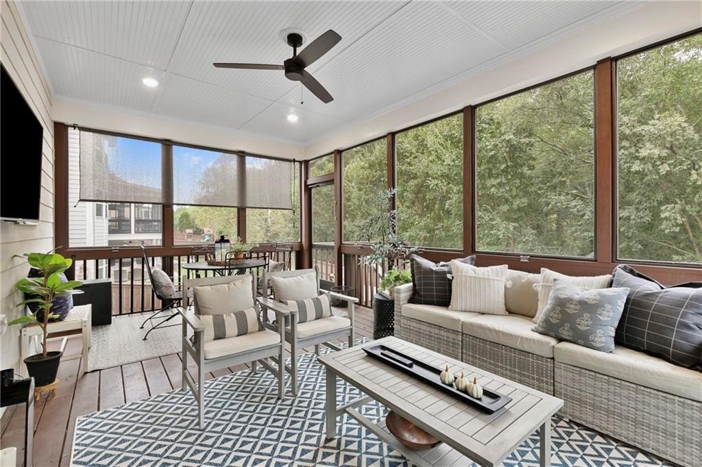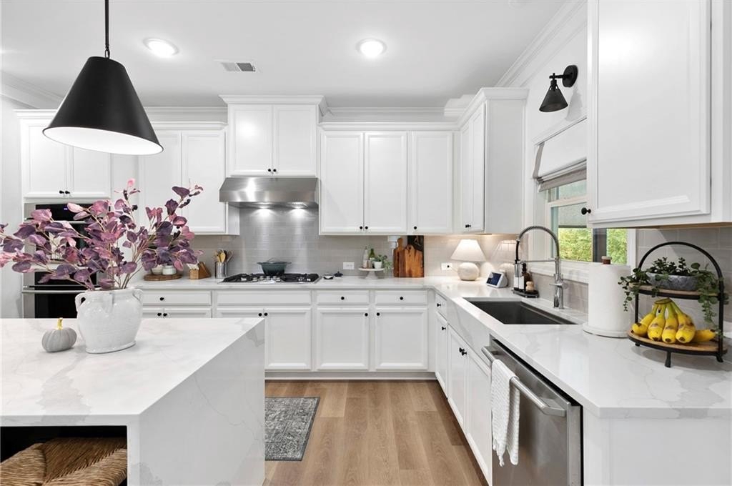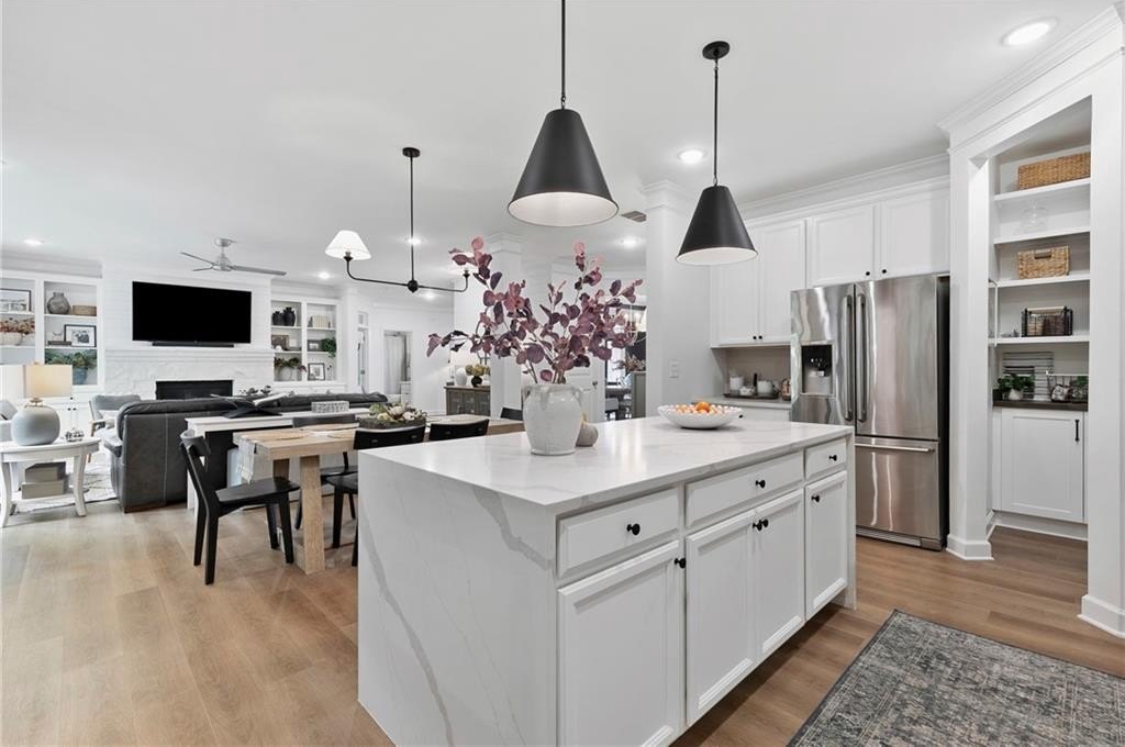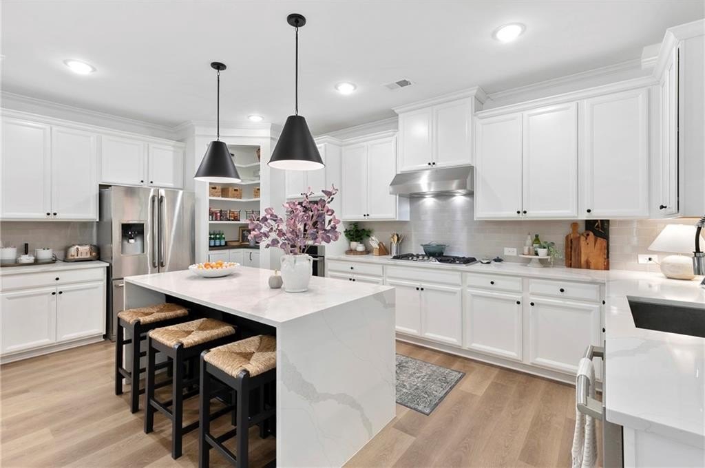 Step into the gourmet kitchen, where a waterfall quartz island and countertops, a 5-burner gas stove, and a custom walk-in pantry with butcher block counter set the stage for effortless entertaining. The heart of the home flows into a bright, open living space and out to the screened porch, overlooking a fenced backyard enhanced by professional landscape lighting and a full irrigation system (front, back, and sides).