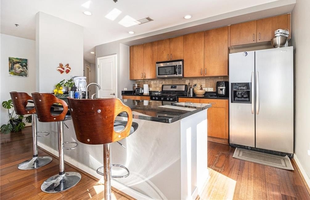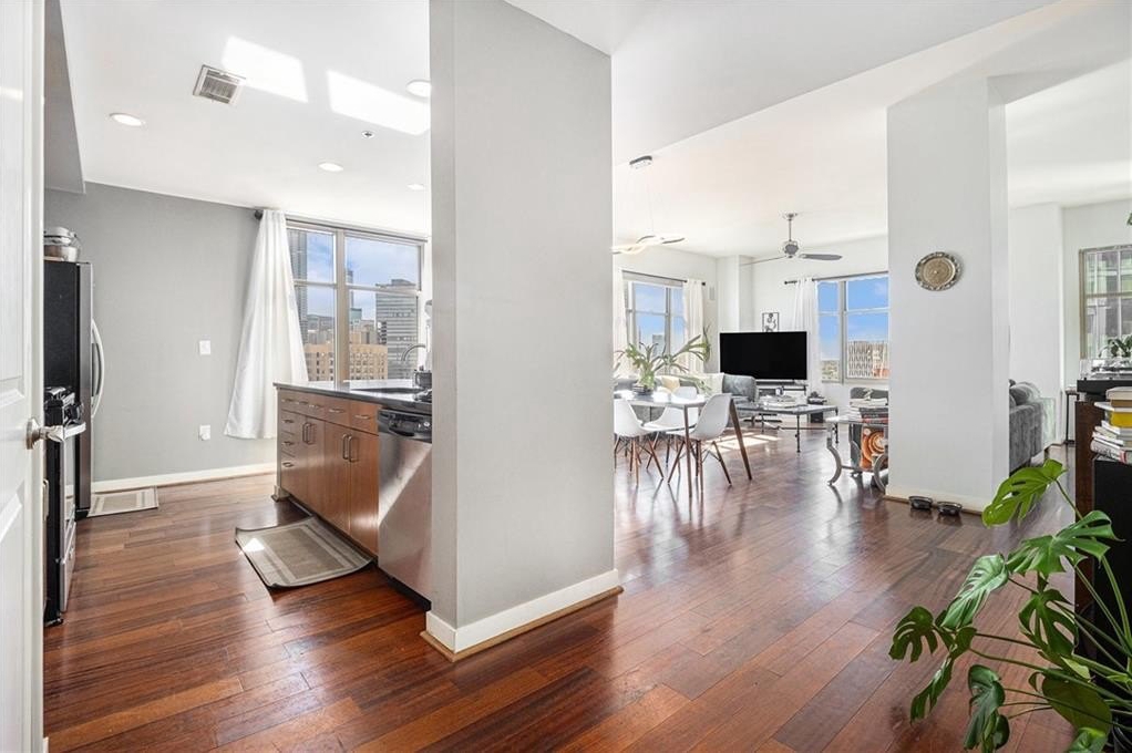 Step inside to an open-concept living and dining area with a seamless flow, perfect for entertaining. The spacious kitchen overlooks the main living space and features a gas range, stainless steel appliances, granite countertops, breakfast bar, and a large pantry. Floor-to-ceiling windows fill the primary suite with natural light and highlight a custom walk-in closet. A generous second bedroom and full bath are conveniently located near the entry foyer, across from a dedicated laundry room.