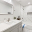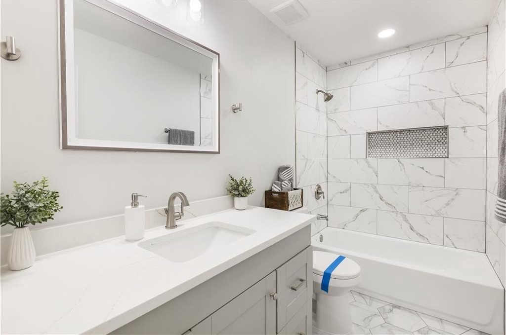 The kitchen? Totally redesigned with sleek quartz countertops, fresh cabinets, and brand-new Frigidaire appliances — so yes, you can finally host dinner without apologizing for outdated tile. Bathrooms got the full spa treatment too, also finished with quartz for that clean, timeless look. The primary bath features a large walk-in shower accented with stylish board & batten towel hanger designs, adding both charm and function.
