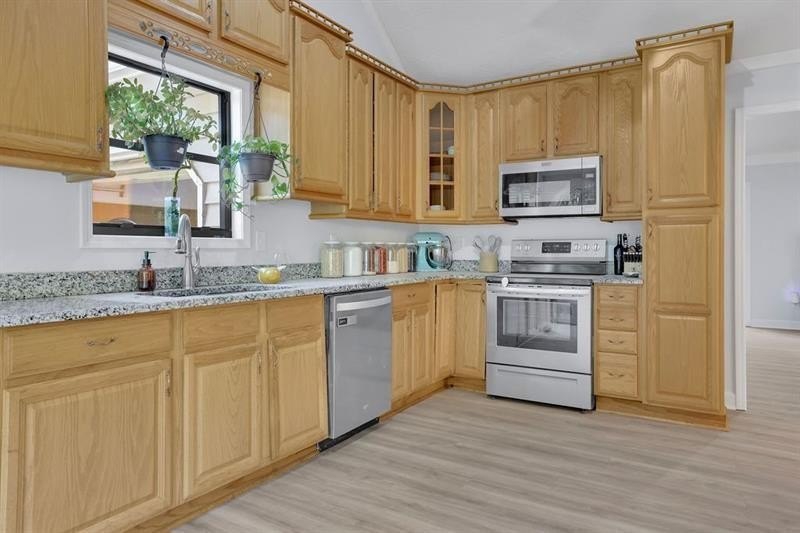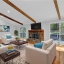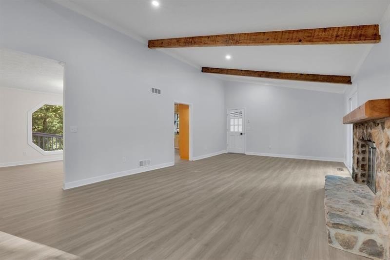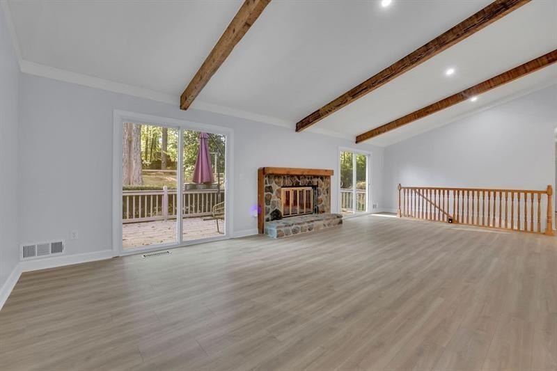 Inside, enjoy new floors, fresh paint, and an airy living room with beamed ceilings, a stone fireplace, and glass doors opening to the deck. The updated kitchen features stainless steel appliances, stone countertops, and unique octagon windows. The primary suite includes a spa-like bath and walk-in shower, with two additional bedrooms and a refreshed guest bath nearby.
