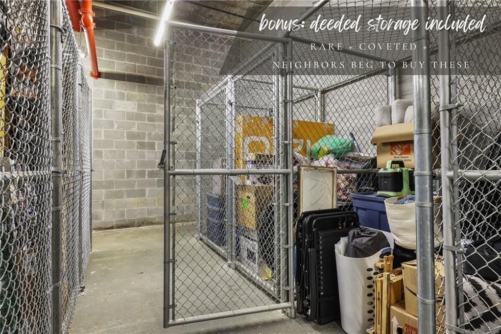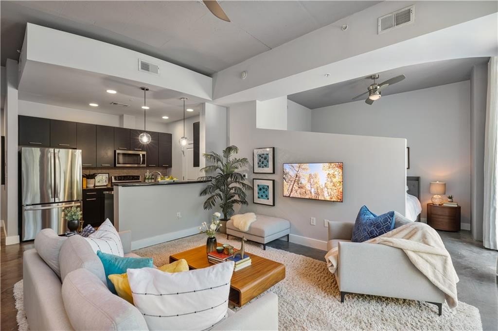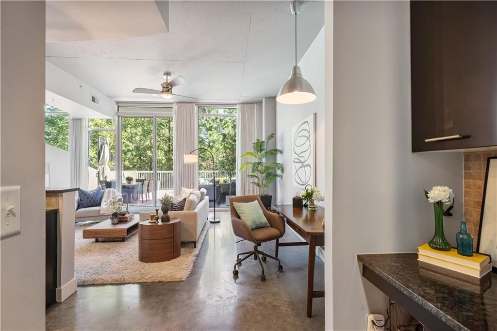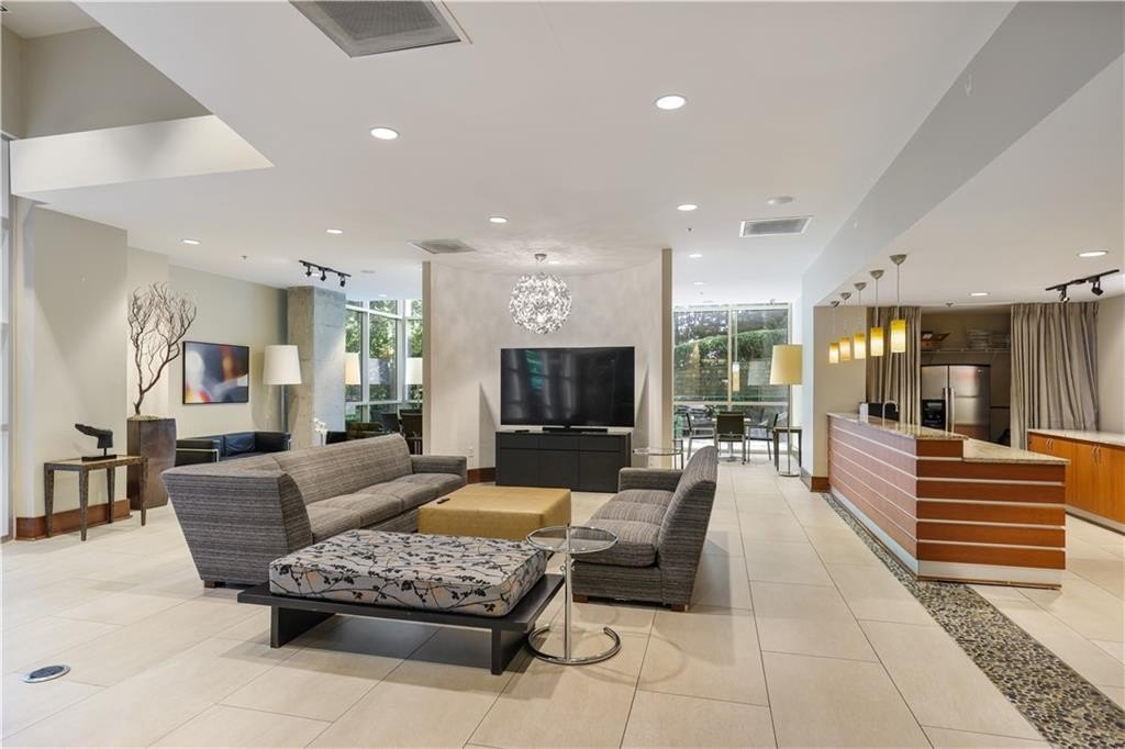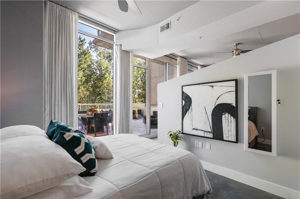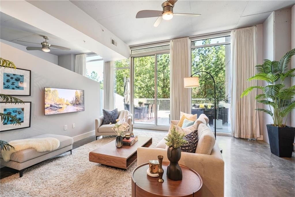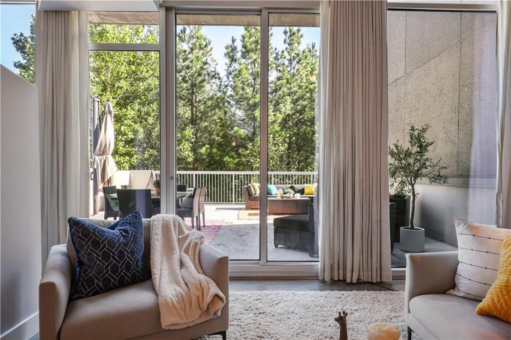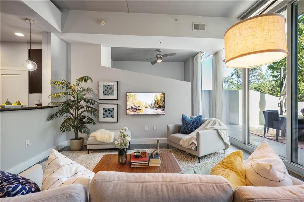 Floor-to-ceiling windows flood the bedroom area with natural light, while the spacious bath features modern fixtures and updated finishes. The walk-in pantry houses a full-size washer and dryer. The entire HVAC system was replaced in 2021, and the refrigerator is brand new as of 2024. Custom floor-to-ceiling drapes frame the views. A deeded 'interior' parking space will shield your car from Georgia weather, and a highly coveted storage unit conveys with the sale. People in this building practically beg their neighbors to sell them storage. This one comes included.