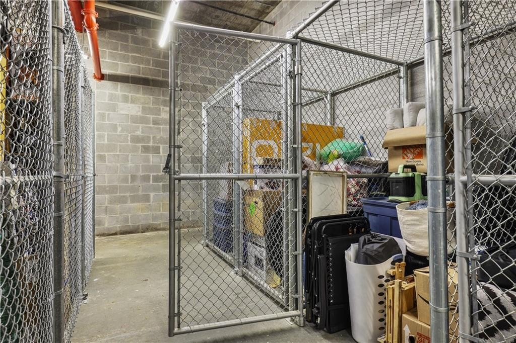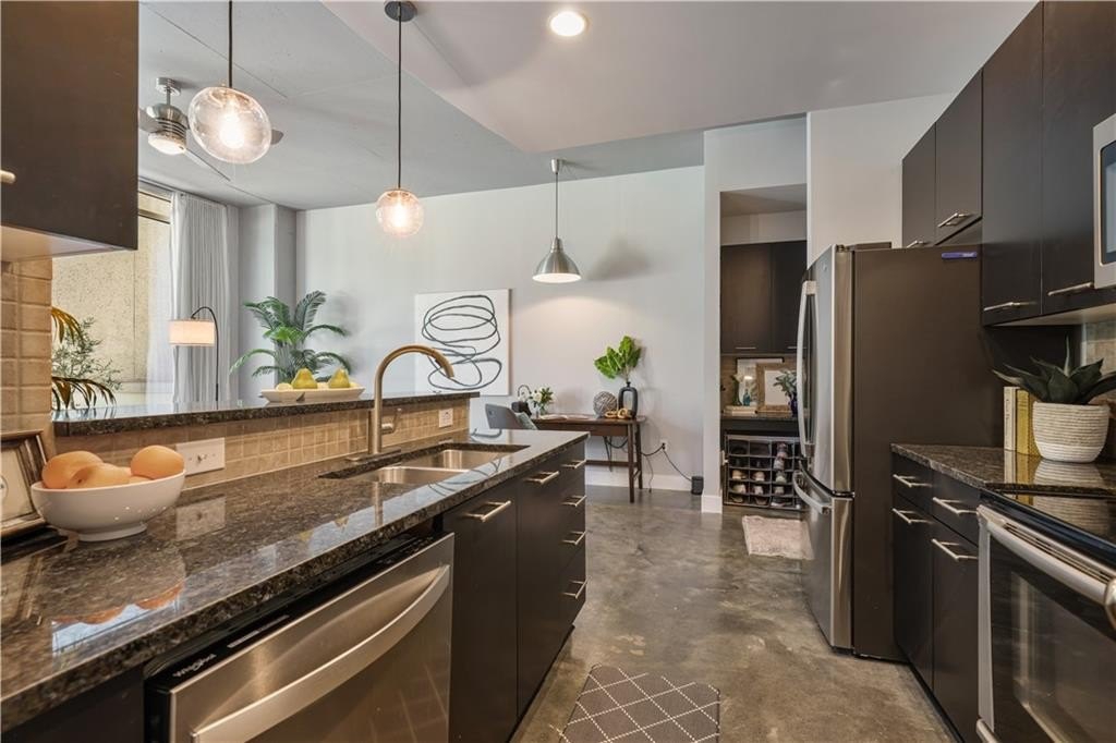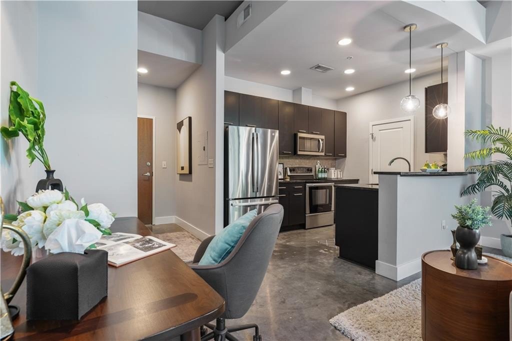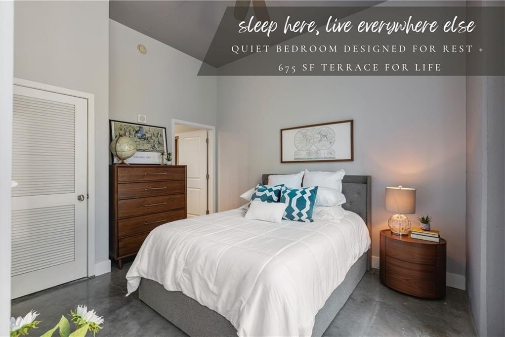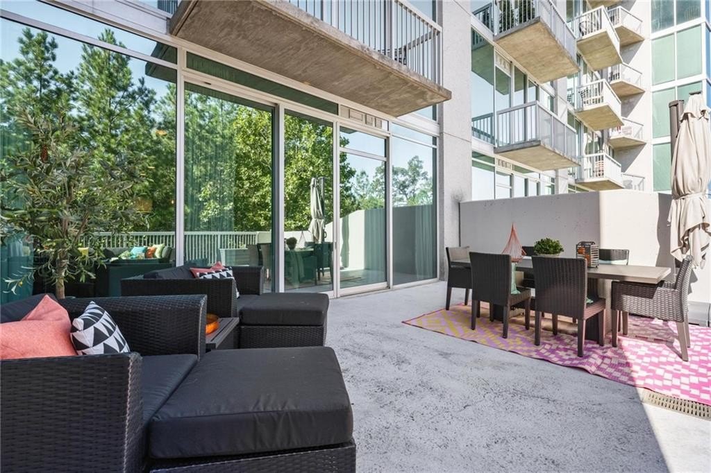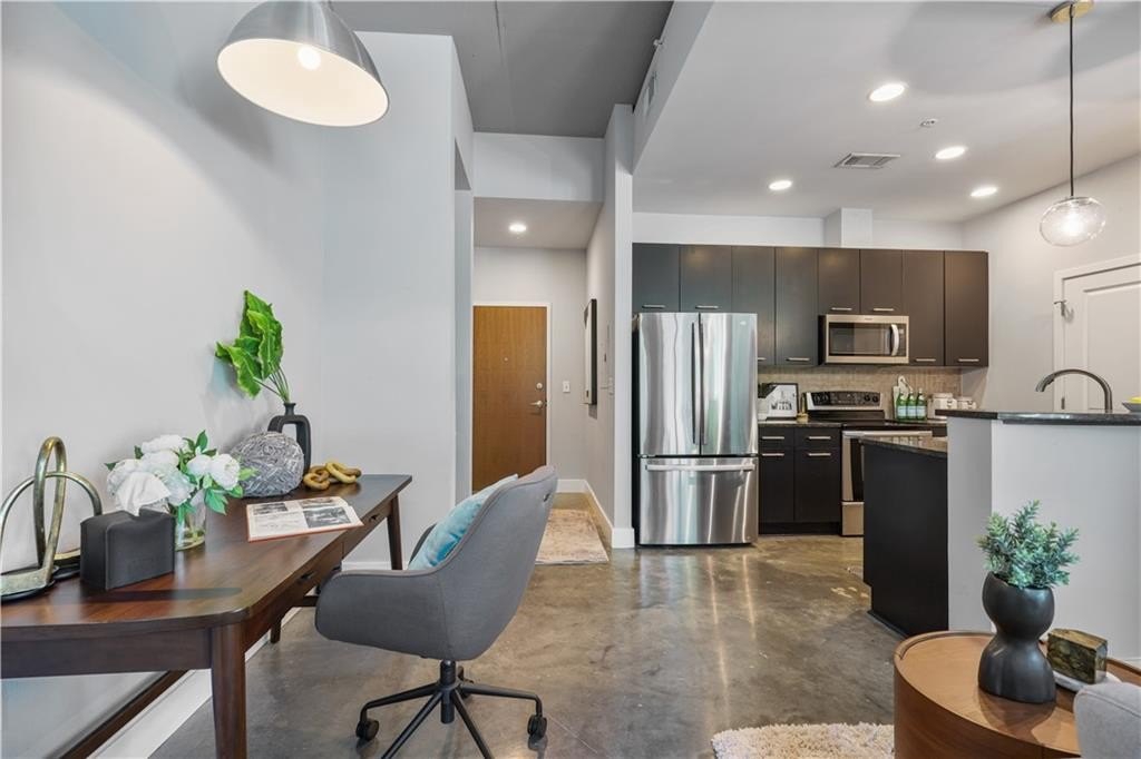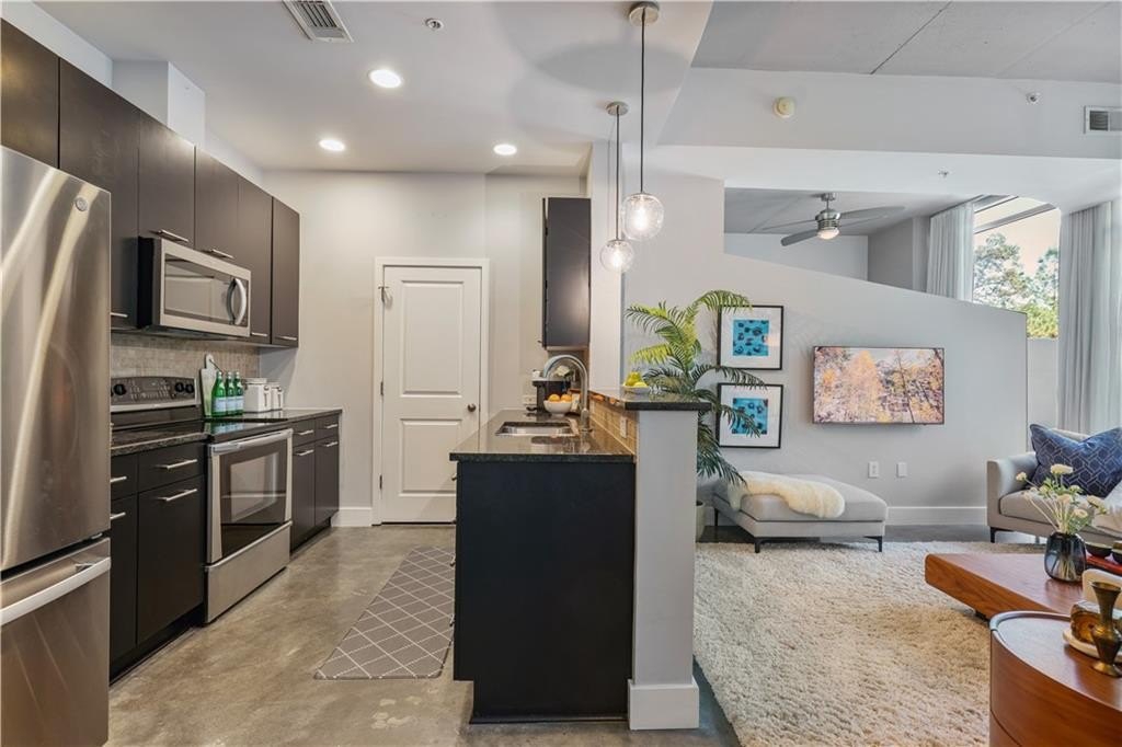 Floor-to-ceiling windows flood the bedroom area with natural light, while the spacious bath features modern fixtures and updated finishes. The walk-in pantry houses a full-size washer and dryer. The entire HVAC system was replaced in 2021, and the refrigerator is brand new as of 2024. Custom floor-to-ceiling drapes frame the views. A deeded 'interior' parking space will shield your car from Georgia weather, and a highly coveted storage unit conveys with the sale. People in this building practically beg their neighbors to sell them storage. This one comes included.