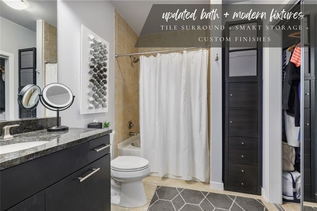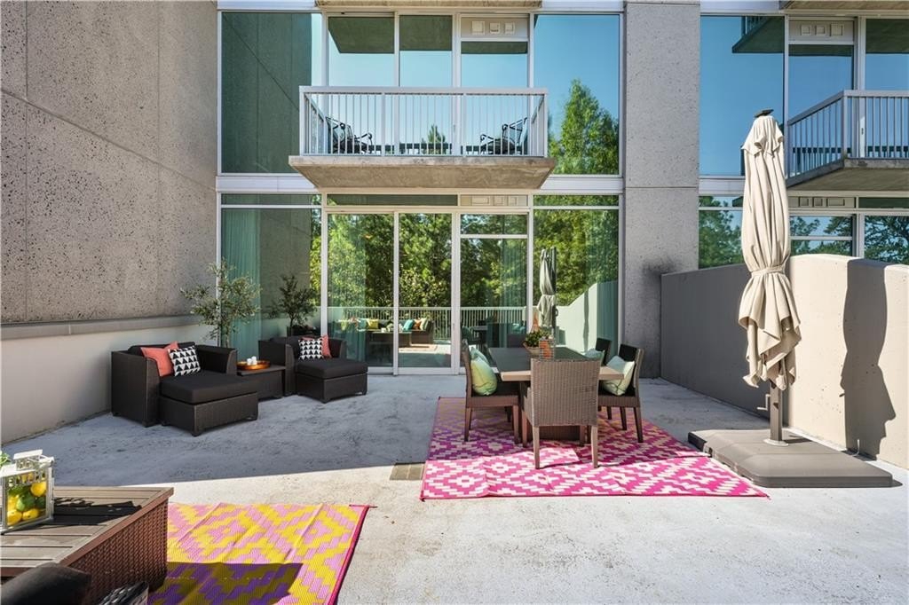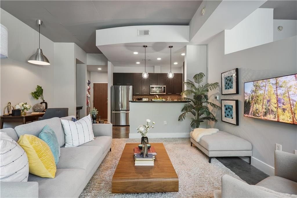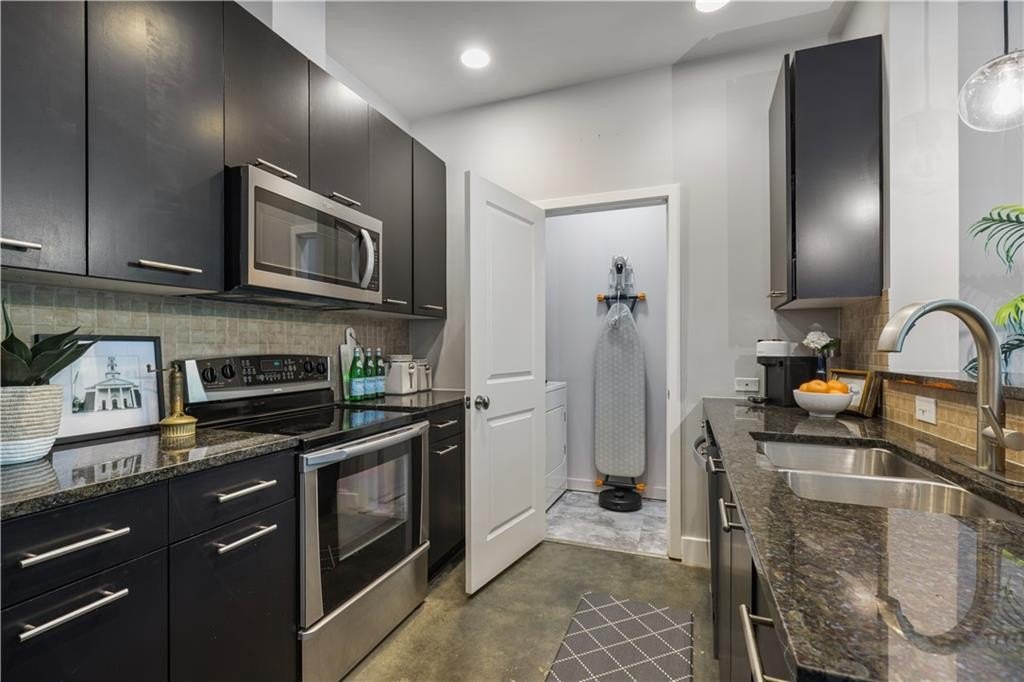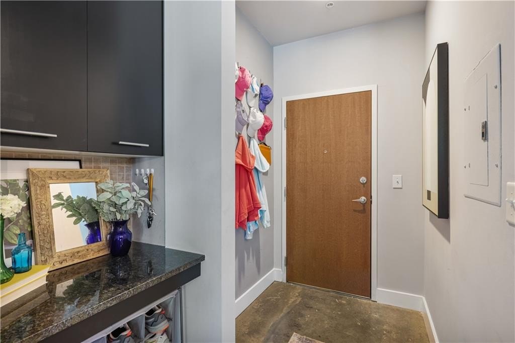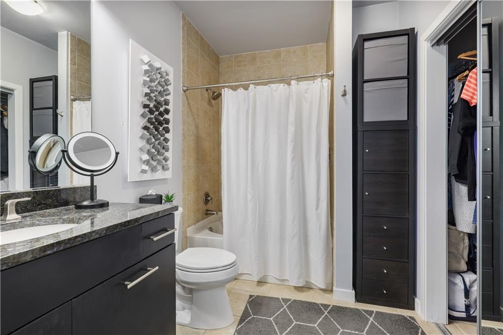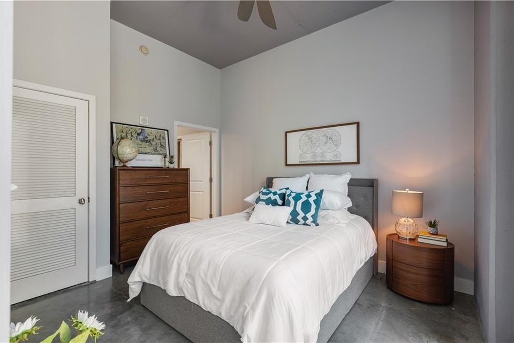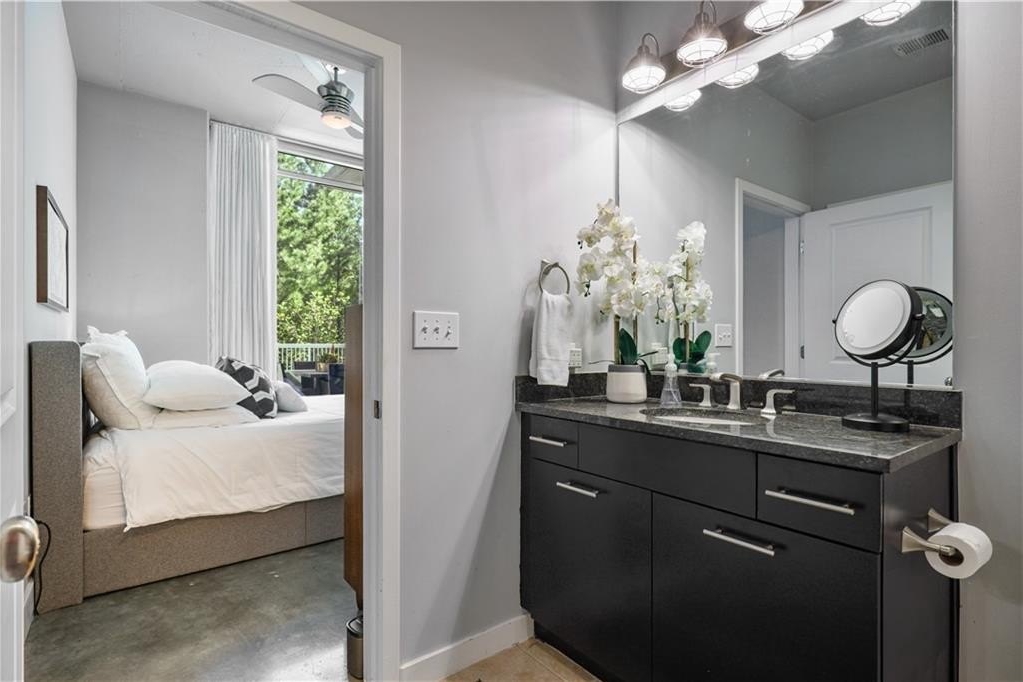Floor-to-ceiling windows flood the bedroom area with natural light, while the spacious bath features modern fixtures and updated finishes. The walk-in pantry houses a full-size washer and dryer. The entire HVAC system was replaced in 2021, and the refrigerator is brand new as of 2024. Custom floor-to-ceiling drapes frame the views. A deeded 'interior' parking space will shield your car from Georgia weather, and a highly coveted storage unit conveys with the sale. People in this building practically beg their neighbors to sell them storage. This one comes included.