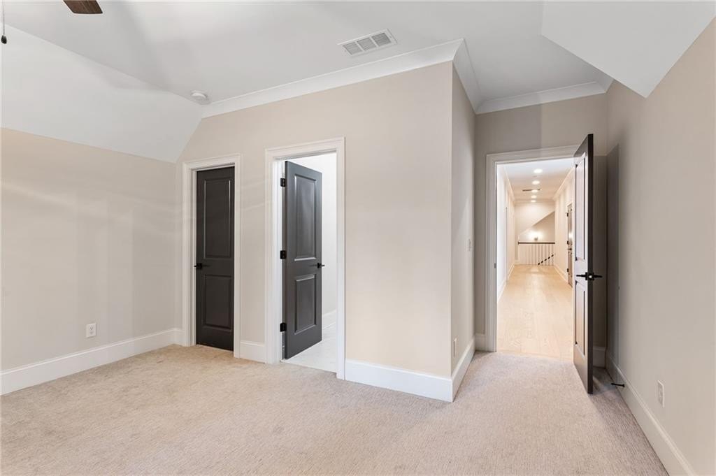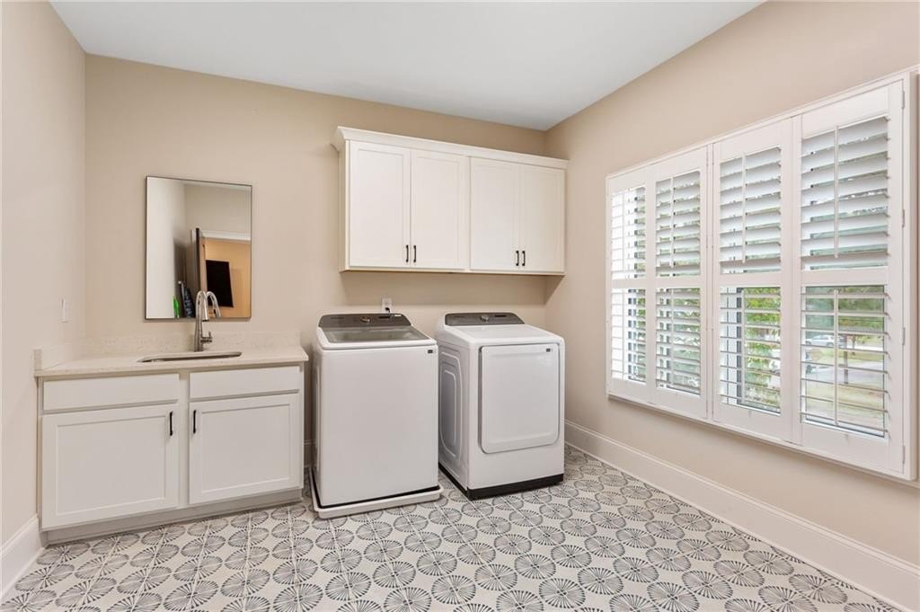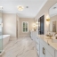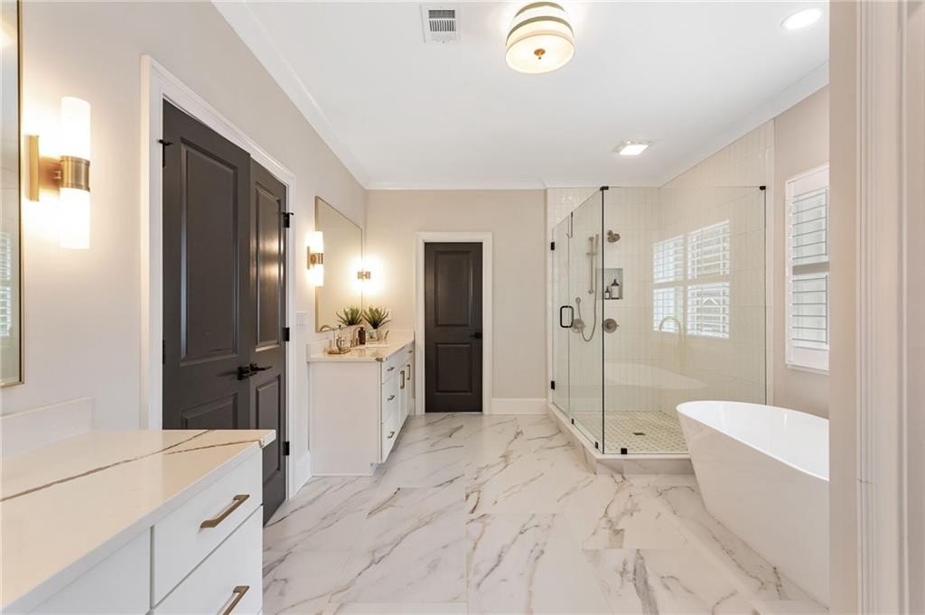 Upstairs, a central loft / family room offers flexible space for play, media, or relaxation. The primary suite is oversized and serene, featuring dual vanities, a stand-alone soaking tub, glass-enclosed step-in shower, and a custom closet system. Additional bedrooms are generously sized, each connecting to full baths. A spacious laundry room, complete with sink, is ideally located near the bedrooms.