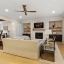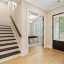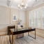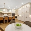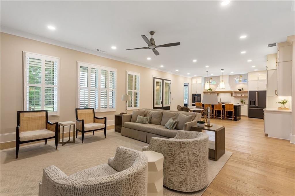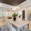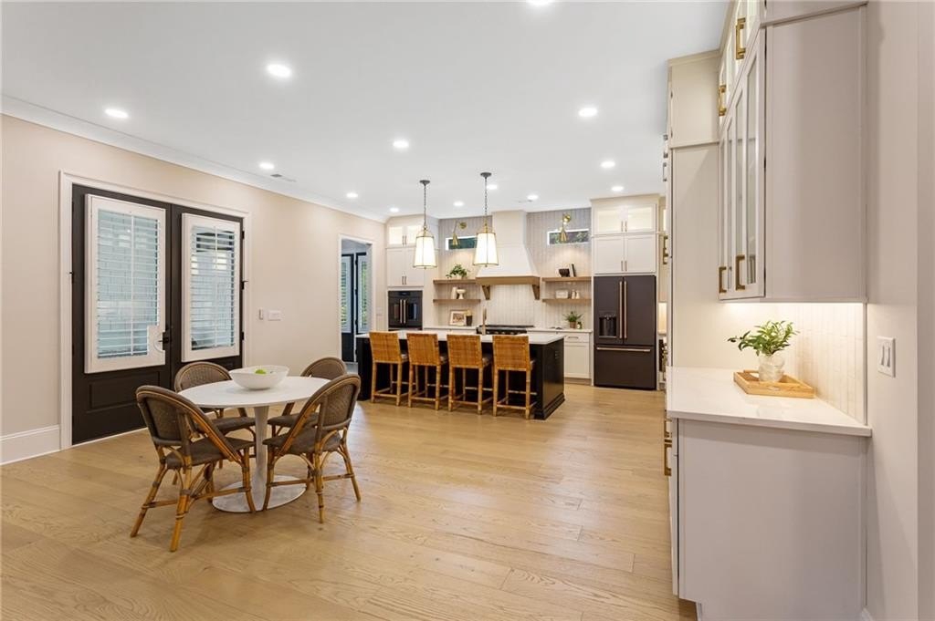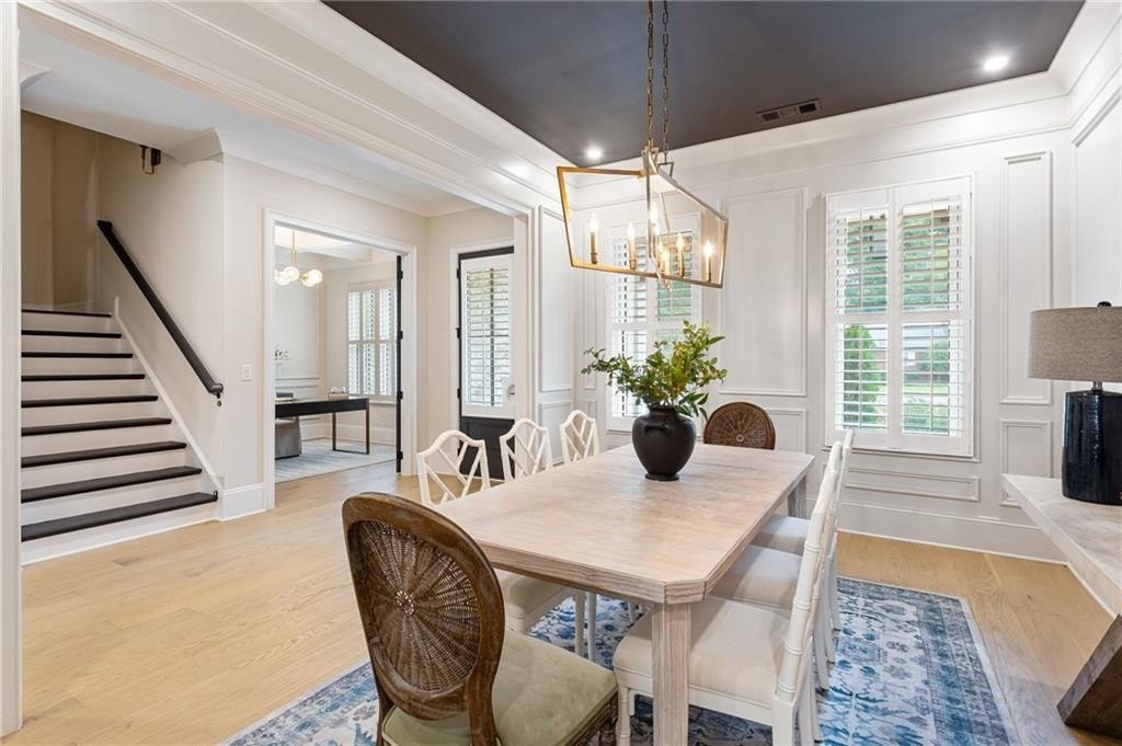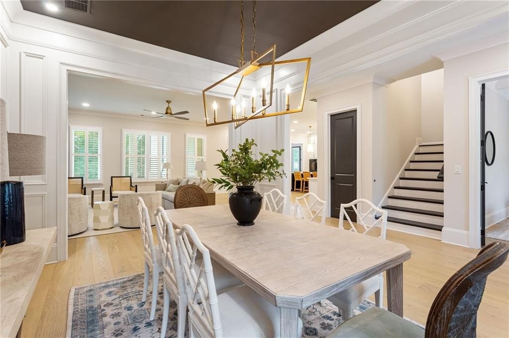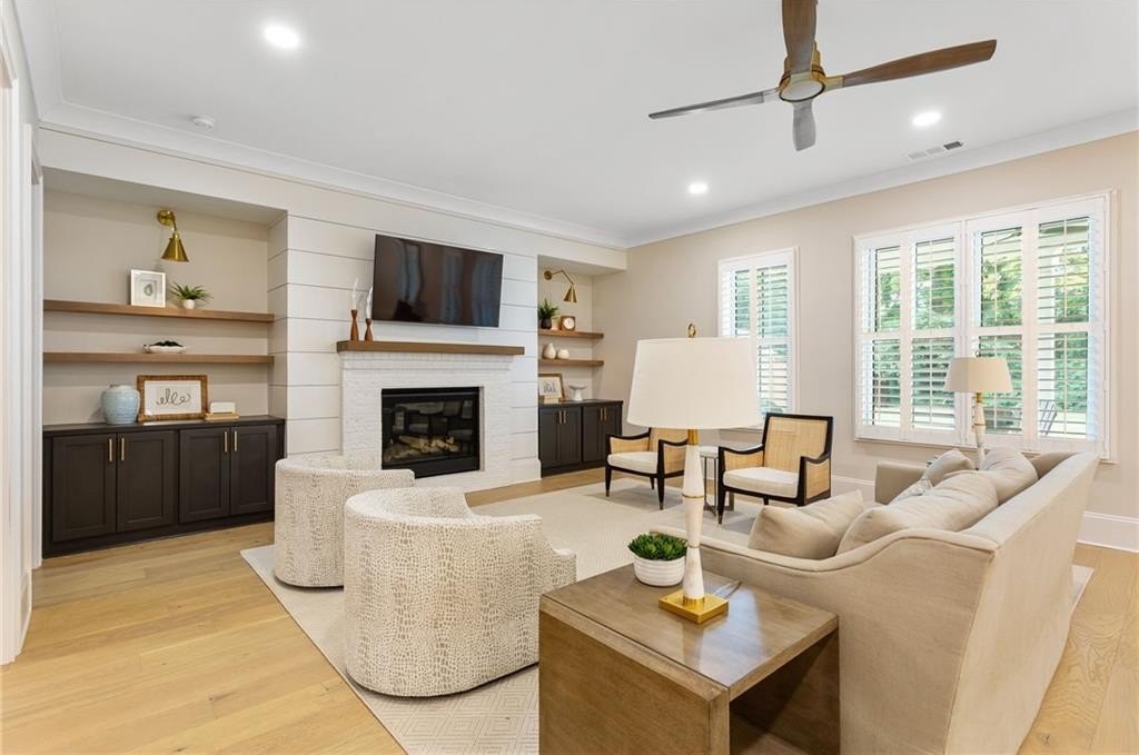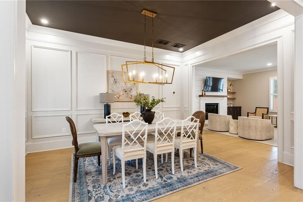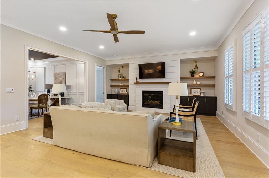 - A formal dining room and elegant living room with fireplace and custom built-in cabinetry.