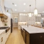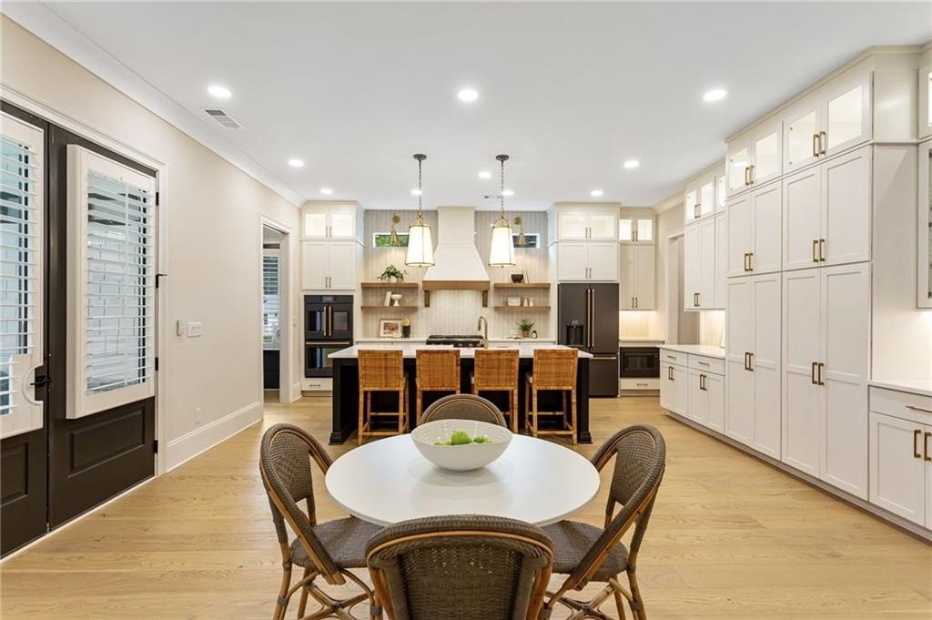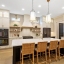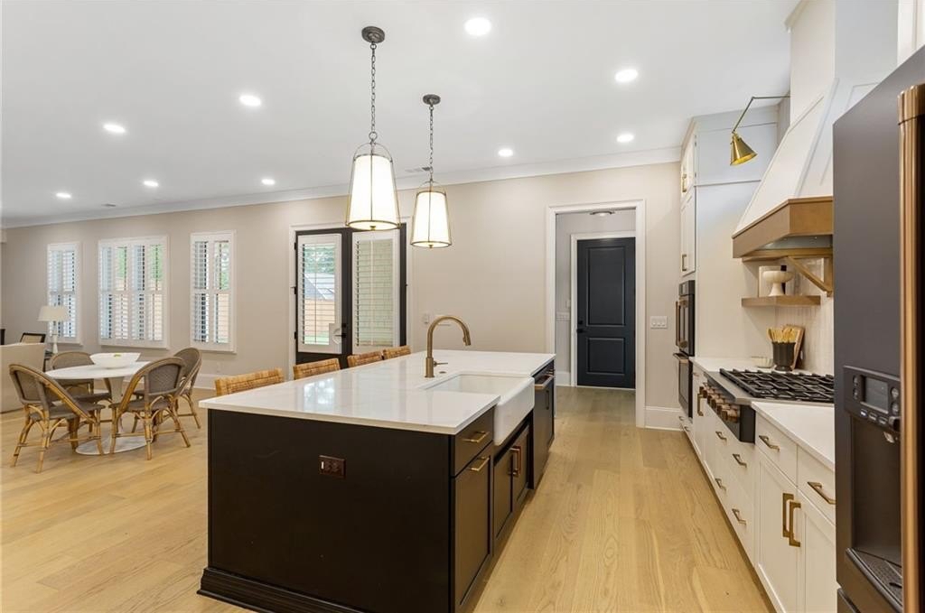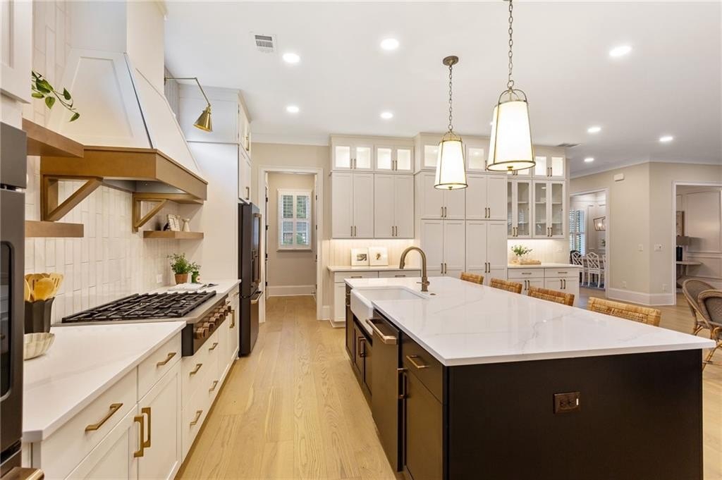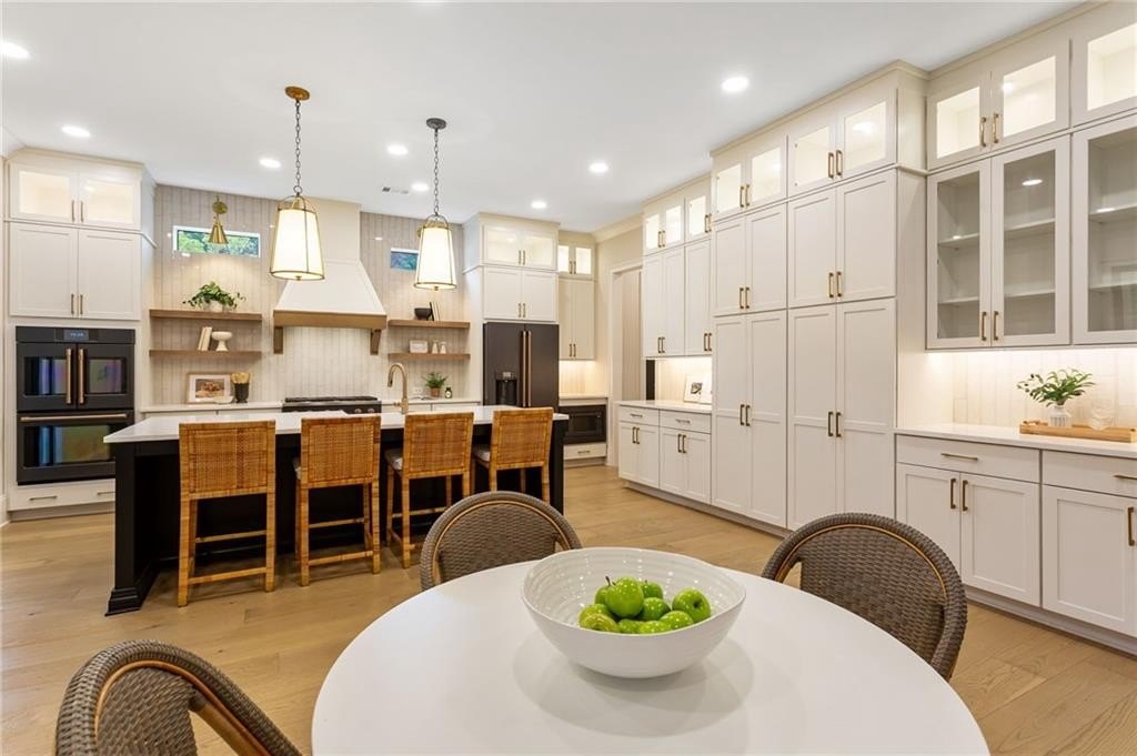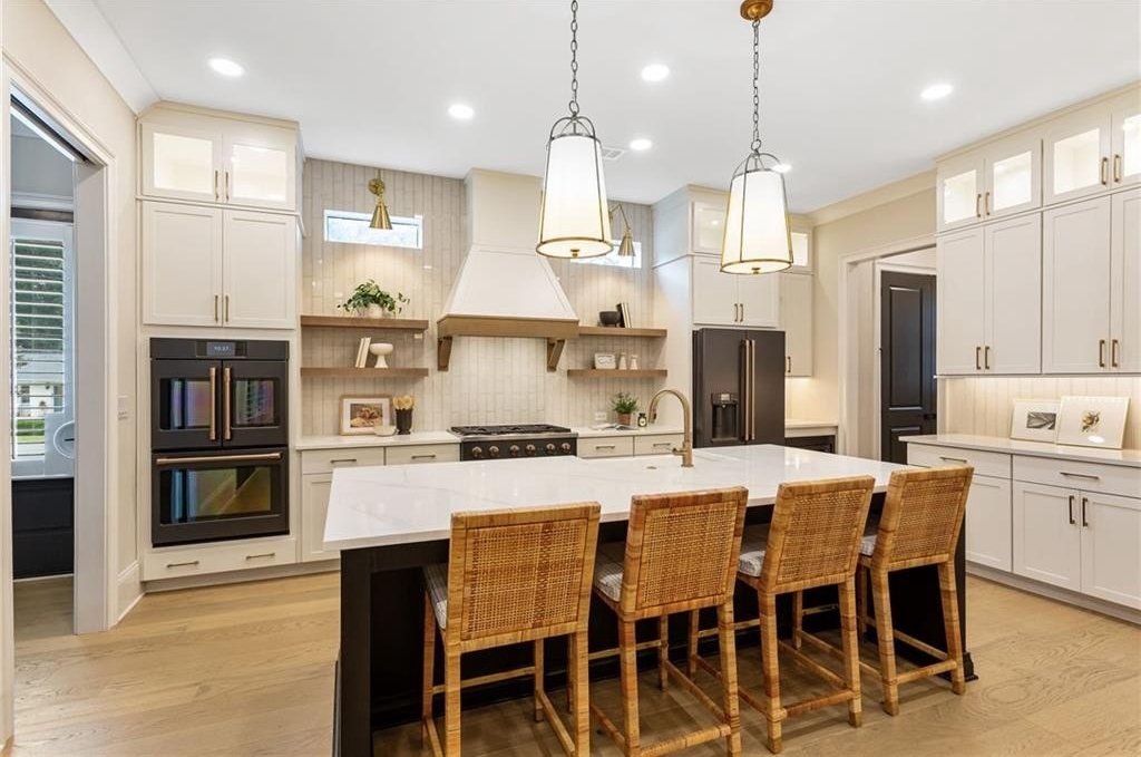 - A gourmet kitchen boasting abundant cabinetry, double ovens, a central island with seating, and room for a coffee bar.