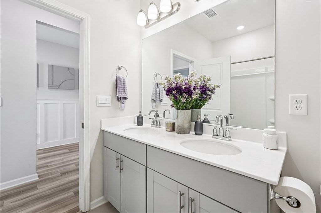 Hardwood floors lead you through the foyer and by two large secondary bedrooms as you enter the home. There is a flex room that could be used as a play room, media room, office, or secondary family room. A spacious, open kitchen with an oversized granite island greets you as you enter into the living areas and a large great room with gas log fireplace.