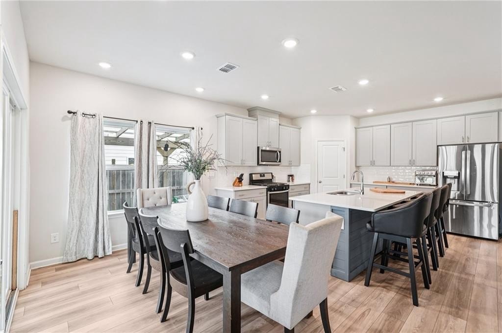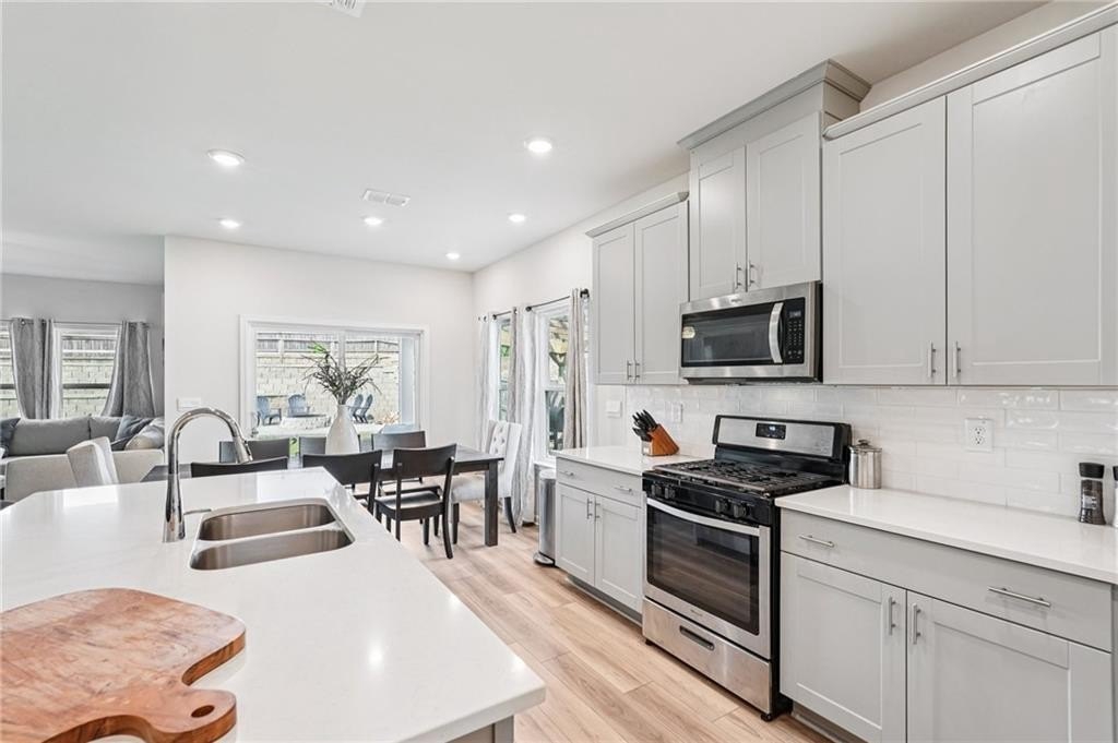 Kitchen features an oversized island with quartz countertops, stainless steel appliances, and large eat-in kitchen.