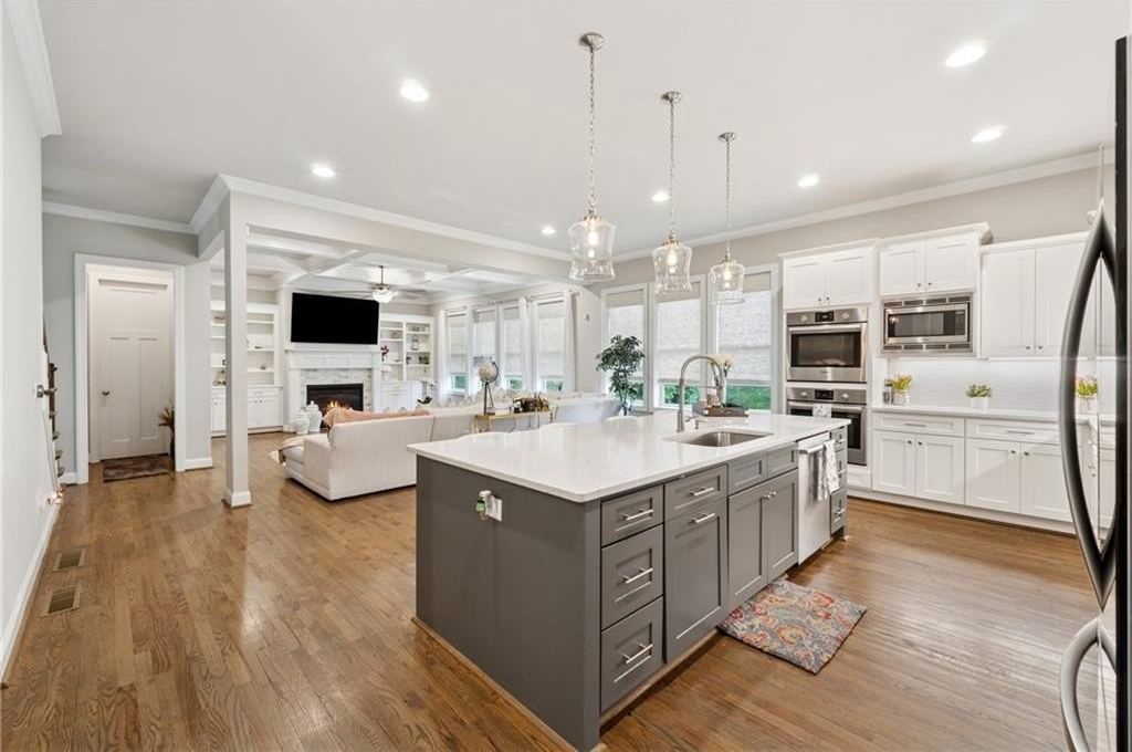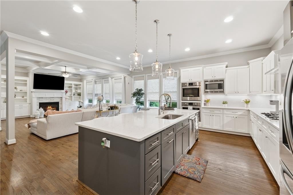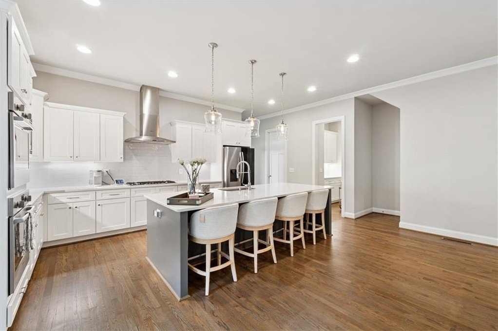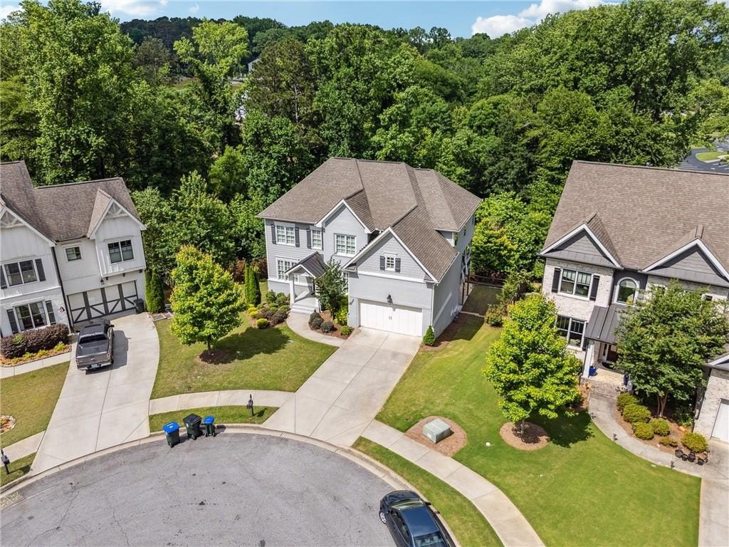 Welcome to Huntley Estates, a collection six thoughtfully designed homes situated around a private cul-de-sac abutting a beautiful wooded area. Priced well below appraised value, this 4-bedroom, 4.5-bathroom custom craftsman has been impeccably maintained by its current owner. The main level welcomes you with rich hardwood floors that seamlessly flow between the dining, sitting, and living areas, anchored by a chef-inspired kitchen featuring Bosch appliances-double ovens and a 5-burner gas cooktop-paired with a massive granite island, a huge walk-in pantry, and a dry bar perfect for entertaining. The generous living space includes window treatments, coffered ceilings, a gas fireplace, and beautiful built-ins. Upstairs, you'll find 4 spacious bedrooms, each with an ensuite bathroom. The primary suite features a frameless glass shower, free-standing tub, and plenty of closet space. The cherry on top of this ideal floor plan is the additional 1,700sqft of potential living space in the unfinished, daylight basement, stubbed and ready for your designs. Step outside to your quiet escape, equipped with tasteful hardscaping and a fire-pit. Additional features include main and terrace level patios, a 2-car garage, mudroom, and plantation shutters.