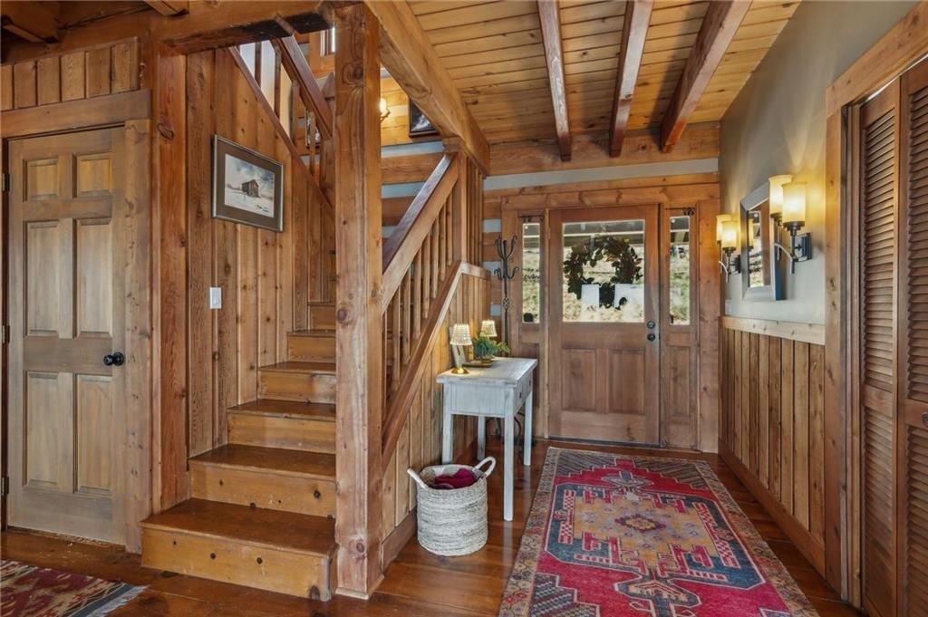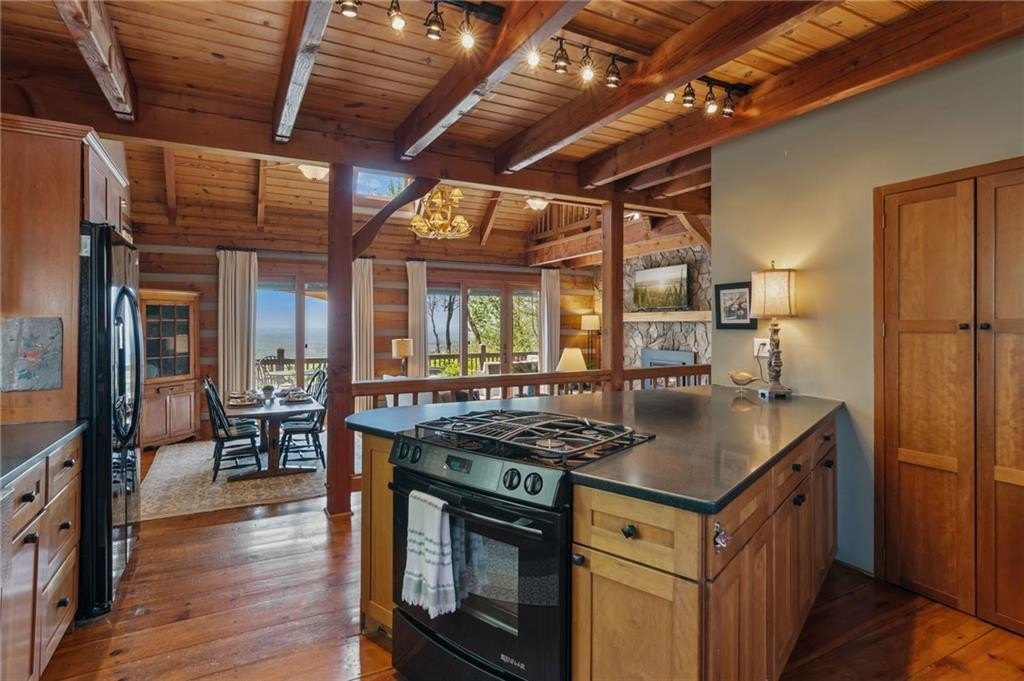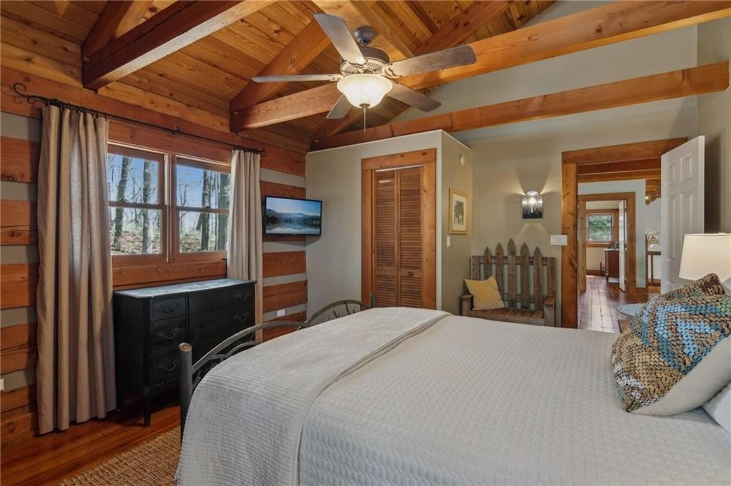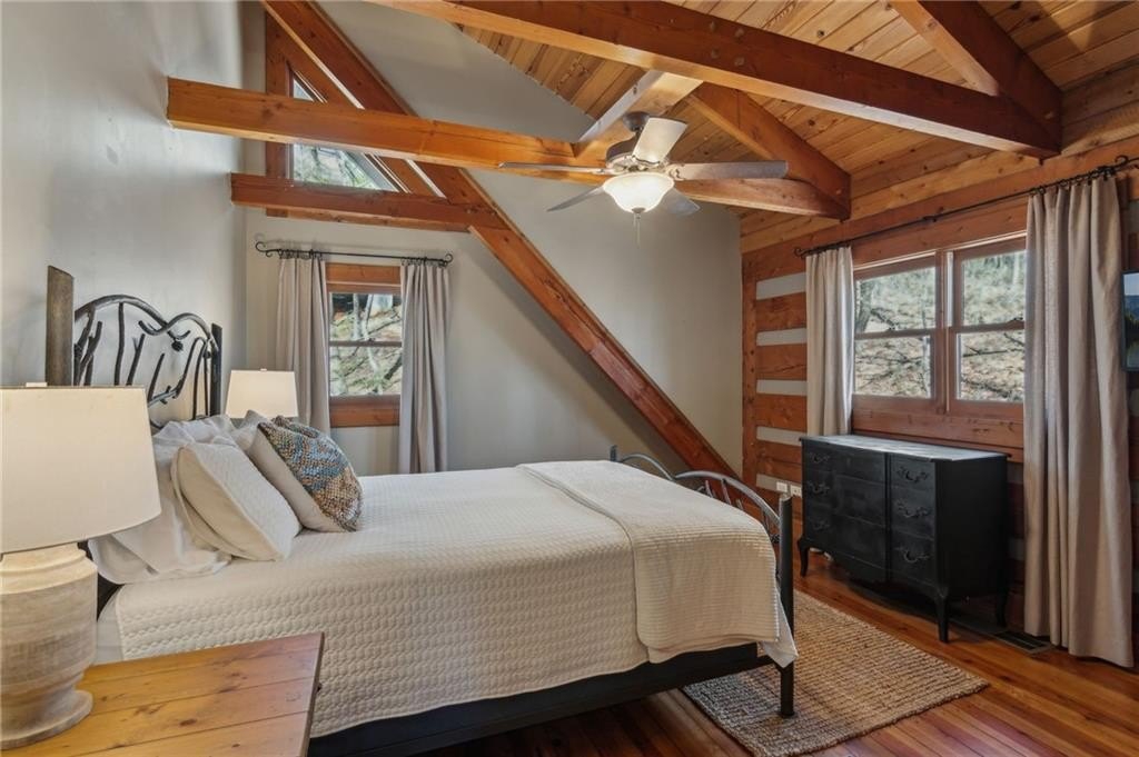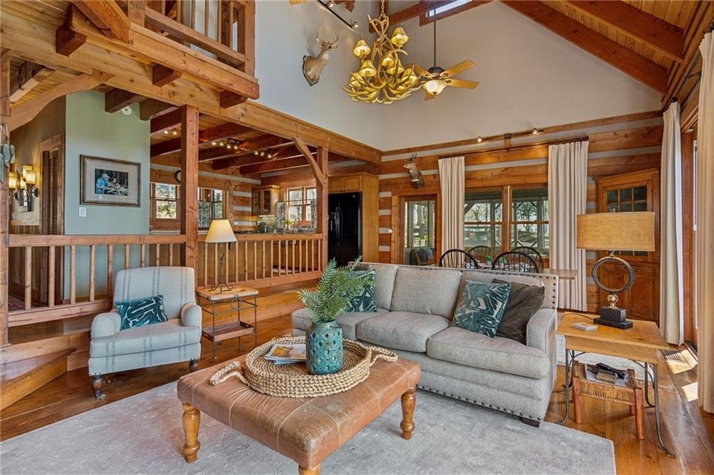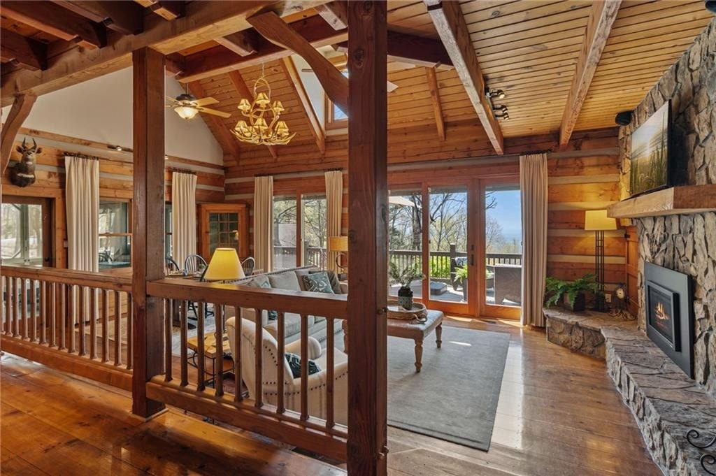 This beautifully updated 4-bedroom, 3.5-bath log home offers the perfect blend of rustic charm and modern comfort. The great room features a cathedral ceiling with solid wood beams and wide plank hardwood floors set the tone for the open main level, where the floor-to-ceiling stone fireplace creates a perfect mountain home, while multiple living areas provide plenty of room for family and guests.