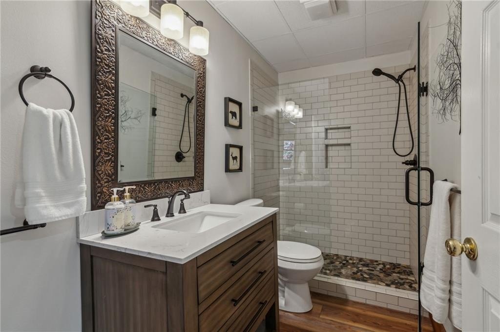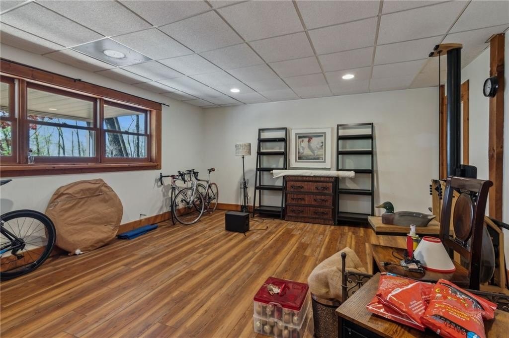 The oversized master suite on the main level features its own fireplace and updated bath with heated floor. The open kitchen features gas stove, dishwasher, refrigerator and a large island with granite countertop that overlooks the dining area, great room and screened porch. The upper level has two large bedrooms and a full bath. The terrace level has a large recreation room, very large bedroom and full bath.