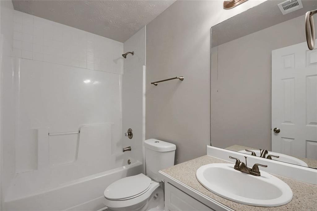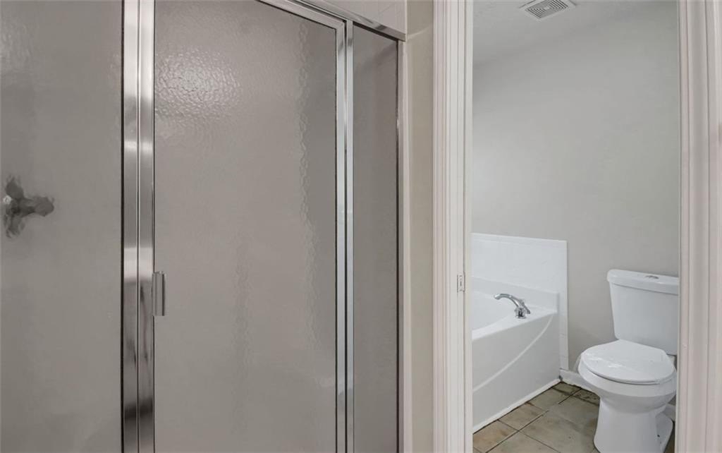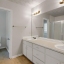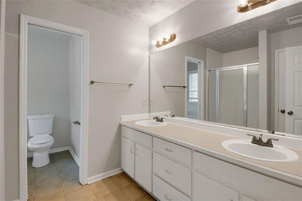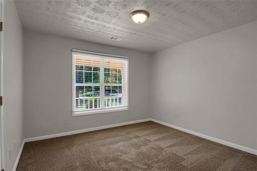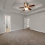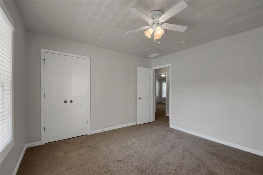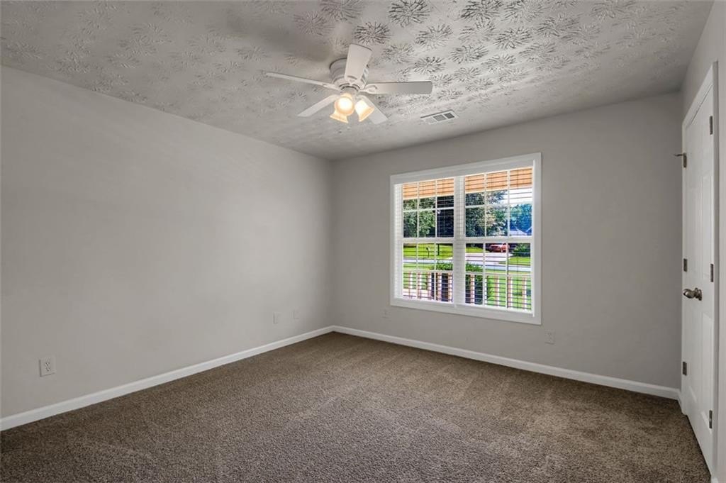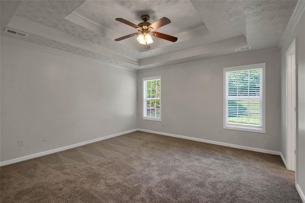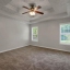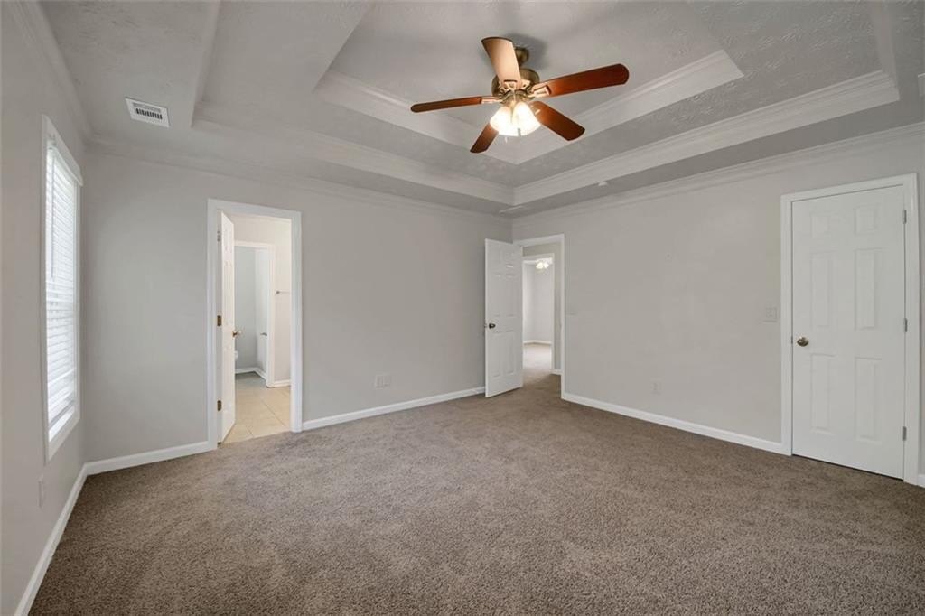 The primary suite provides a peaceful retreat with calming gray tones, plush carpet, ceiling fan, and natural light. The ensuite bath offers both comfort and style, creating a true sanctuary.