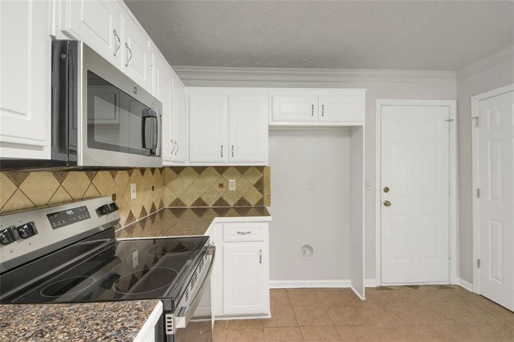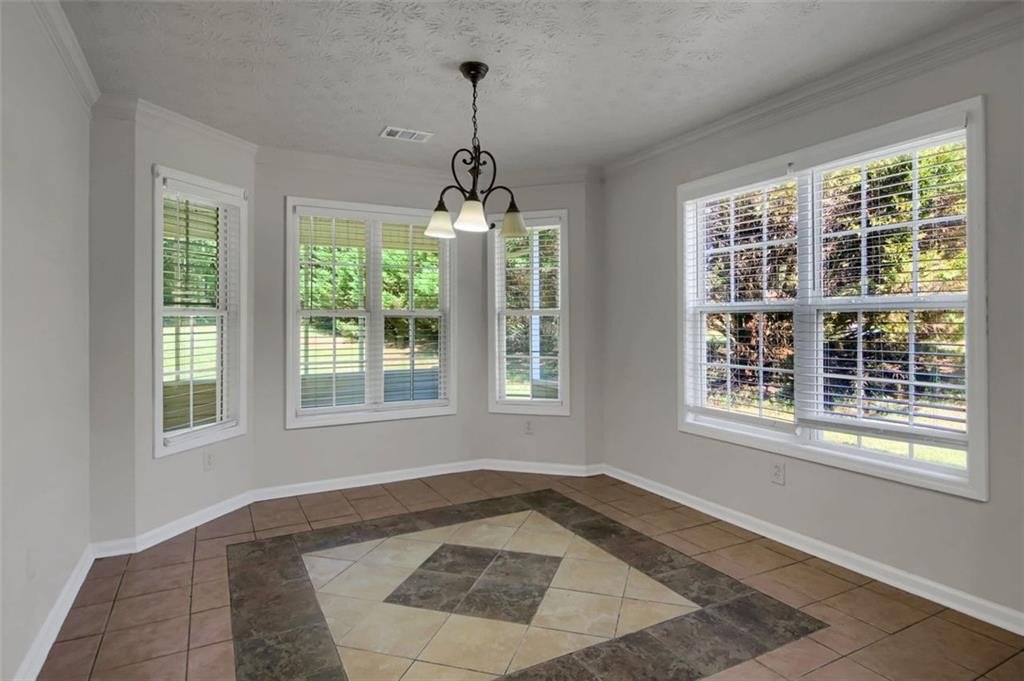The heart of the home is the updated kitchen, showcasing white cabinetry, granite countertops, stainless steel appliances, and a sunny window above the double sink. Adjacent is a cheerful dining area, enhanced by a stylish patterned tile floor and windows that brighten every mealtime.