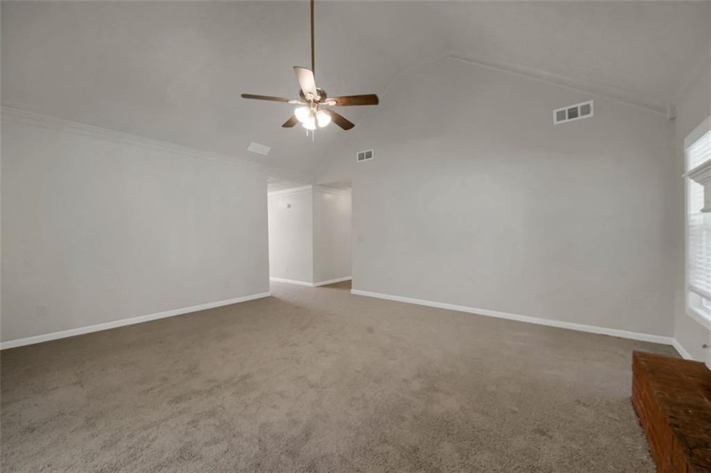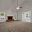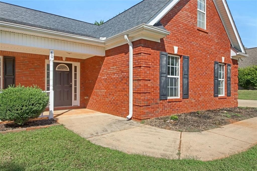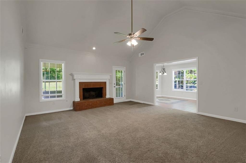 The red brick façade accented by crisp white trim and a welcoming covered front porch set the tone as you step inside. The spacious living room offers a cozy fireplace with a brick hearth, soft gray carpet, and abundant natural light—perfect for relaxing or entertaining.