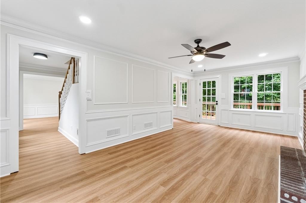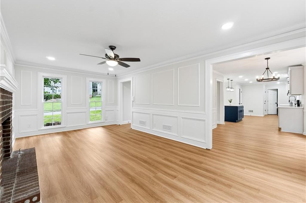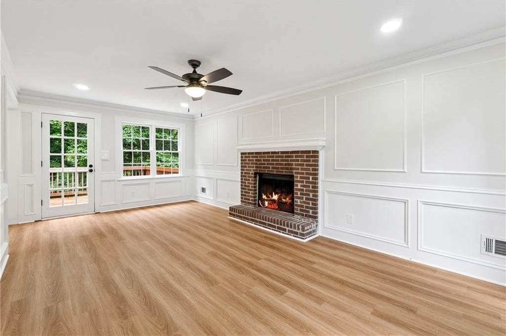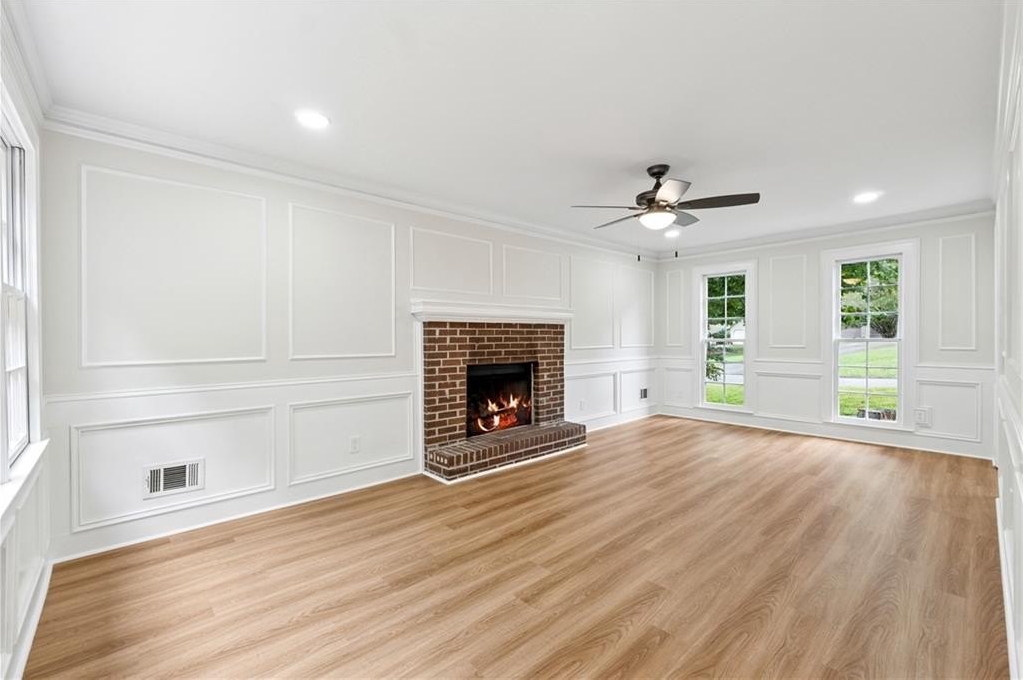 Living spaces streaming natural light. Family room with a cozy brick fireplace,