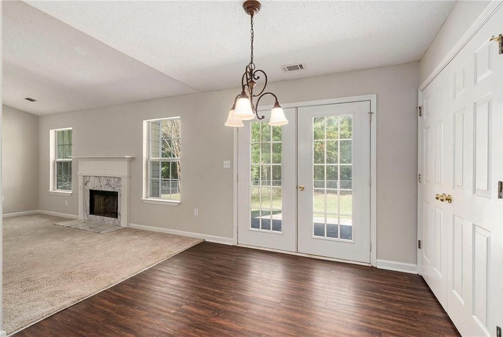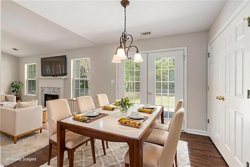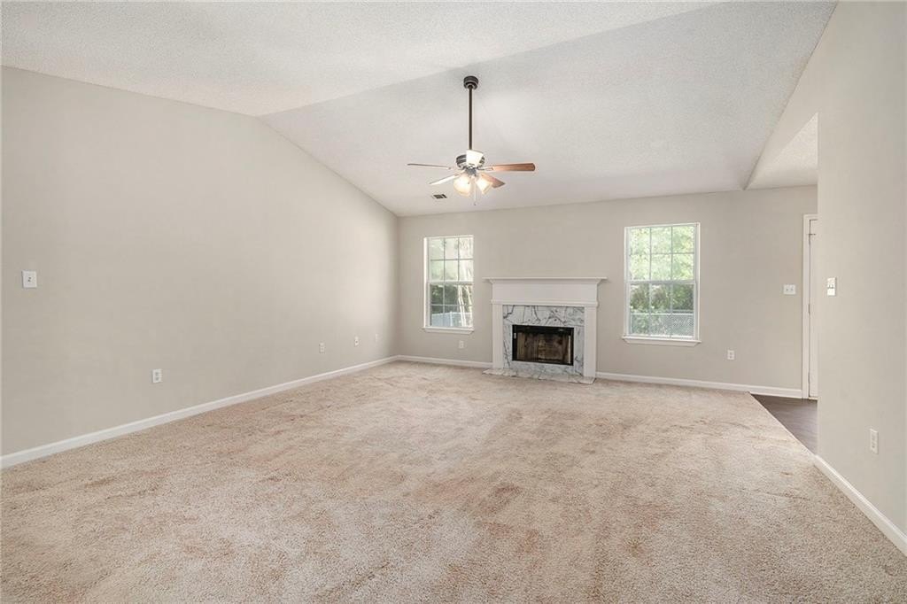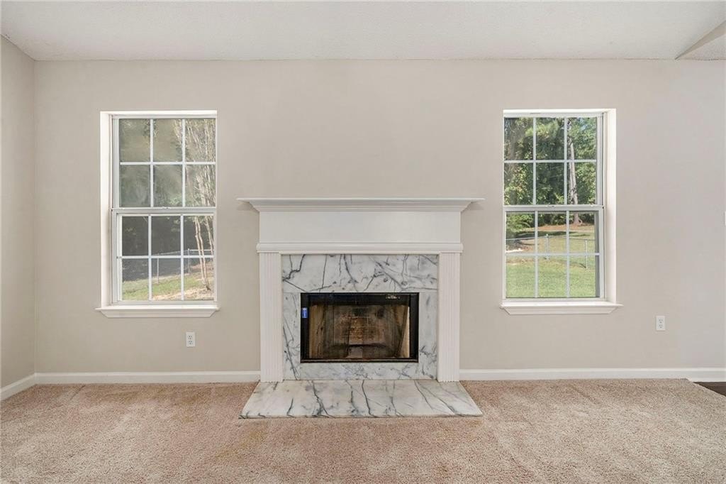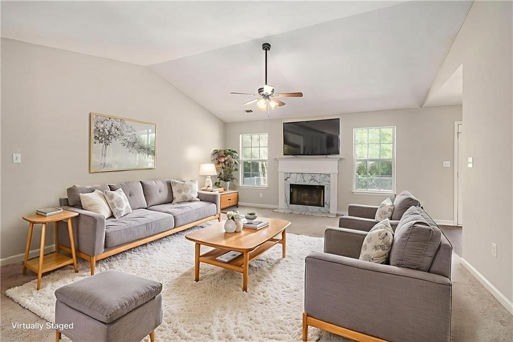 complete with a cozy fireplace and a view straight out to the patio — ideal for relaxing nights in