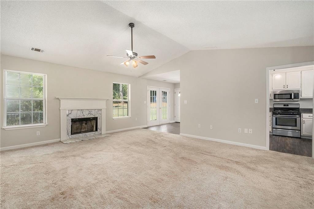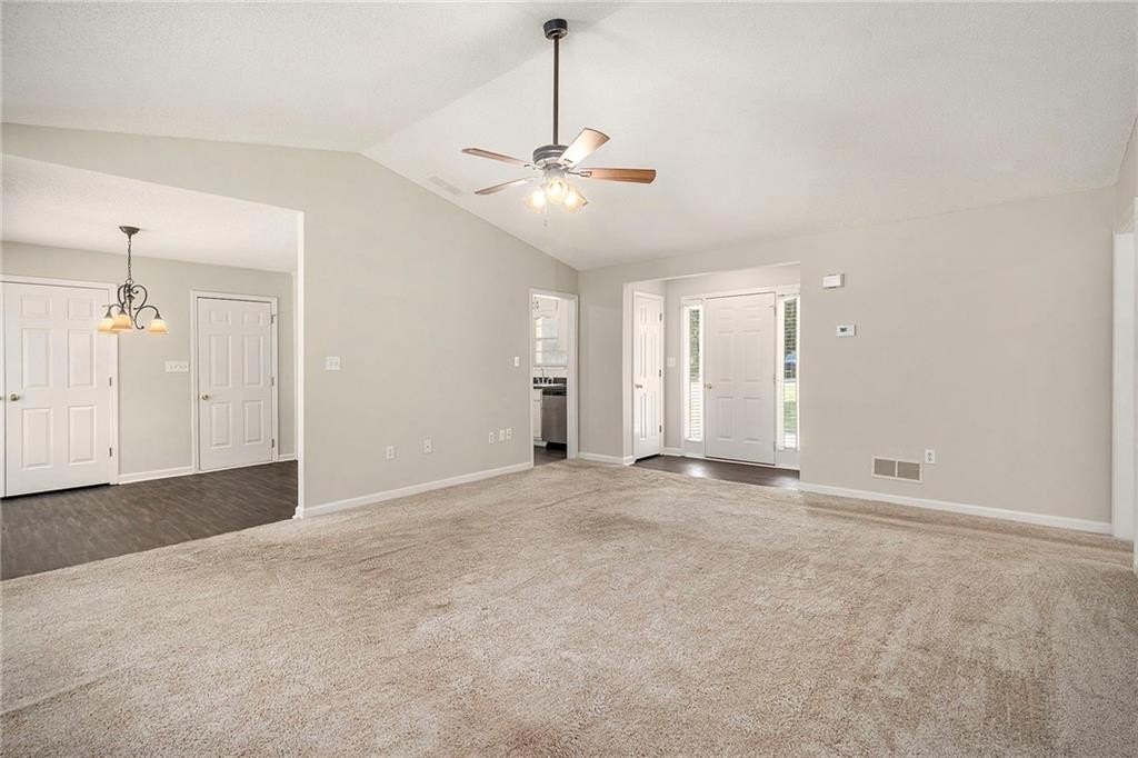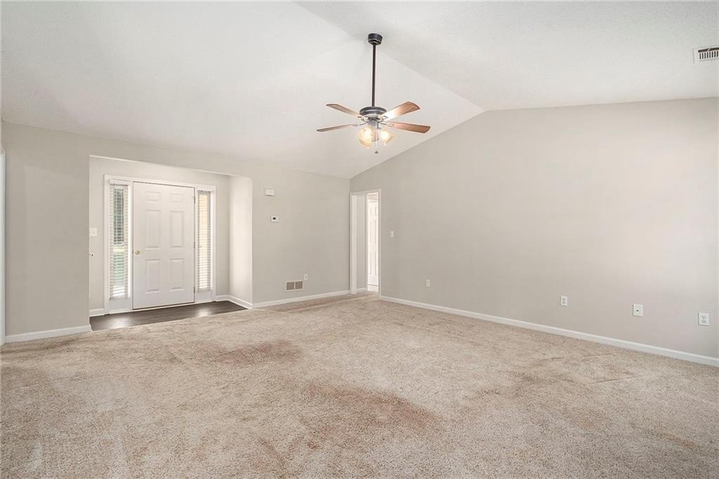 Step inside to a bright, open-concept living and dining area, where vaulted ceilings and natural
