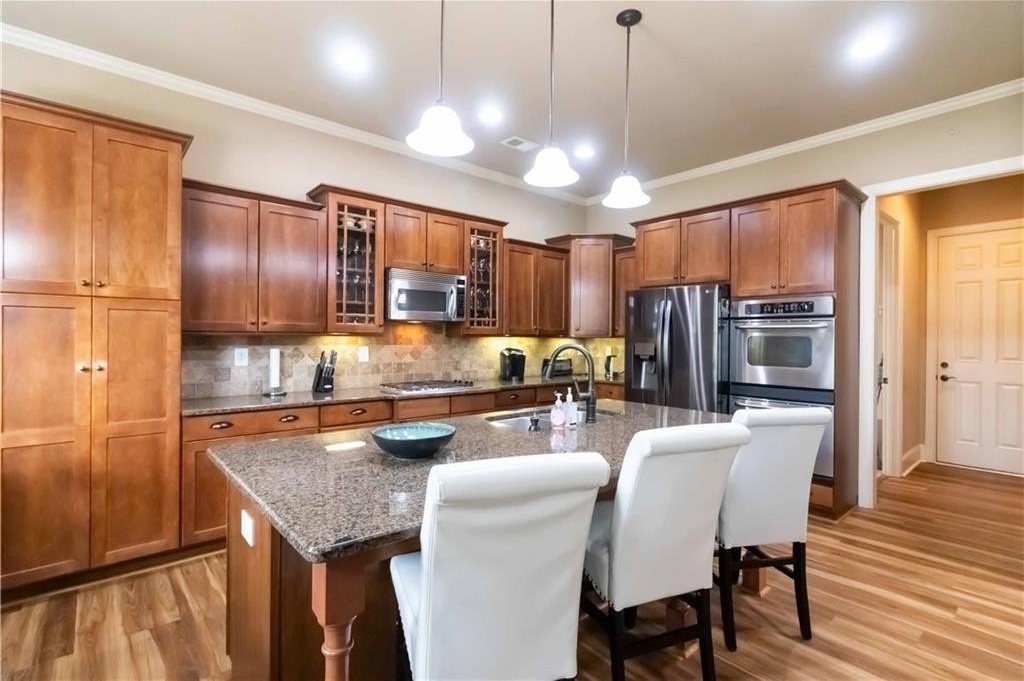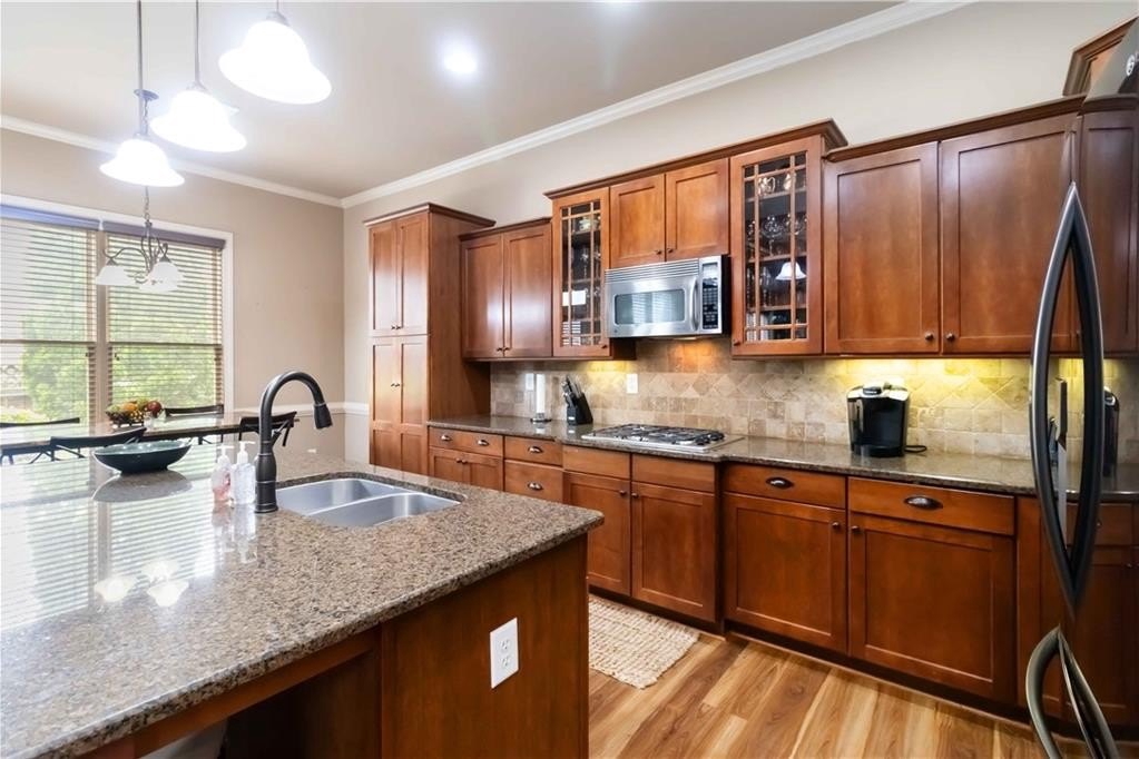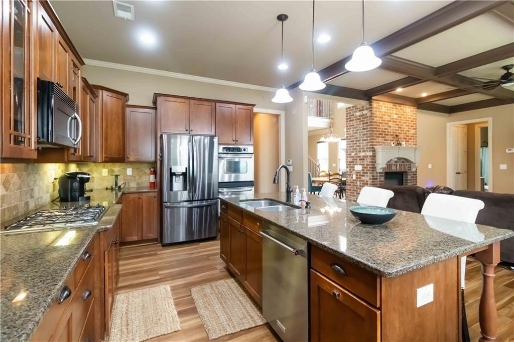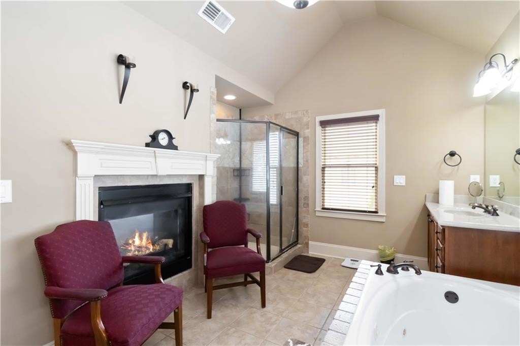 **BACK ON MARKET/NO FAULT TO SELLER. HOME APPRAISED WELL ABOVE LIST PRICE!!! Model home floor plan gives this gorgeous, unique Craftsman Home Luxury Features! Step into timeless elegance with this stunning Craftsman-style residence, showcasing exceptional craftsmanship. A charming front veranda welcomes you into a two-story foyer, setting the stage for the grandeur that follows. The main level boasts a guest bedroom, new floors and soaring tall doors that evoke a storybook feel, adding warmth and charm. Designed for both comfort and sophistication, the open-concept living space features vaulted ceilings, a coffered ceiling sitting area, and dual fireplaces that grace both the living and dining areas, as well as the expansive primary suite and its spa-like bathroom. The gourmet kitchen is a chef's dream with granite countertops, an abundance of custom wooden cabinetry, stainless steel appliances, including a double wall oven, and a spacious walk-in pantry. Jack and Jill connect two nice-sized bedrooms and offer a roomy loft that allows the perfect retreat for a second TV area or reading nook. The walk-in laundry room, oversized garage with extra storage, and double patios enhance everyday convenience. Outside, enjoy the fully fenced backyard with a sprinkler system ideal for hosting or relaxing, and take full advantage of the community amenities, including a sparkling swimming pool, playground, and a beautiful fishing lake that invites peaceful weekend escapes. The owners have already taken care of the major updates for you, including a brand-new HVAC unit, a new water heater, and a new roof, offering peace of mind and added value. From its dramatic architectural features to its thoughtful design, this home offers luxury living with Craftsman charm in a vibrant and charming neighborhood.