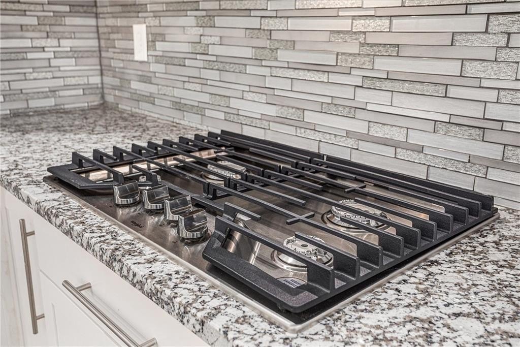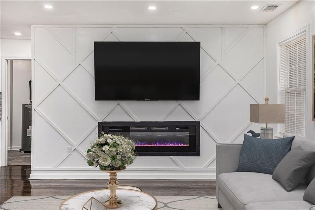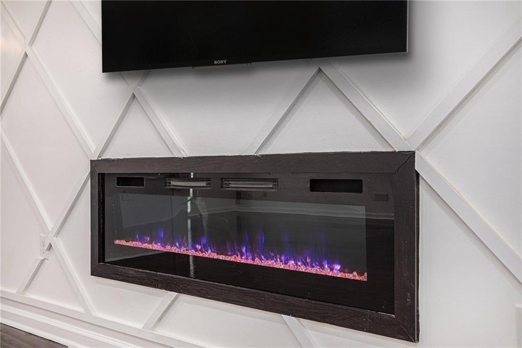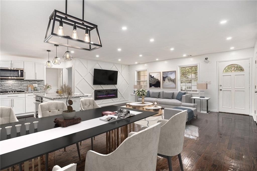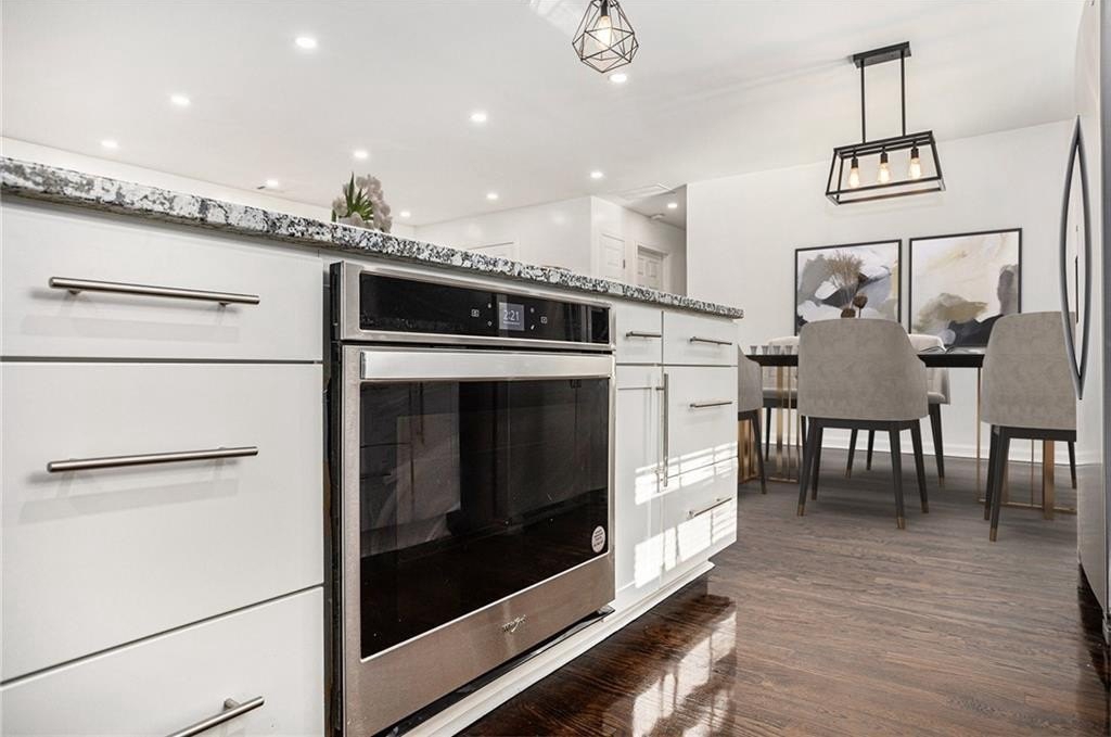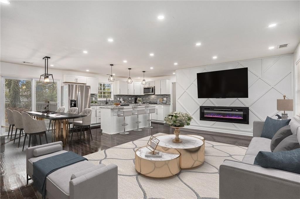 Step into a bright open-concept layout featuring hardwood floors, a cozy fireplace, accent walls, and recessed lighting. The designer kitchen offers granite counters, stainless steel appliances, custom cabinetry, and a large island perfect for hosting.