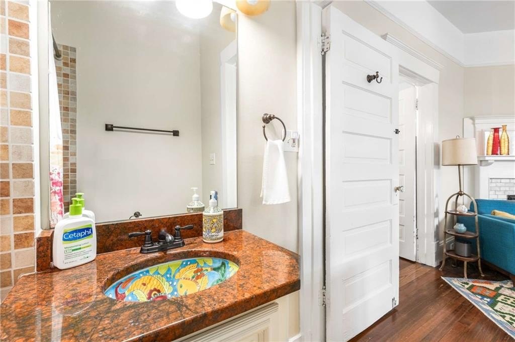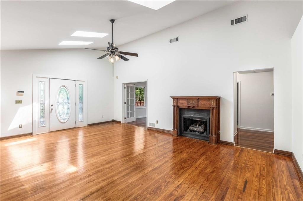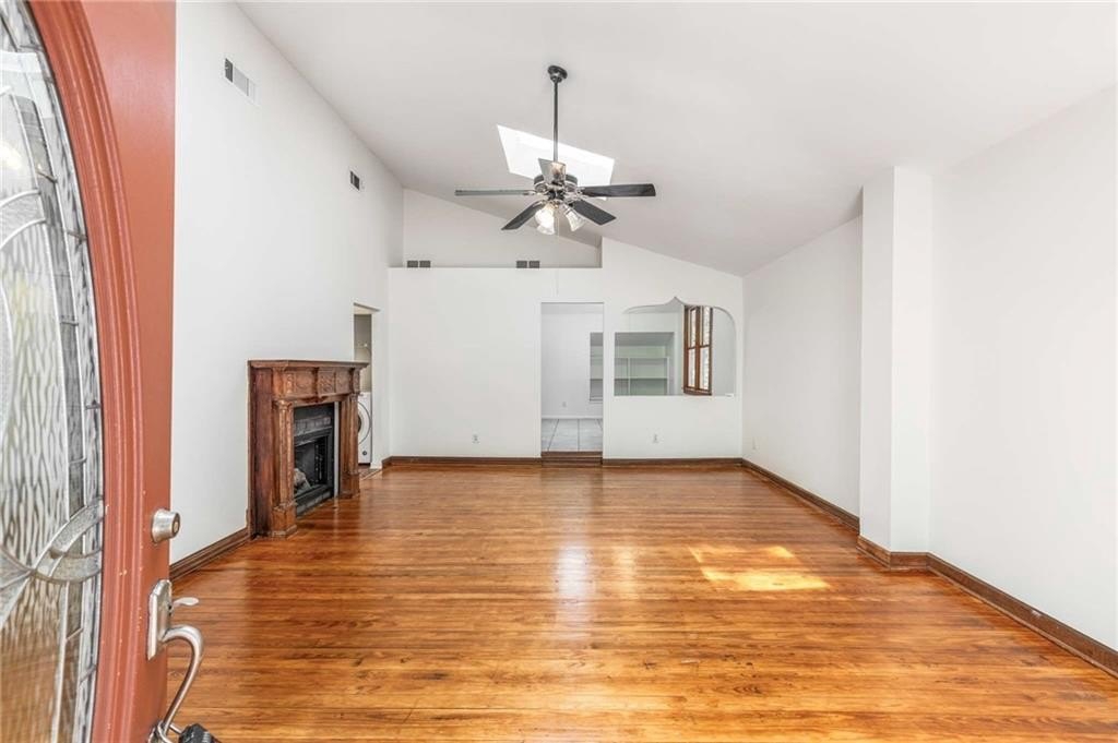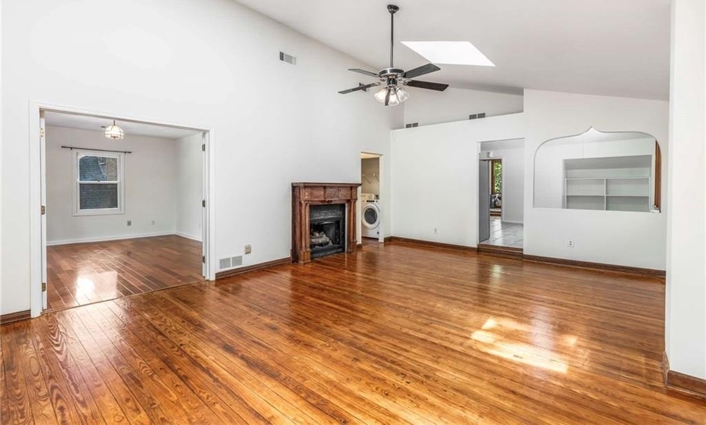 From the street, the home’s inviting front porch, classic columns, and vibrant trim showcase its historic character. Inside, you’ll find soaring ceilings, abundant natural light from skylights, and gleaming hardwood floors that bring warmth to the living spaces. Original details like the ornate fireplace mantels pair beautifully with contemporary finishes, creating a balance of old and new.